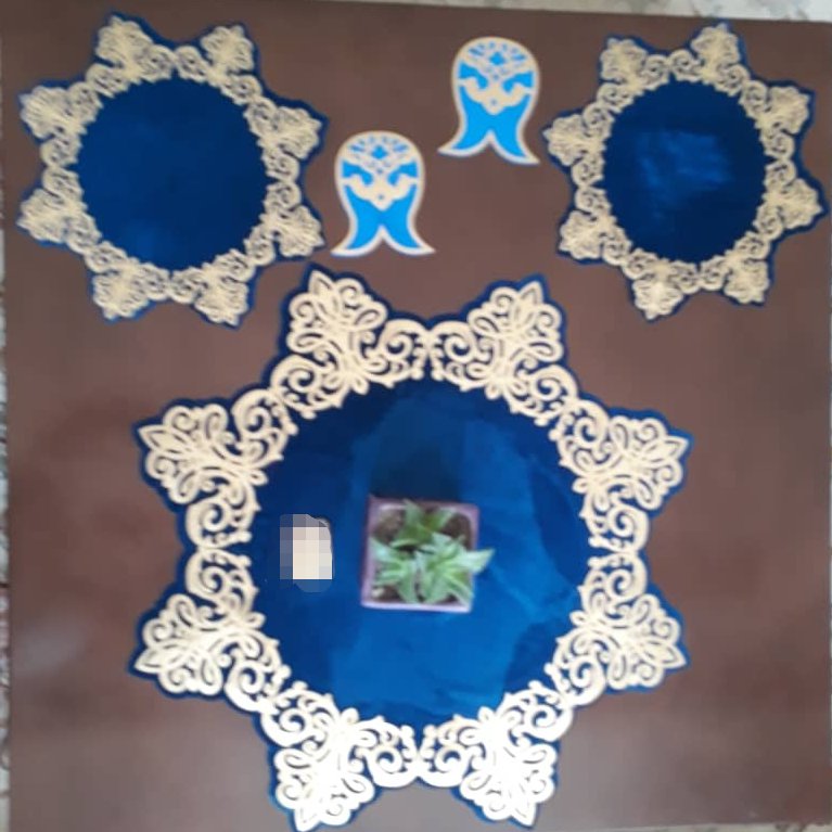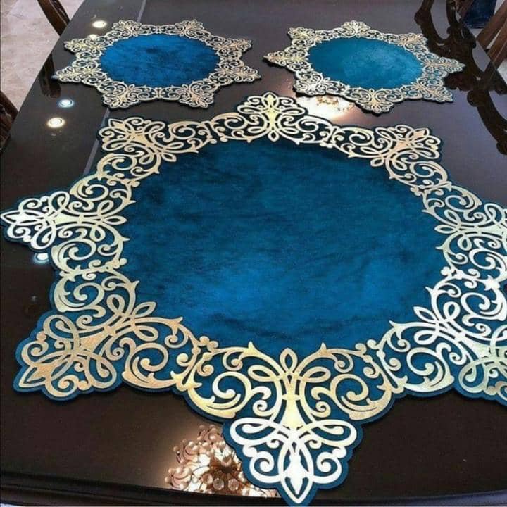 رومیزی گرد رنگ ابی جنس مخمل دالبر دورش چرم مصنوعی طلایی با زیر بشقابی وزیر لیوانی طرح الاله
