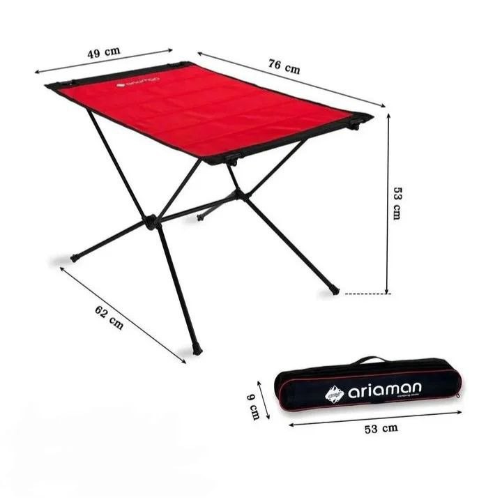 میز تاشو کمپینگ برند اریامن استفاده از میز در طبیعت گردی و سفر از ملزومات و نیازهای ماجراجوییهای ماست ولی همیشه ابعاد و اندازه ای که از ماشین یا کوله پشتی اشغال میکند به لزوم استفاده از آن ارجحیت دارد میز سفری آریامن با ابعاد بسیار کوچک و مکانیزم تاشو لوله های در هم رونده با مقاومت بالا قطعات پلاستیکی فوق العاده مستحکم و پارچه رویی قابل استفاده دو طرفه از جنس نانو ضدآب و ضدسایش ساخته شده است تا نیاز یک همراه همیشگی و خوش سفر برای سفرها و ماجراجویی ها در یک کیف جمع و جور باشد و لذت آسایش در طبیعت را دوچندان کند. سایز پارچه رویی میز 49x76 سانتی متر با ارتفاع 50 سانتی متر می باشد و برای مقاومت بیشتر رویه میز از فتول گالوانیزه ضخیم داخل پارچه دوخته شده و پارچه رویی به صورت دو رو می باشد. رنگ پایه از بهترین مواد الکترواستاتیک بوده و قطعات پلاستیکی از نوع مواد درجه یک الیاف دار استفاده شده است.