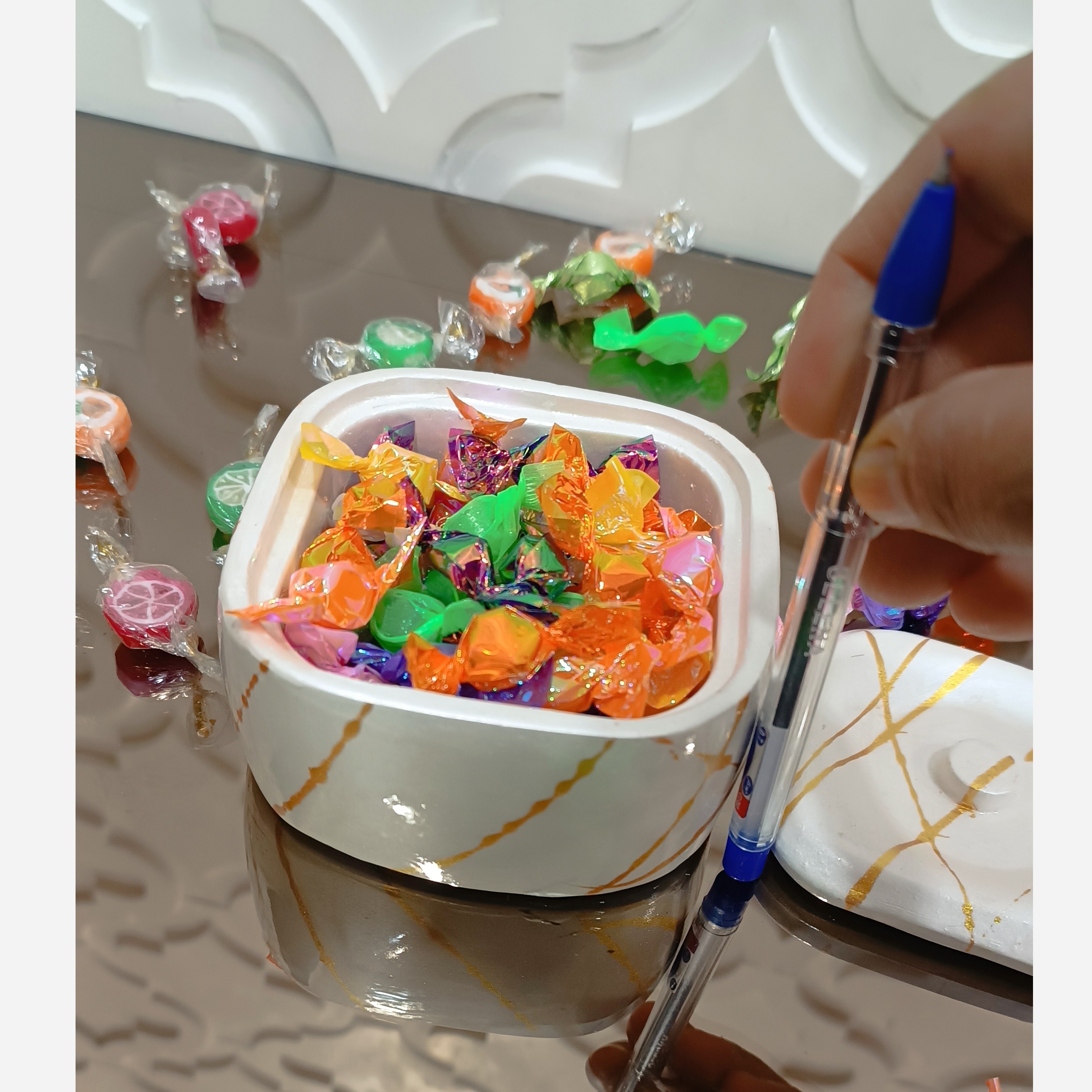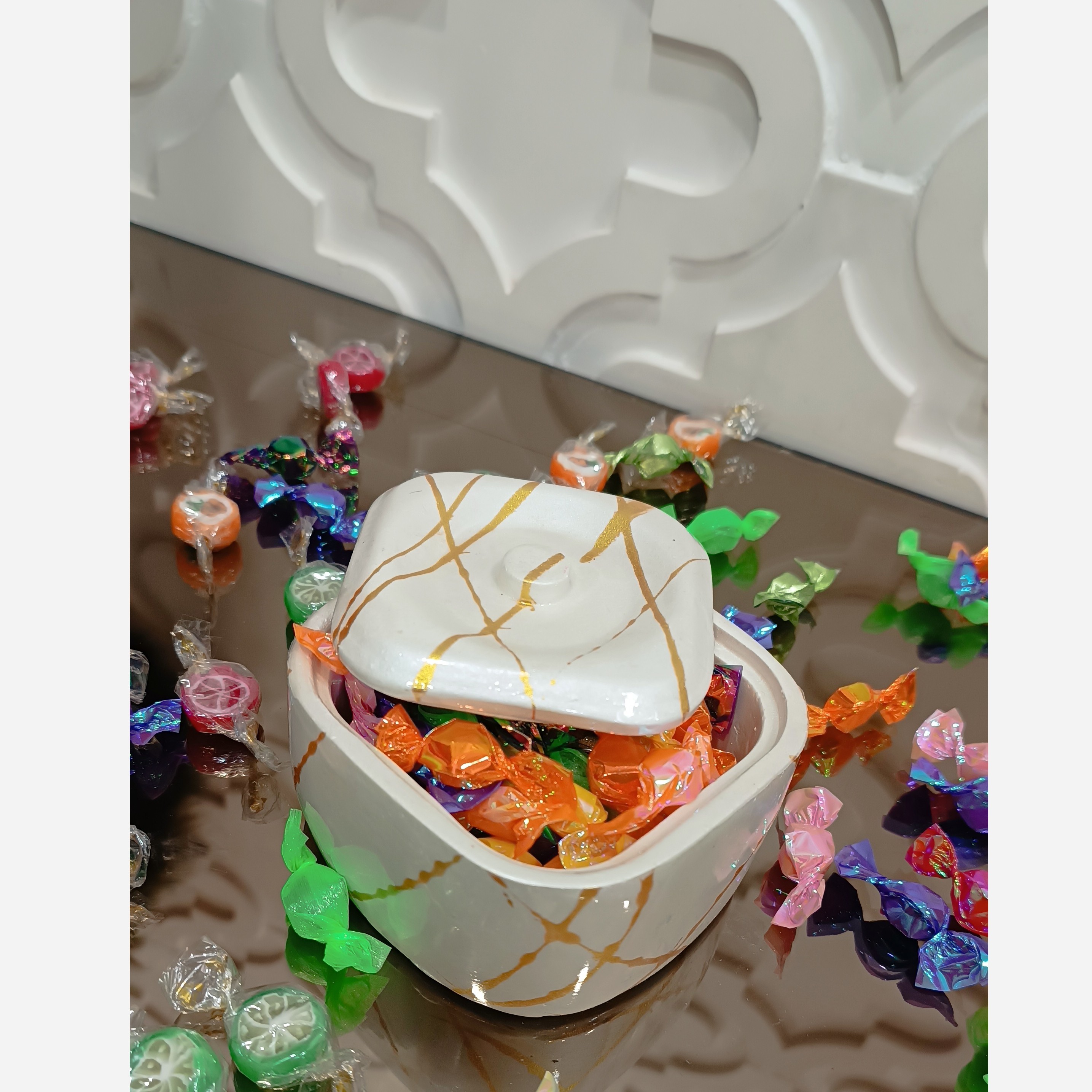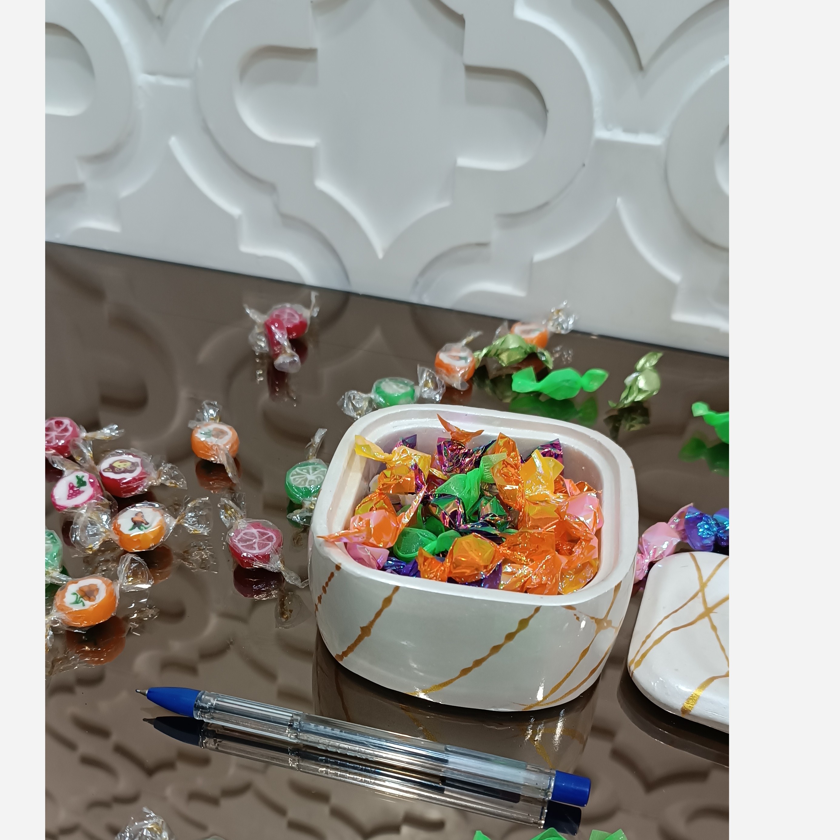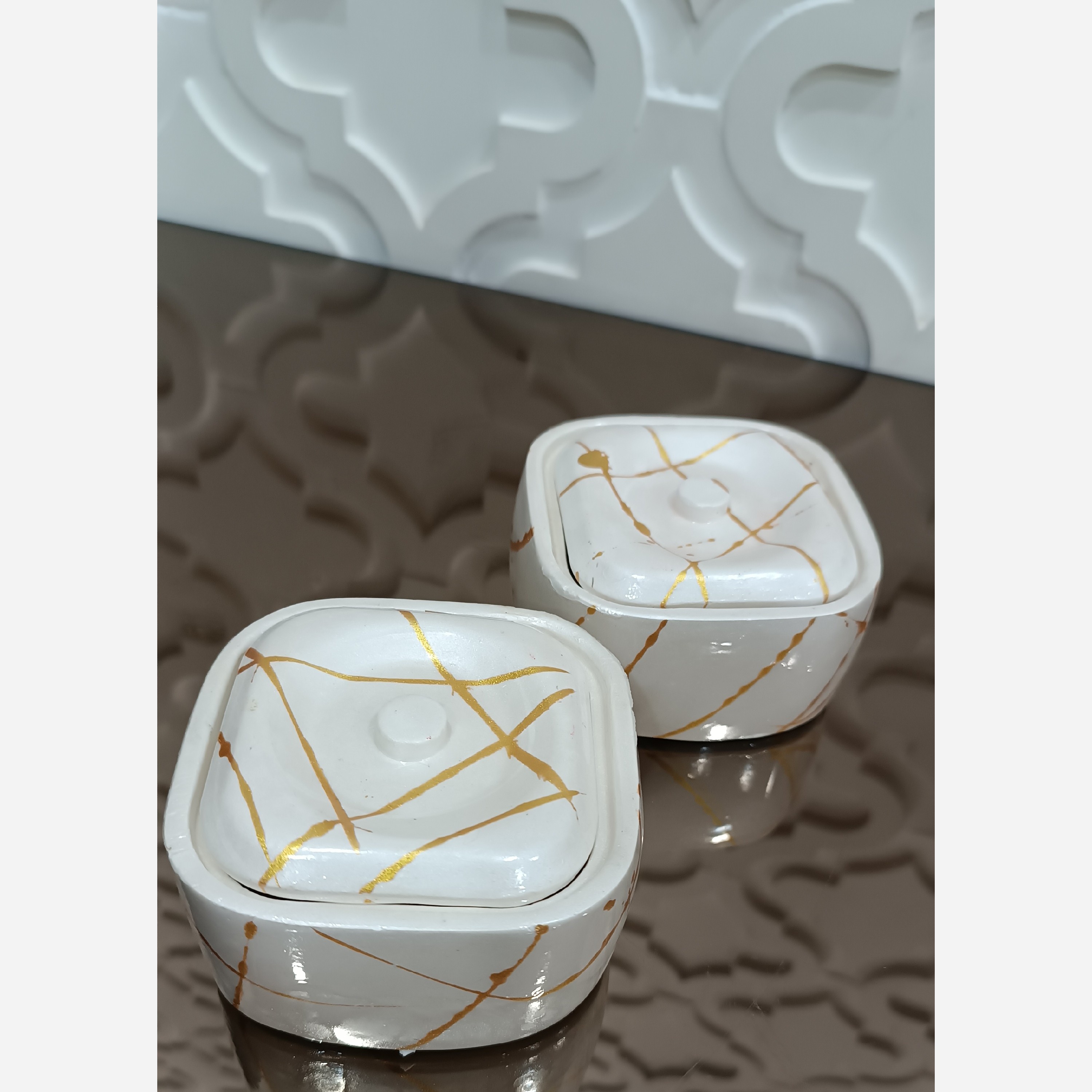 قندان دست ساز سنگ مصنوعی رنگ سفید و طلایی مربع شکل ارتفاع قندان 5سانت قطر دهانه 10سانت کاملا ضدآب و قابل شست و شو