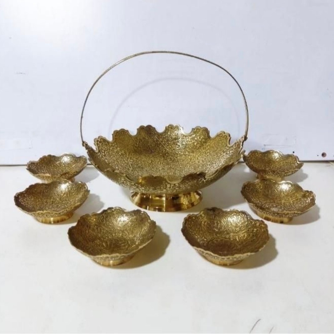 ست 7 عددی آجیل خوری تمام برنجی ساخت هندوستان مدل سبدی لبه قلعه دو رو کار شده با طرح طاووس با کیفیت بسیار بالا و ضخیم ساخت مناسب استفاده دائم و پذیرایی و قابل شستشو بدون تغيير رنگ