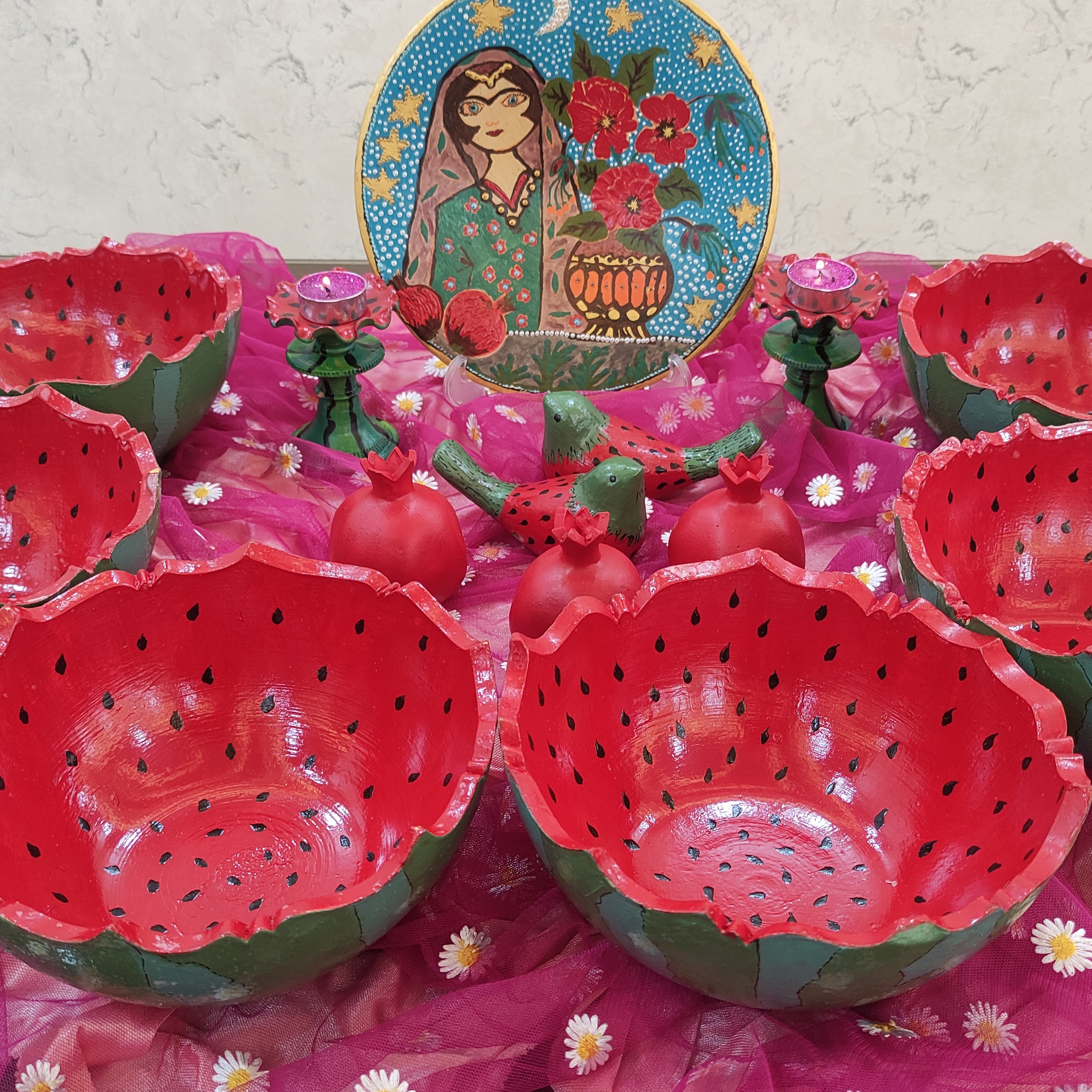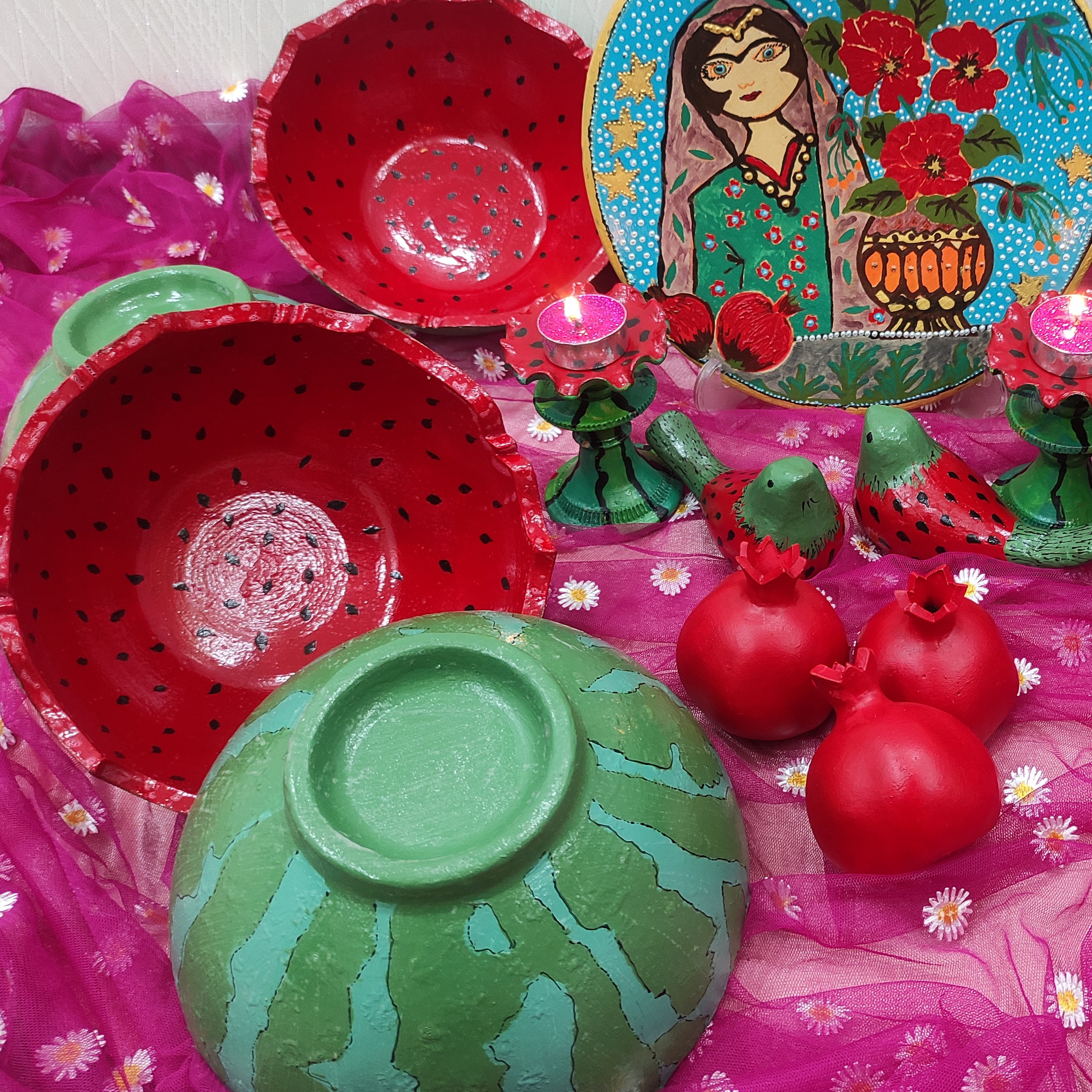 سفارش تهیه ظروف یلدایی سفالی با رنگ و یا پرشنگ با متریال مرغوب و برند ، سفال همدان پذیرفته میشود6عدد کاسه بزرگ قطر 23سانتی مدل هندوانه یی یلدا مناسب سفره شب چله