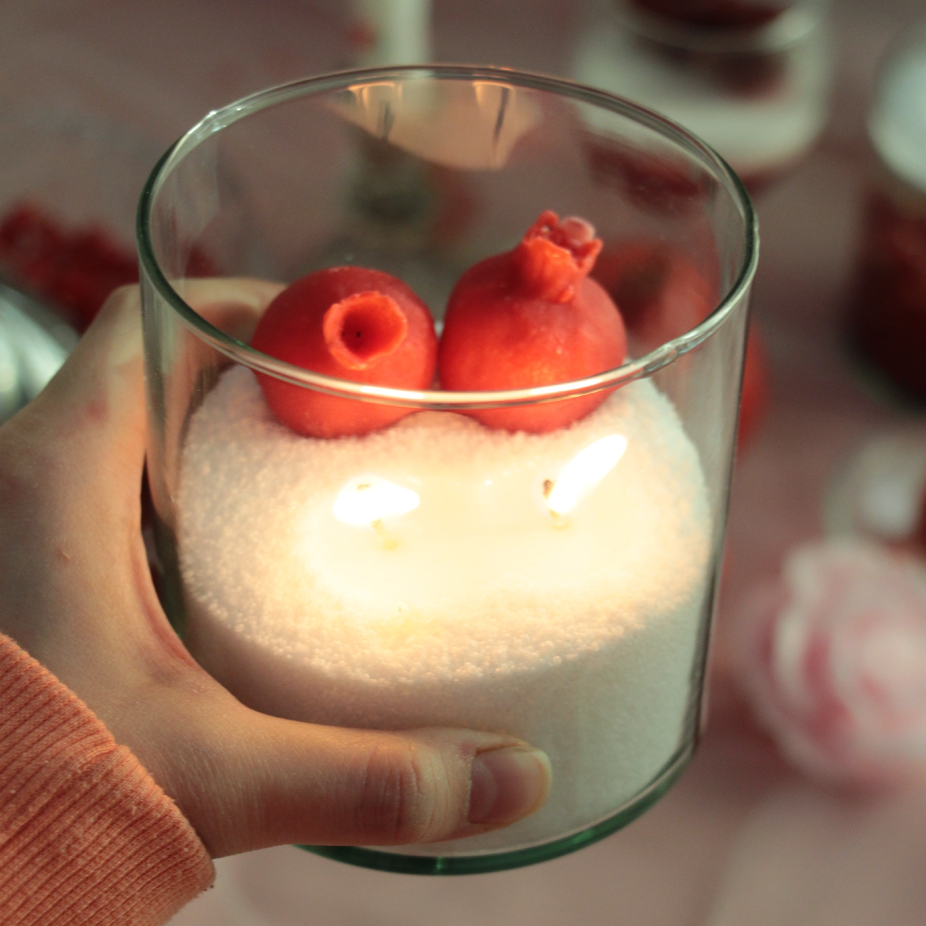 این پک شامل: شیشه به ارتفاع 10 و قطر 10 سانت پارافین پودری نیم کیلویی دو عدد انار مینیاتوری به همراه فیتیله رایگان