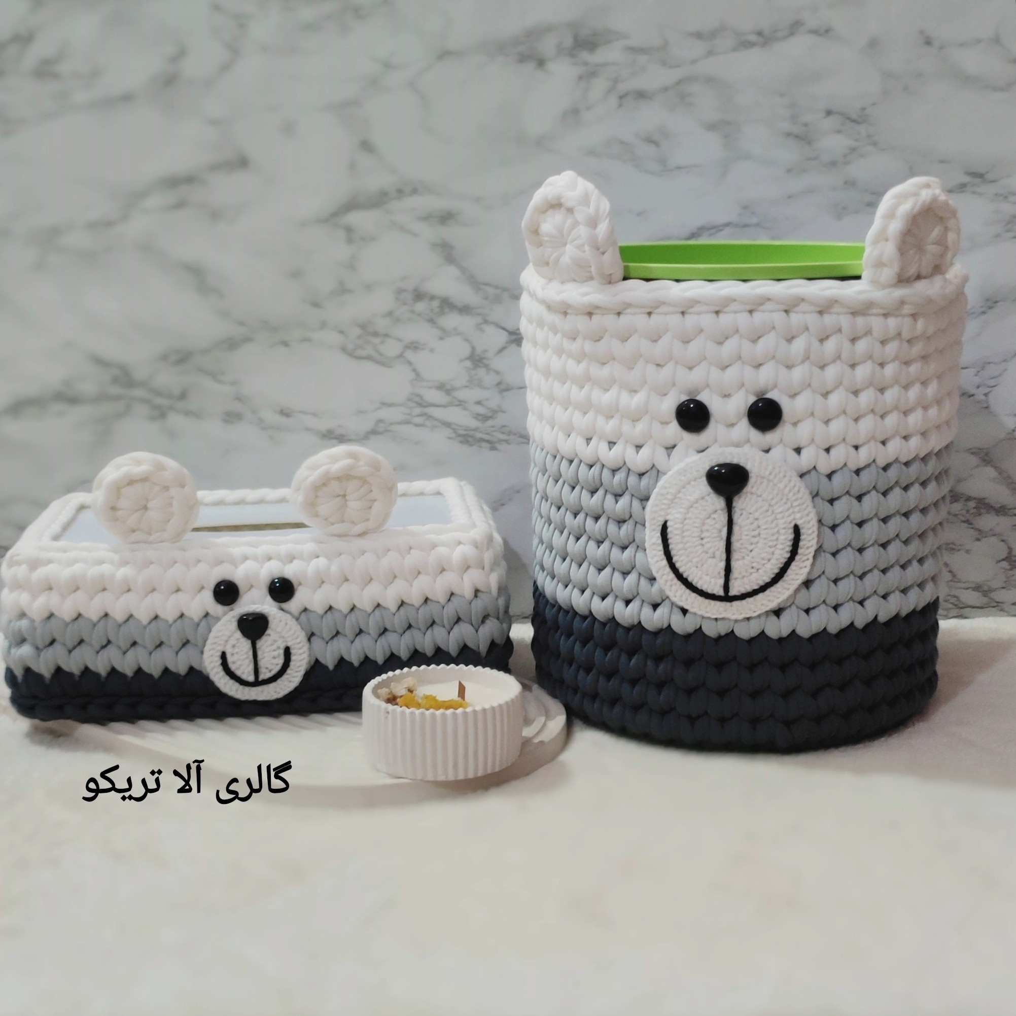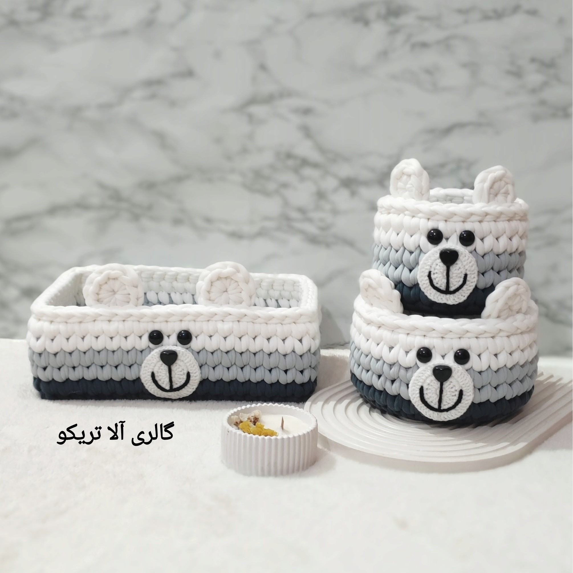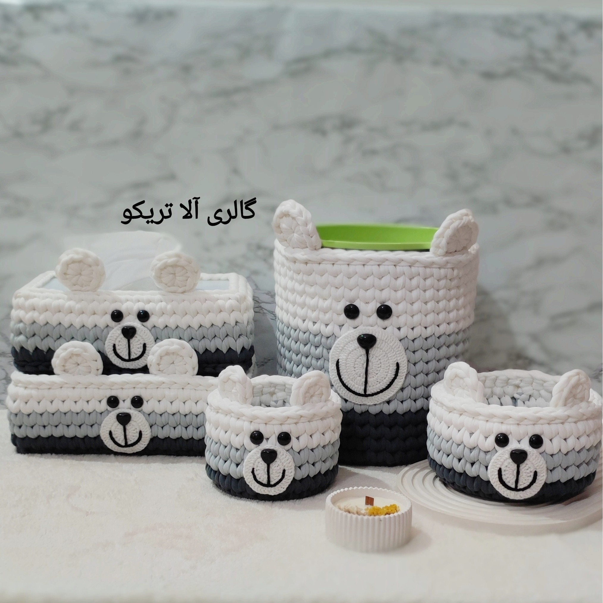 سبد تریکو ست 5 عددی نظم دهنده وسایل سیسمونی نوزاد و کودک مدل خرس تدی سه رنگ طوسی سفید گالری آلا تریکو مبلمونسرا مدل 292373