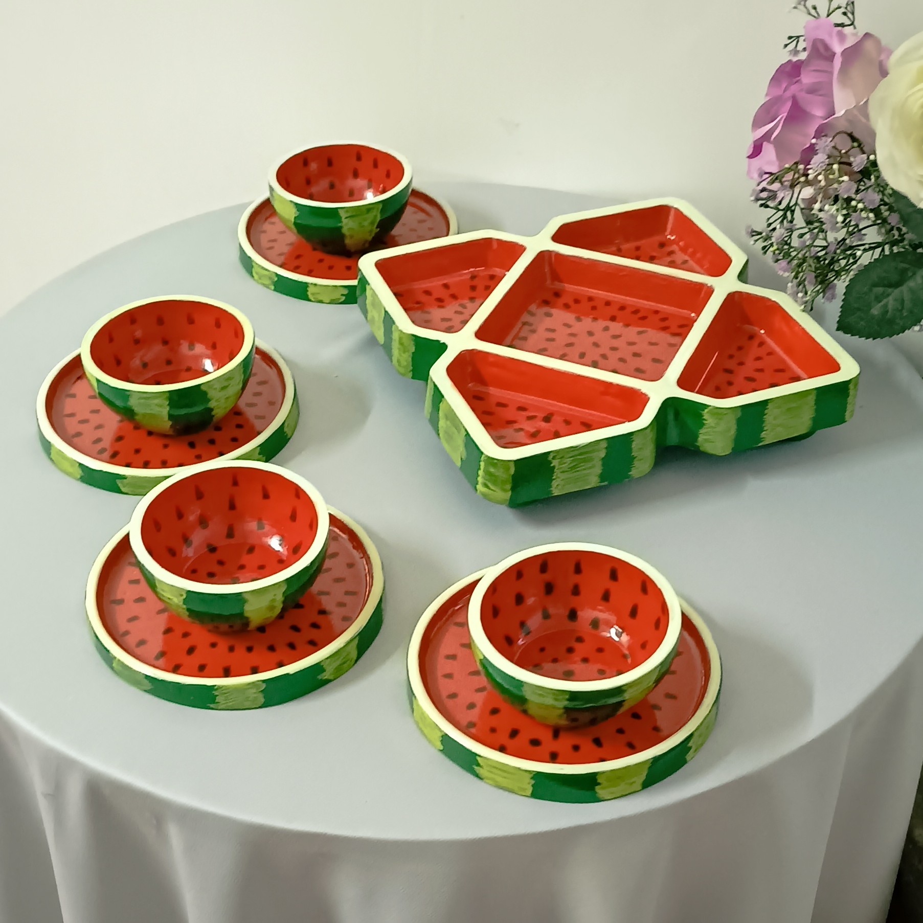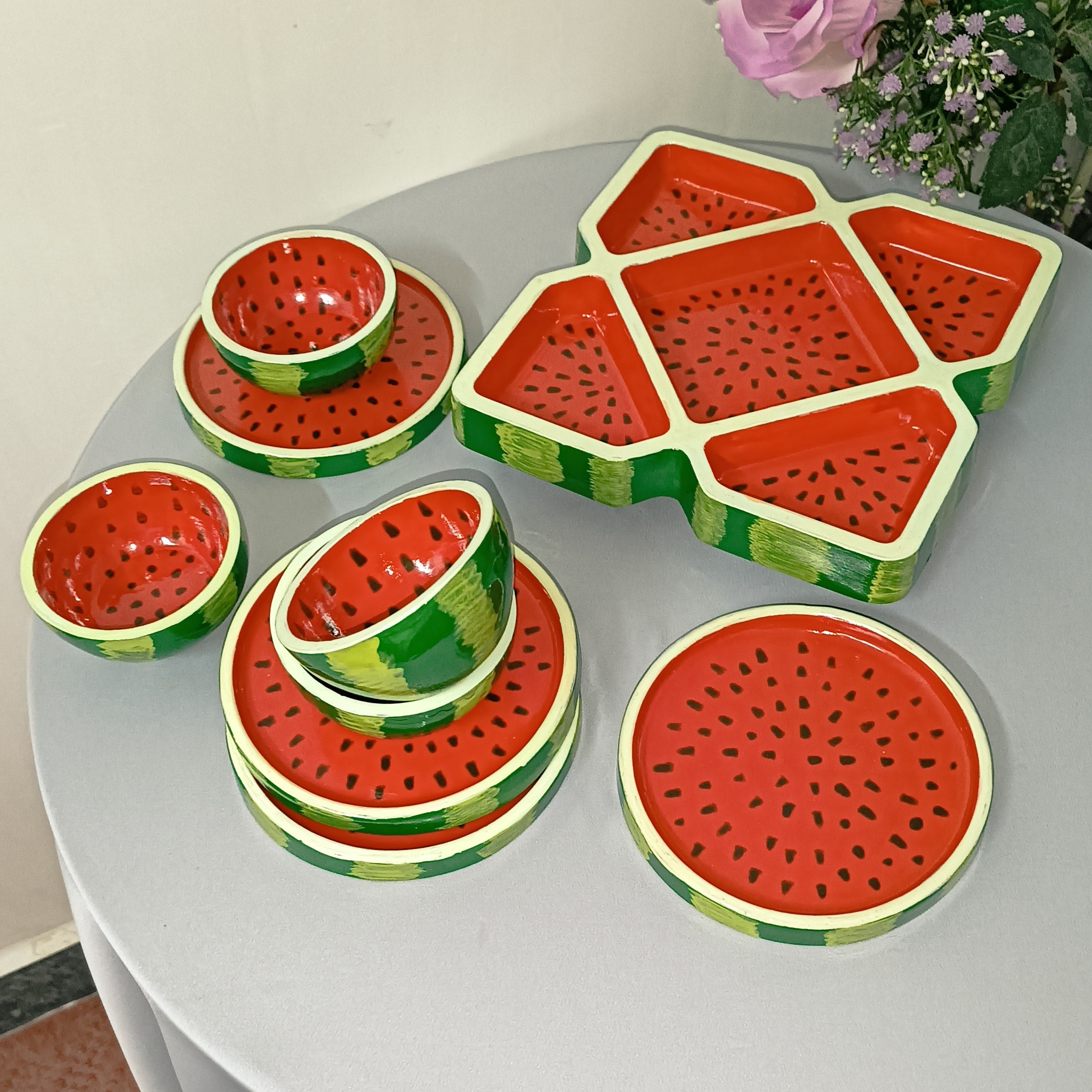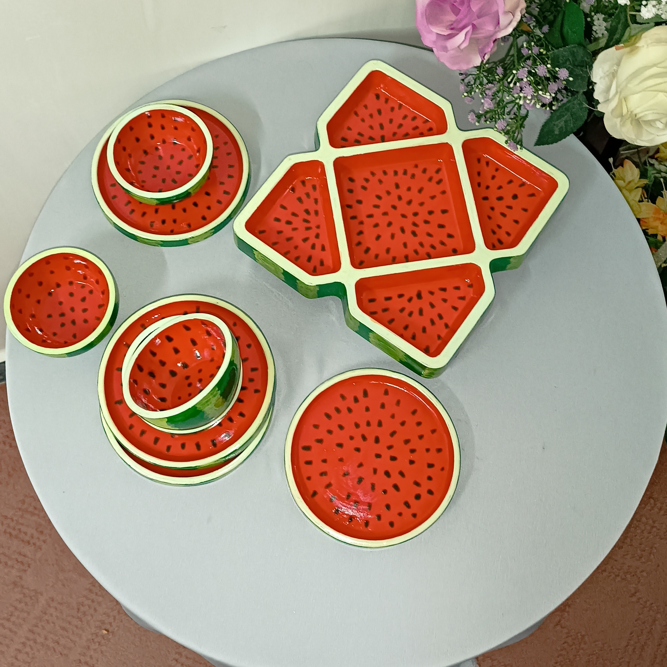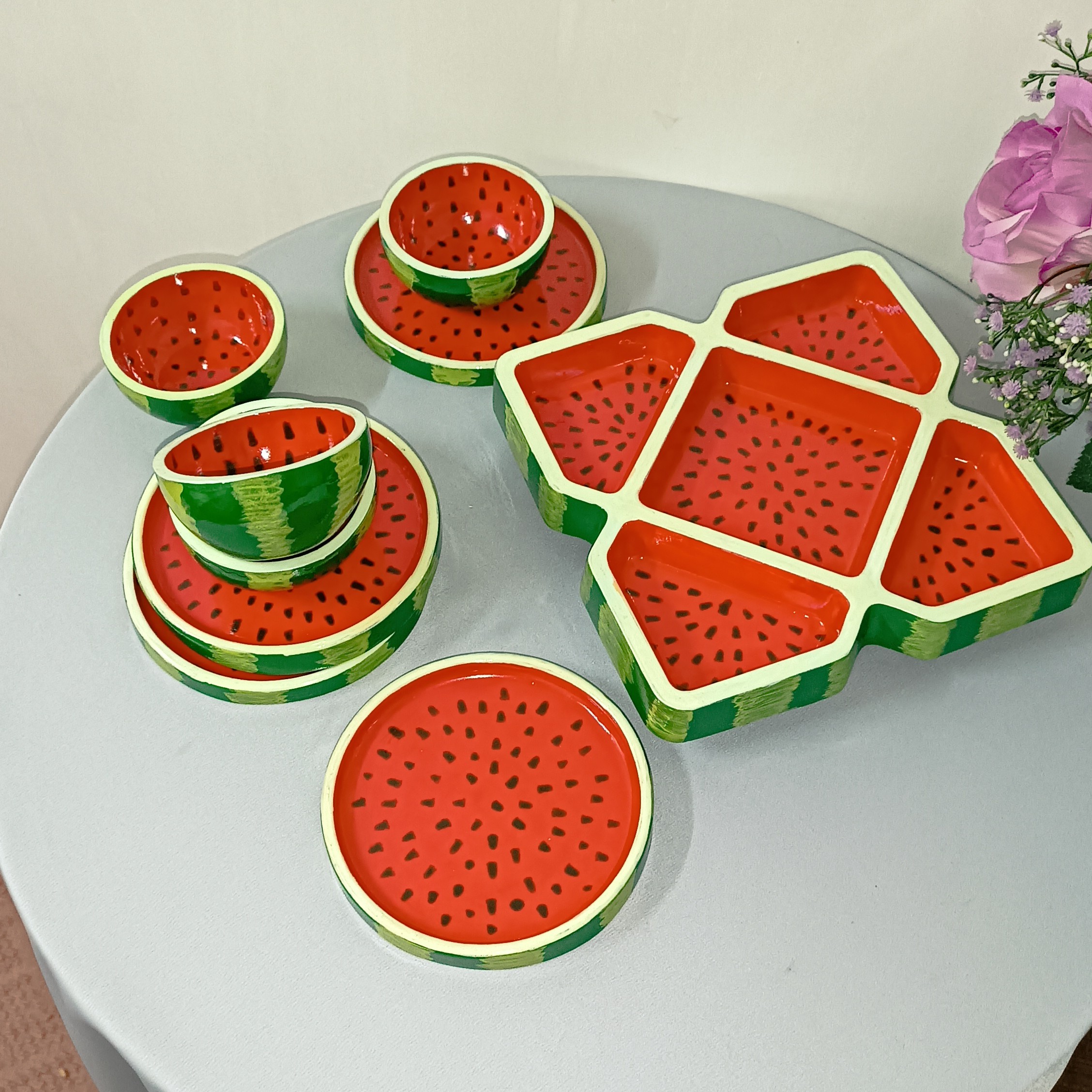 این ست شامل 1 اردو خوری 4 پیاله 4 پیشدستی قابل شستشو لعاب کاری شده ساخته شده با پودر هنری سنگ مصنوعی