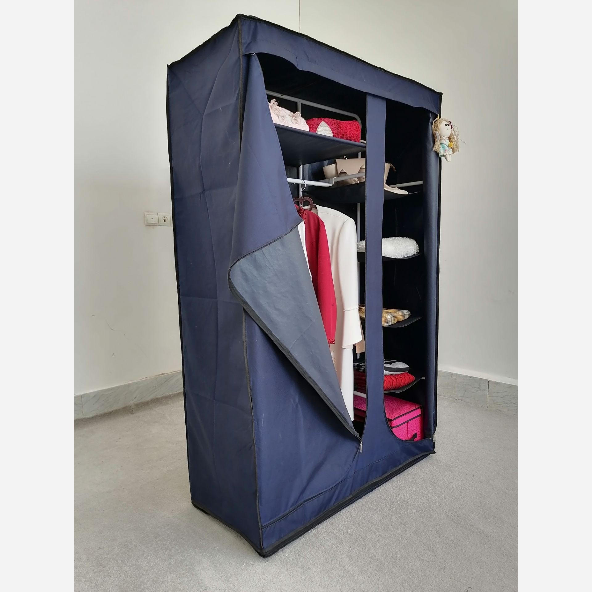 کمد پارچه ای با اسکلت تمام فلز تولید شده با بهترین متریال توسط بهترین تکنسینهای ایرانی ،قابلیت حمل و جابجایی آسان،استحکام و مقاومت بالا،بسیار مناسب و جادار برای قراردادن و آویزان کردن لباس ،کف این کمدها هم پوشیده و بسته است و هیچگونه گردوغباری وارد آن نمیشود.