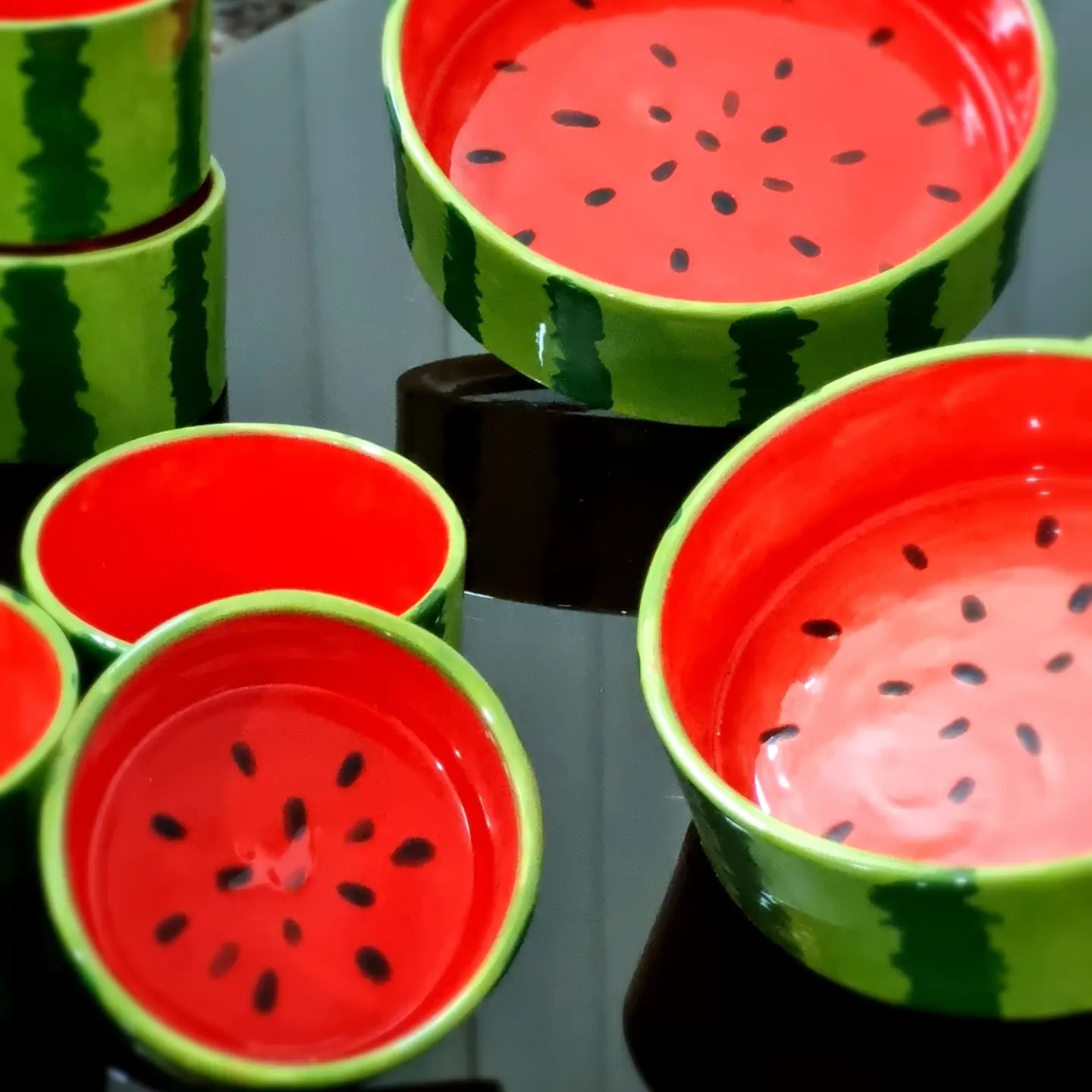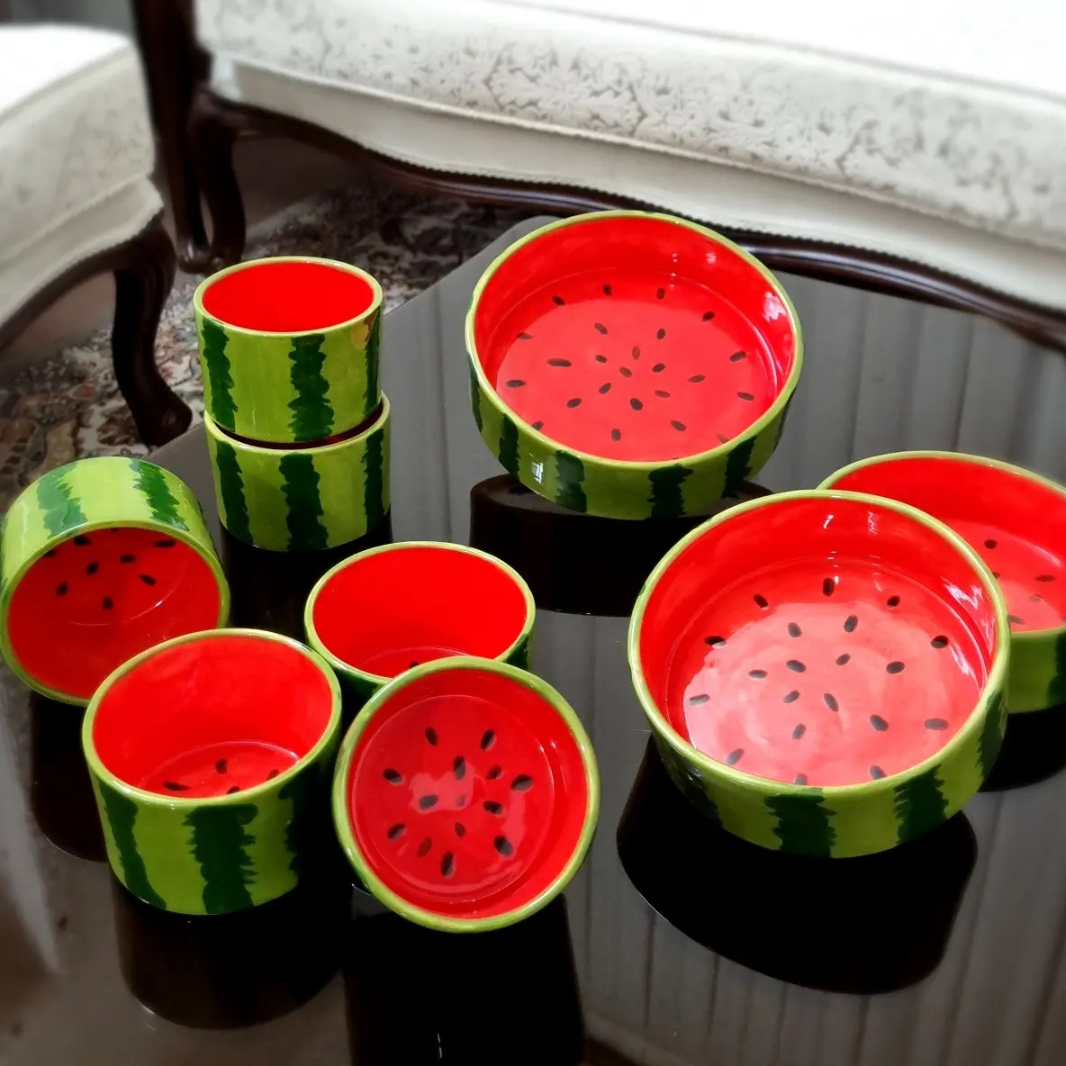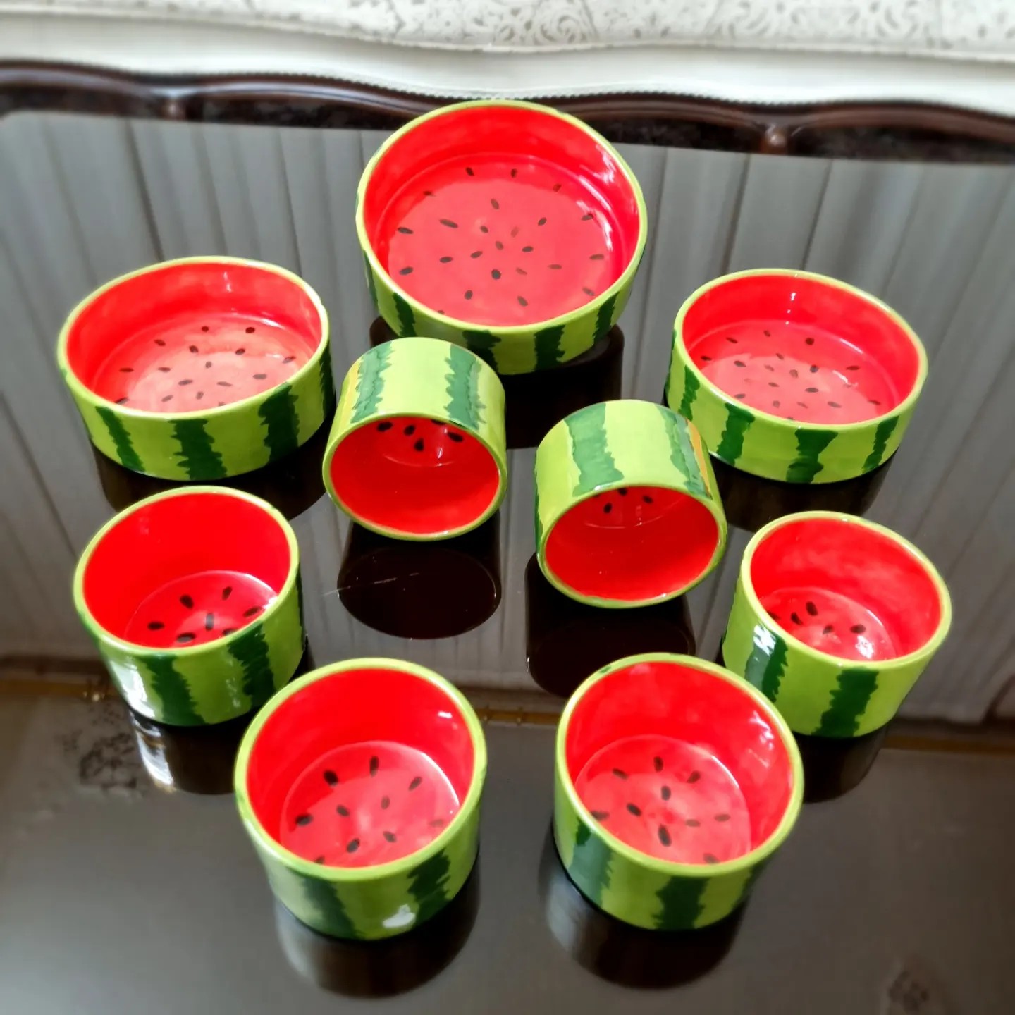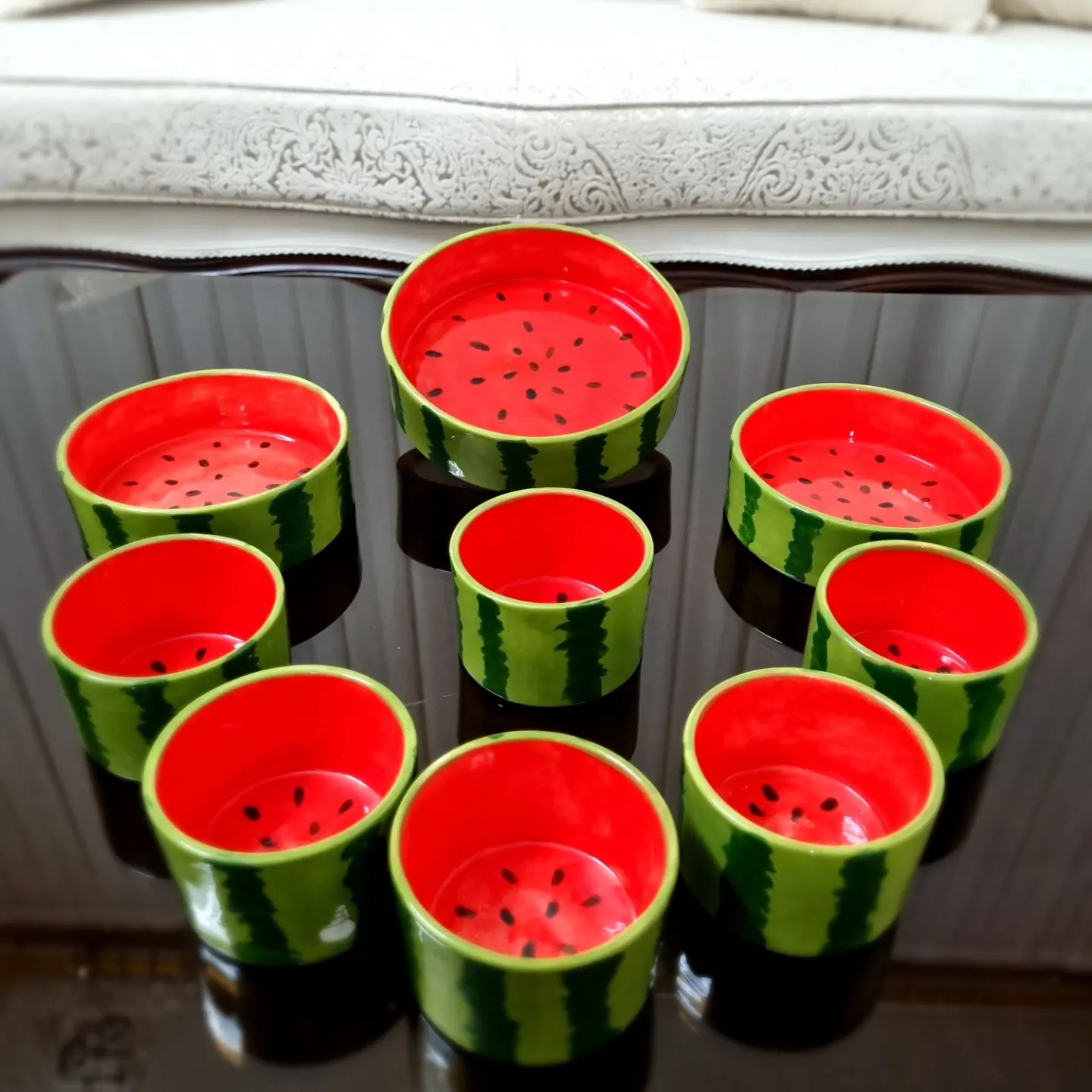ظروف سرامیکی یلدایی طرح هندوانه. مناسب آجیل و تنقلات.قابل شستشو و استفاده در ماکروفر می باشد.این ست شامل یک ظرف لبه دار قطر 16.دو کاسه لبه دار قطر 14 و 7 پیاله می باشد و قیمت کل ست549000می باشد