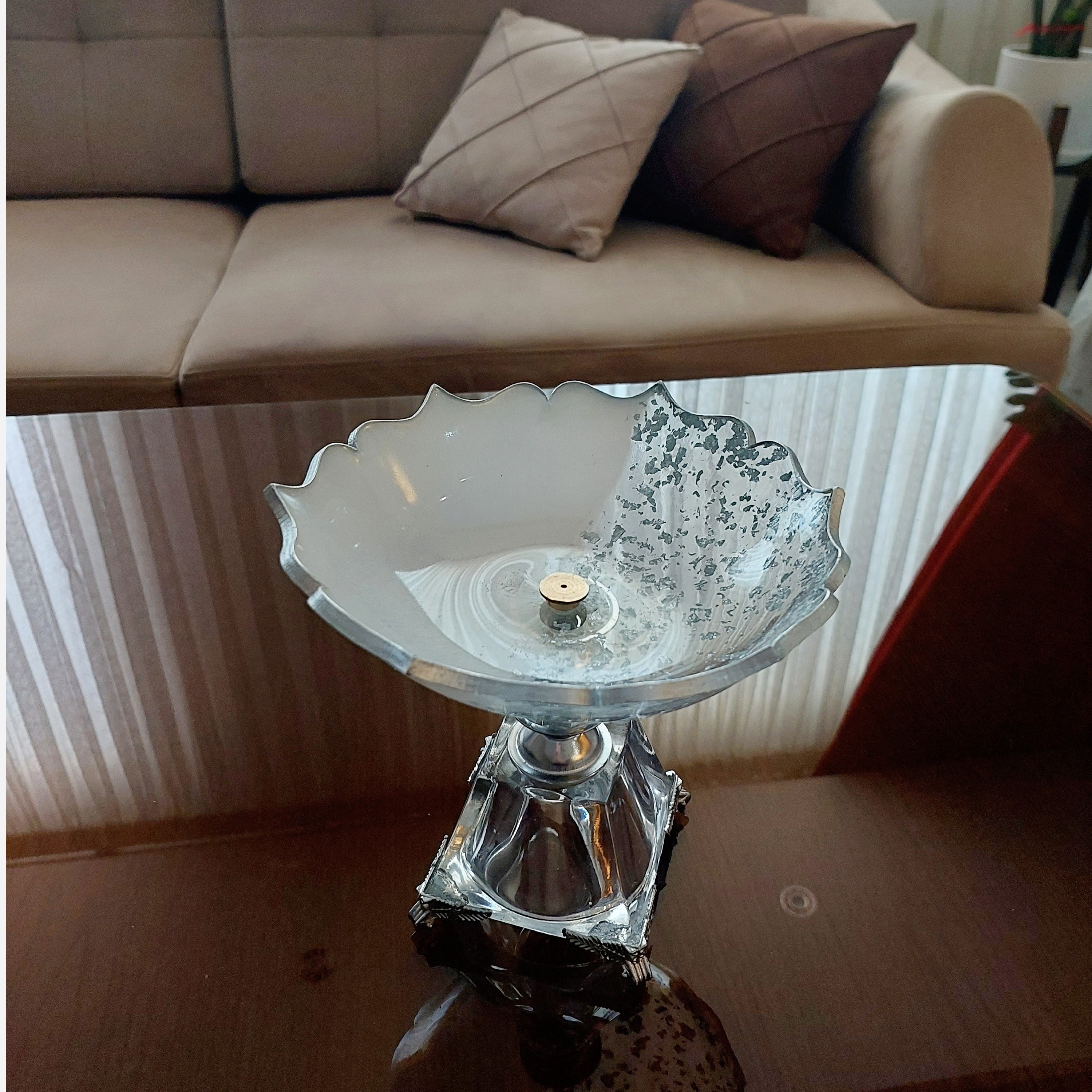 جنس رزین شفاف درجه یک. کار شده با ورق نقره، ابعاد 22 سانت، نشکن و سبک، پایه کریستالی و ارتفاع 14 سانت، مناسب شکلات خوری یا آجیل