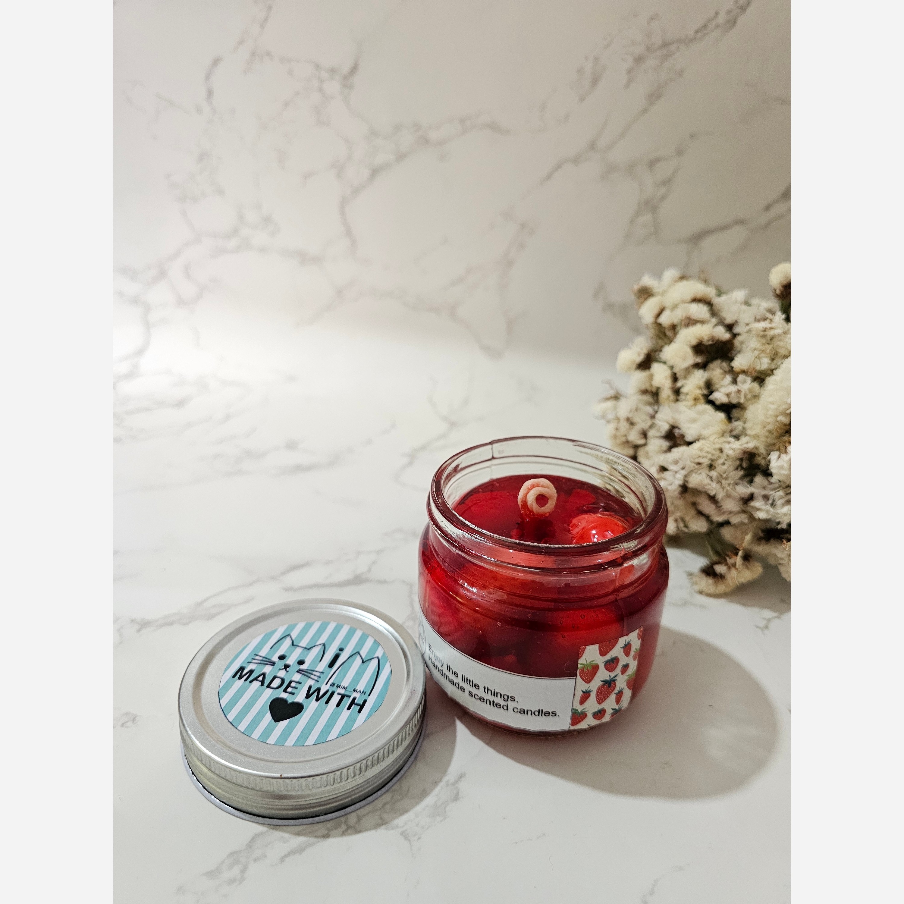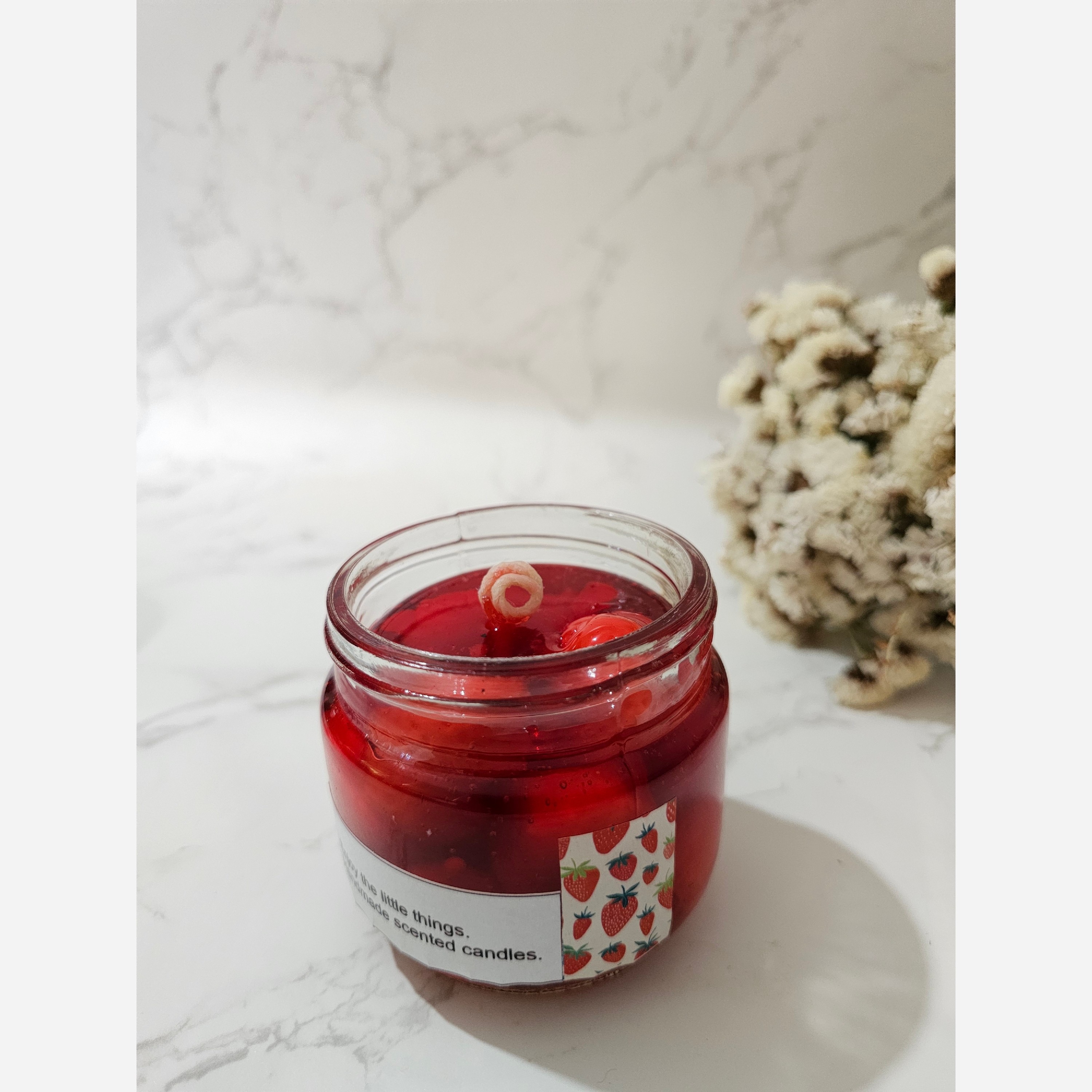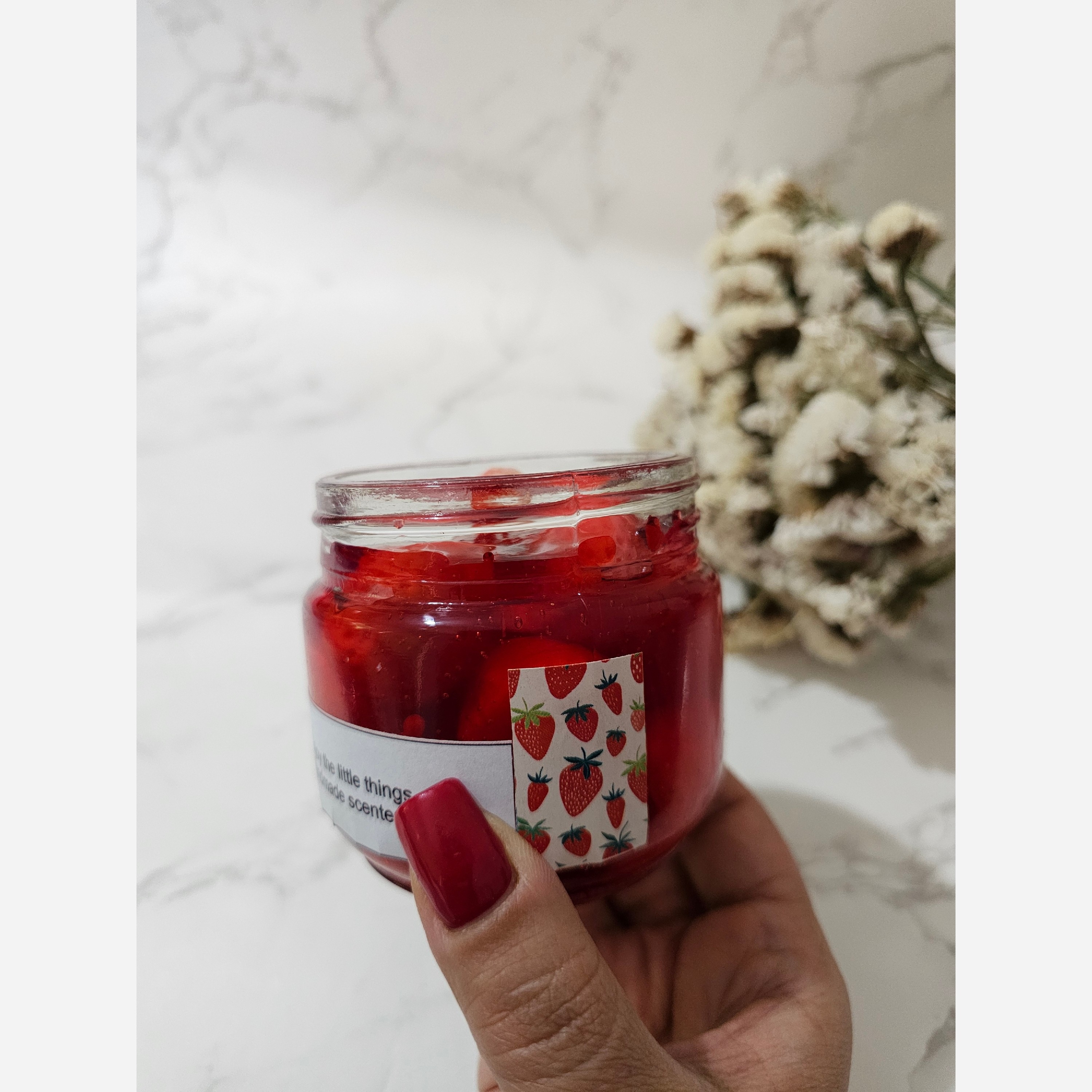 شمع جار مربای توت فرنگی معطر با اسانس توت فرنگی که رایحه نشاط آور و ماندگاری داره و محبوبیت بالایی داره و همچنین استشمام رایحه توت فرنگی ایمنی بدن رو بالا میبره و از دو نوع پارافین جامد و ژله ای تولید شده و بسیار رنگ جذابی داره ، لیبل خورده و رایحه روی شیشه مشخص هست که پکیجینگ کار رو تکمیل میکنه