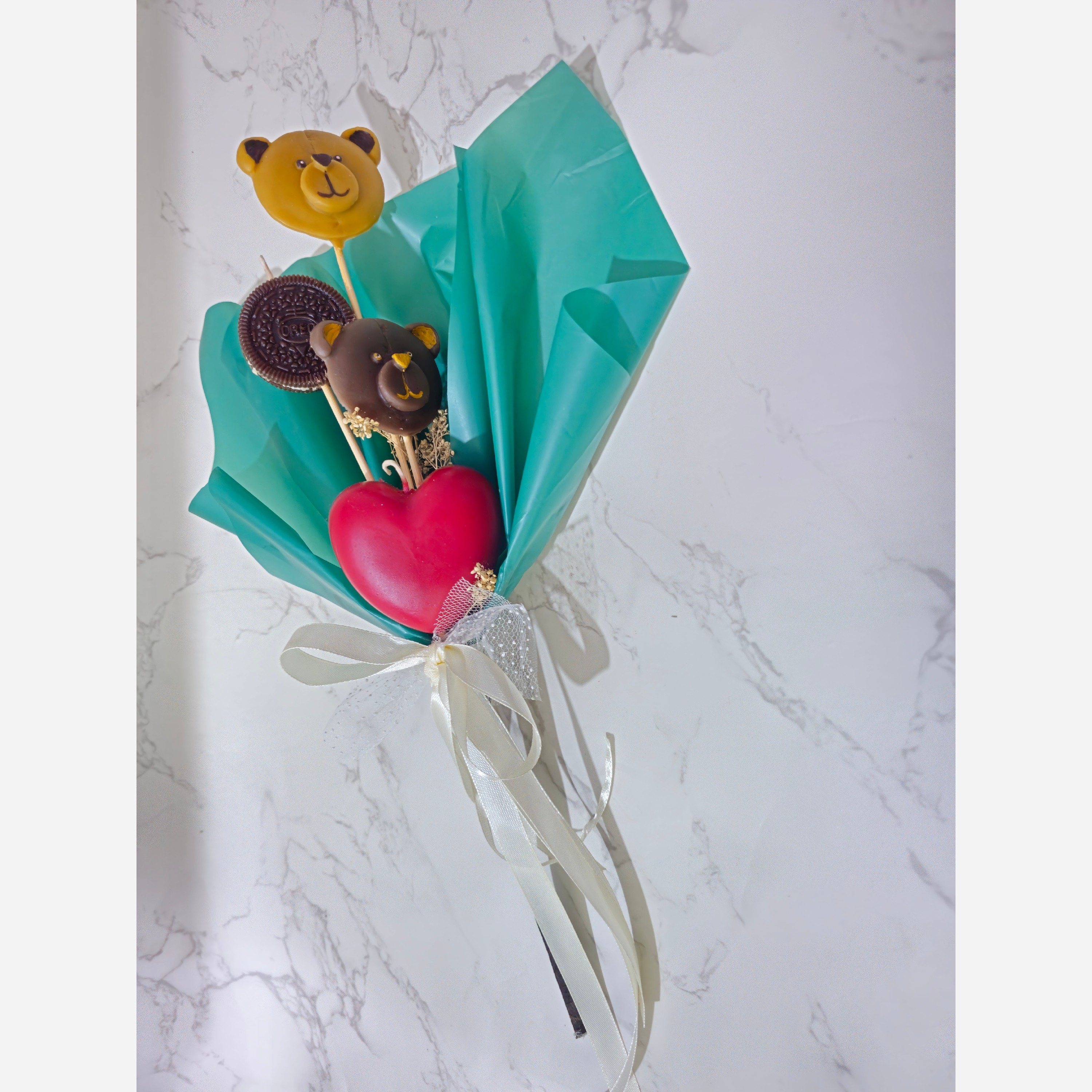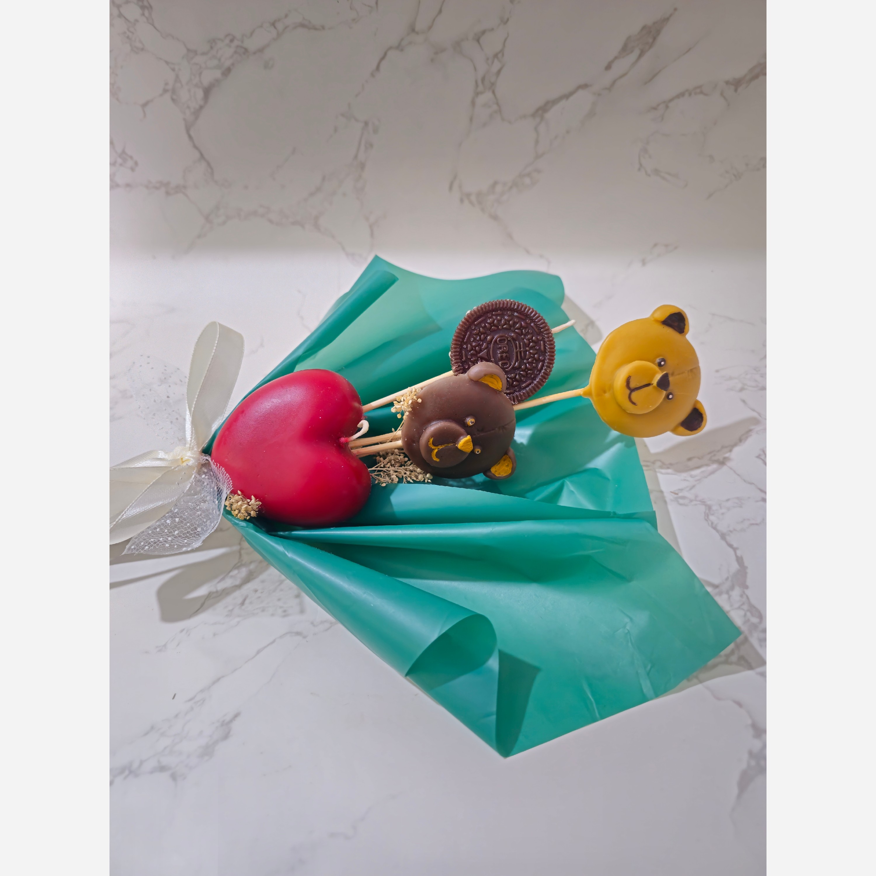 یه شمع قلب بزرگ قرمز یه شمع اورئو و به همراه دو عدد تدی پارافینی که مثل عکس دسته گل شده