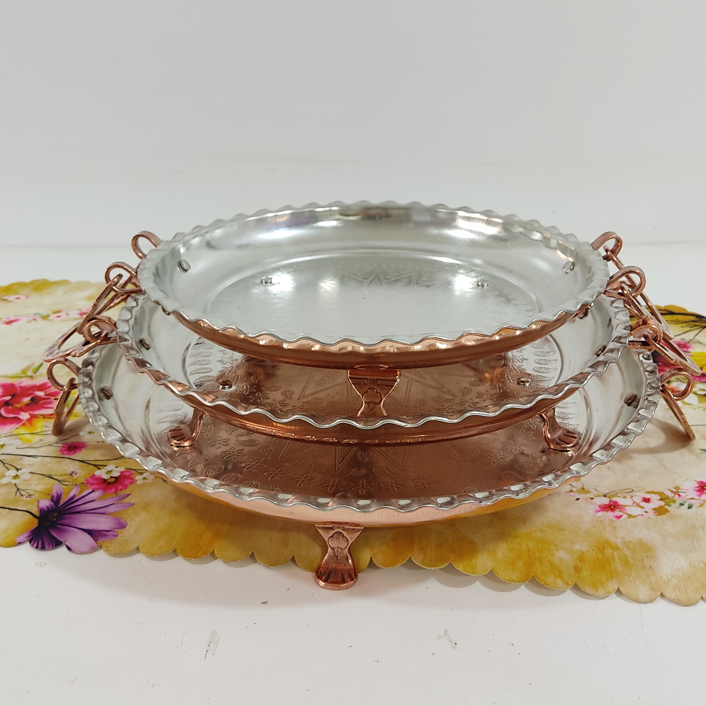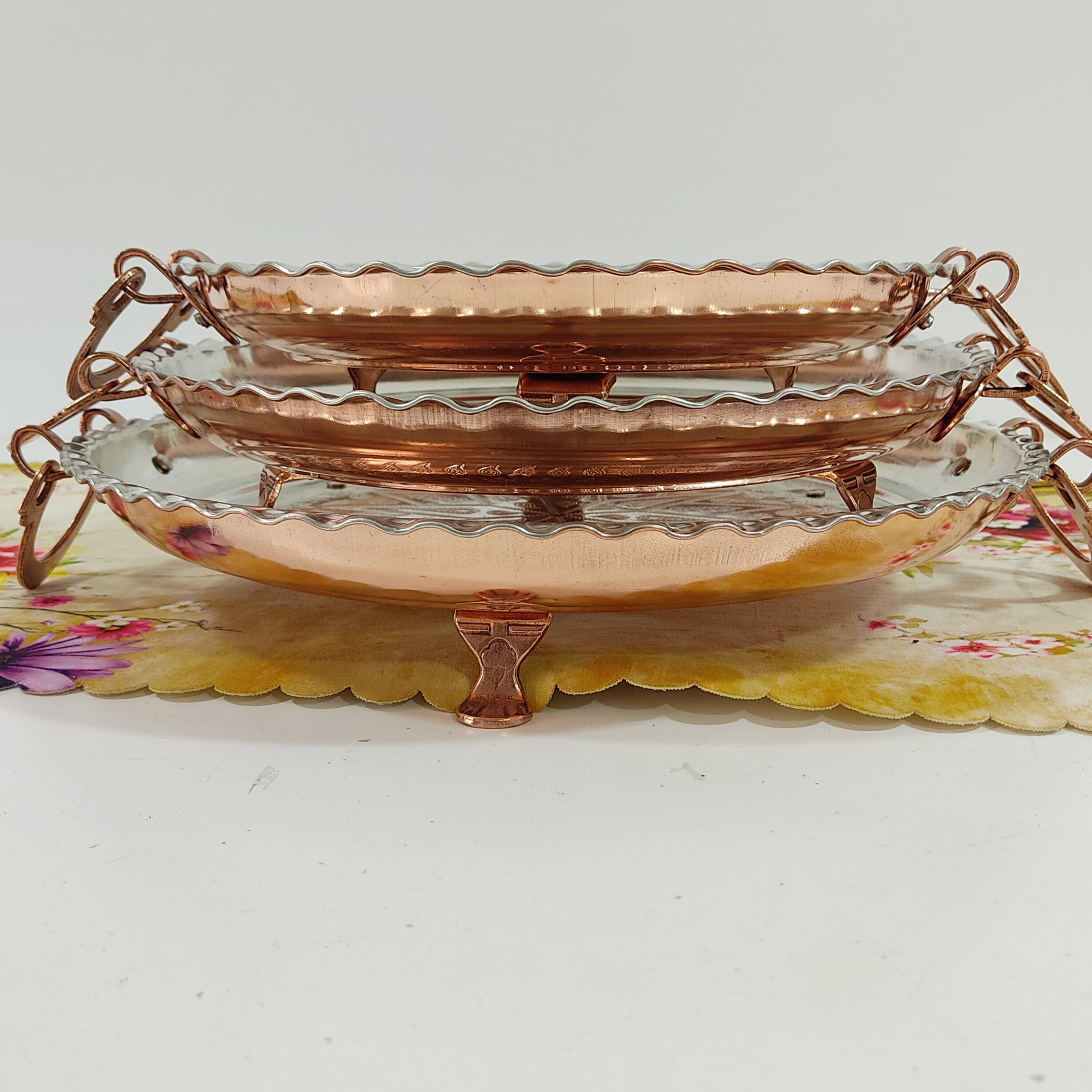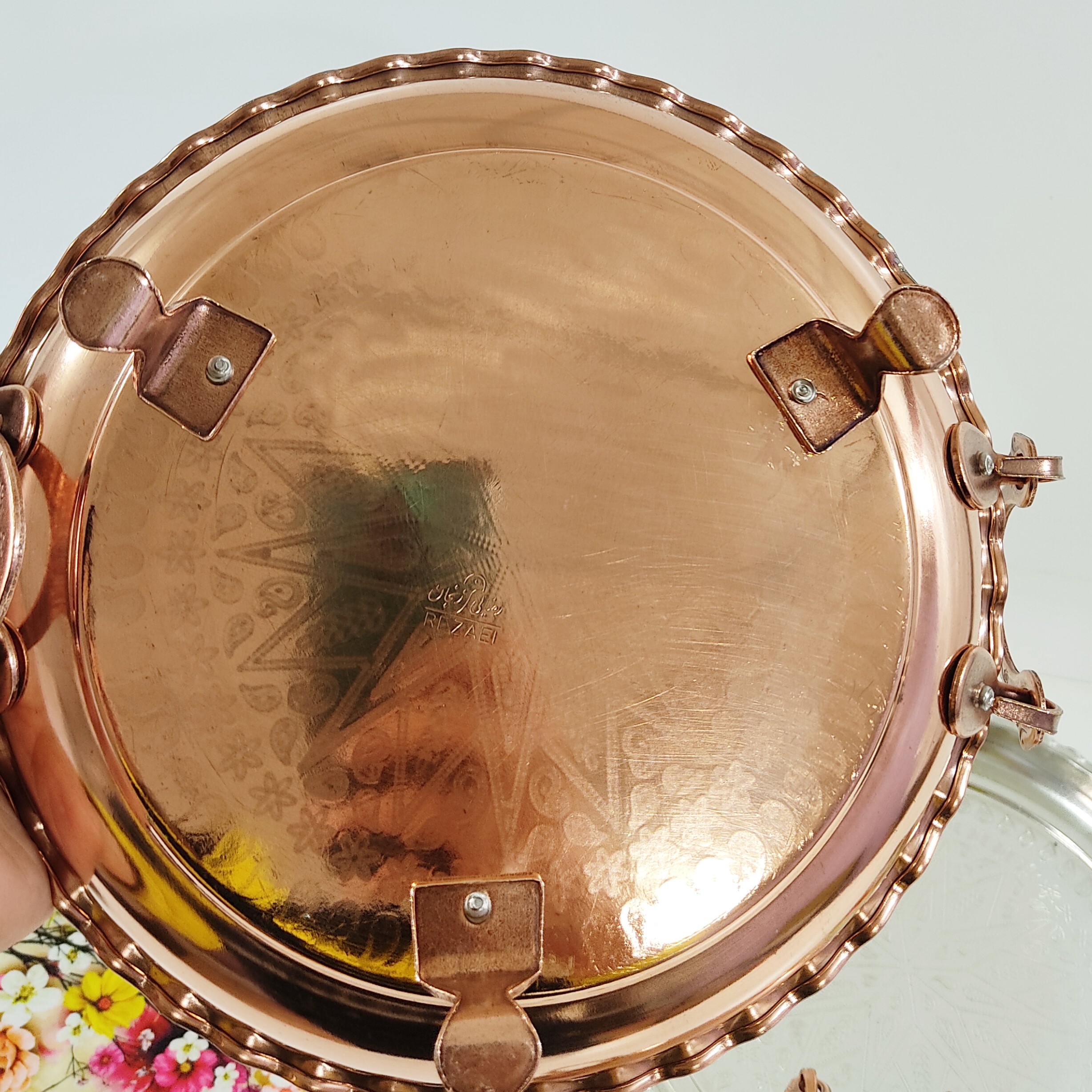 مجمع یا سینی دسته دار و پایه دار قطر 30 زنجان داخل سینی طرح برجسته ترمه داخل قلع کاری شده پشت کار نانو شده که رنگ ثابت بماند دسته و پایه ها از جنس مس دور چین دار