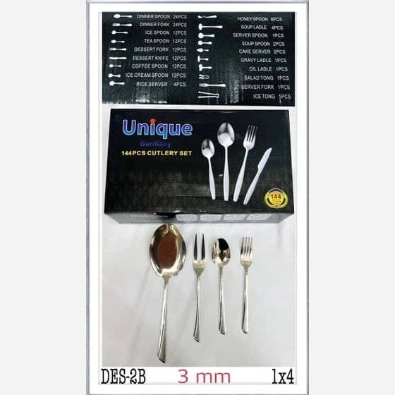 24 عدد قاشق و چنگال غذا خوری 12 عدد کارد میوه خوری، مربا خوری، شربت خوری، بستنی خوری و چنگال میوه 6 عدد قاشق عسل 4 عدد ملاقه بزرگ و کفگیر بزرگ 3 عدد قاشق سوپ 1 عدد ملاقه کوچک خورشت ، کفگیر کیک، سالاد گیر، قاشق روغن، چنگال مرغ، ملاقه سس و انبر یخ اگر به دنبال خرید سرویسی با کیفیت و ماندگار هستید، سرویس 144 پارچه قاشق و چنگال استیل یونیک یک انتخاب عالی است. این سرویس با استفاده از جنس استیل بسیار مقاوم و ضد زنگ بوده و به شما امکان میدهد از طراحی زیبا و شیک آن لذت ببرید. سرویس قاشق و چنگال 24 نفره یونیک ب ، یکی از تجهیزات ضروری برای آشپزخانه و جهیزیه است. این سرویس با طراحی منحصربهفرد خود، جلوهای متمایز و شیک به هر میزی میبخشد.