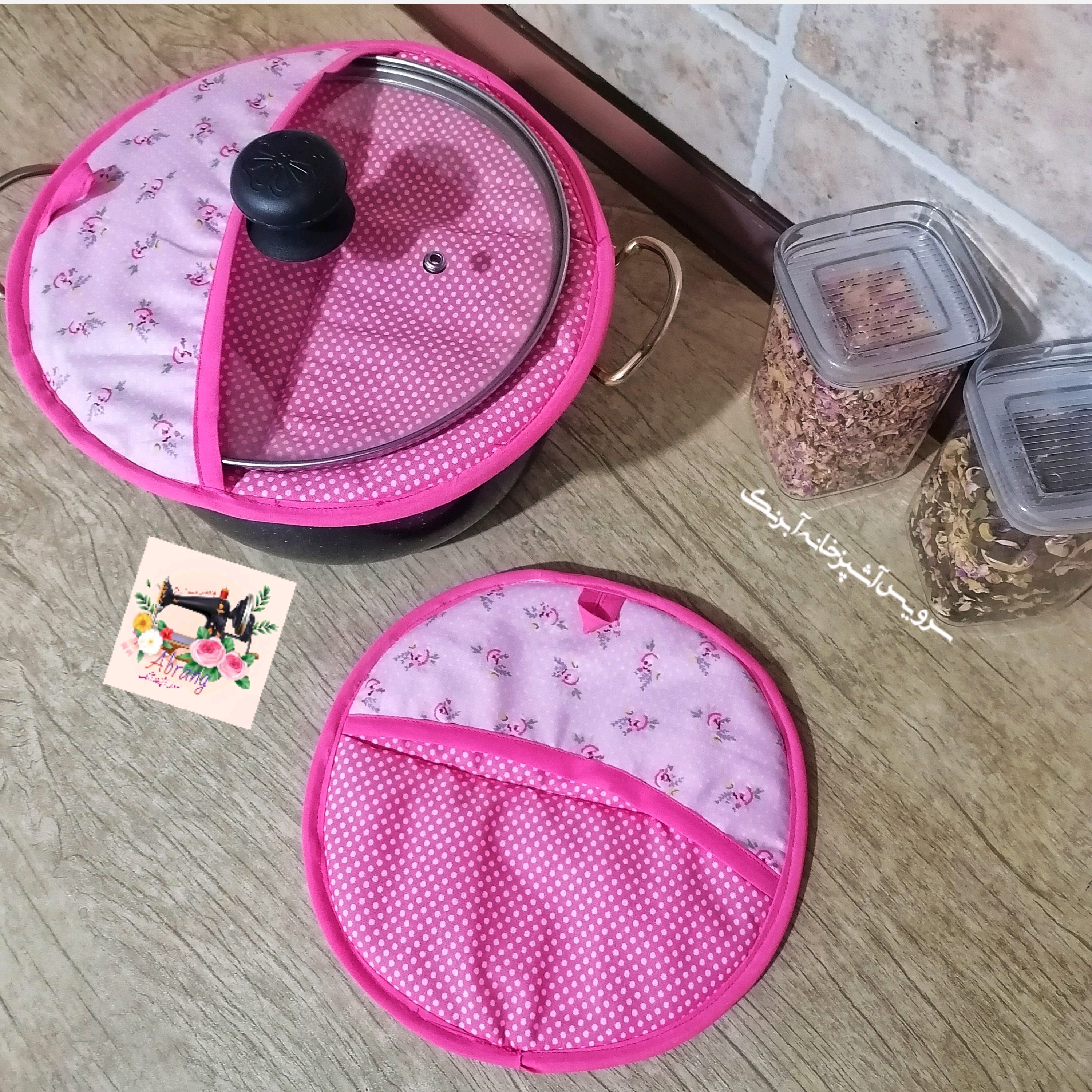 دمکنی قابلمه مدل هلالی بسته دو عددی در دو سایز؛ کوچک و متوسط سه لایه شامل؛ دو لایه پارچه و یک لایه پشم شیشه کوبیده شده دور دوزی شده با نوار اریب کتان نخ