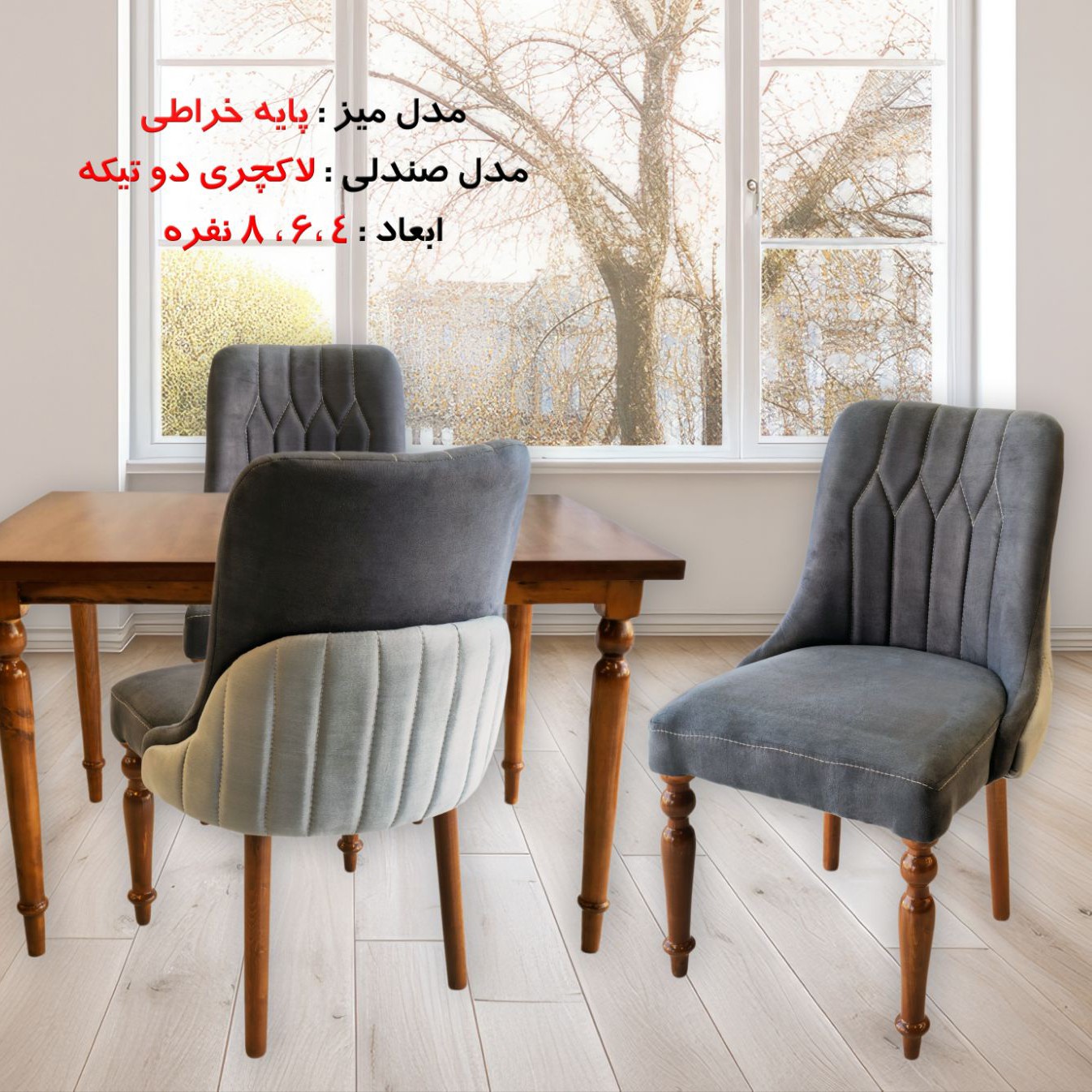 🔰ناهارخوری مدل لاکچری ✅️جنس صندلی ها: چوب روسی ✅️جنس میز: صفحه ام دی اف، پایه ها چوب روسی ✅️پارچه: قابل سفارش به سلیقه ✅️رنگ چوب: رنگ پلی استر، انتخابی به سلیقه ✅️ابعاد میز: 🔶️ 4نفره: 120در 85 🔶️ 6نفره: 150در 85 📲تماس: 🚚ارسال به سراسر ایران 🇮🇷 ✅️تحویل: 10 روزه 🔴نحوه ثبت سفارش: 1️⃣1-گفتگو در چت و دریافت مشاوره و راهنمایی، 2️⃣2-افزودن به سبد خرید و پرداخت مبلغ 3️⃣3-گفتگو با پشتیبانی جهت رنگ پارچه و چوب 4️⃣4-آماده سازی و ارسال سفارش ✅️ ارسال به تهران: از طریق وانت در همان روز آماده شدن ✅️ ارسال به شهرستان: تحویل به باربری و تحویل بین 24 تا 72 ساعت بعد .