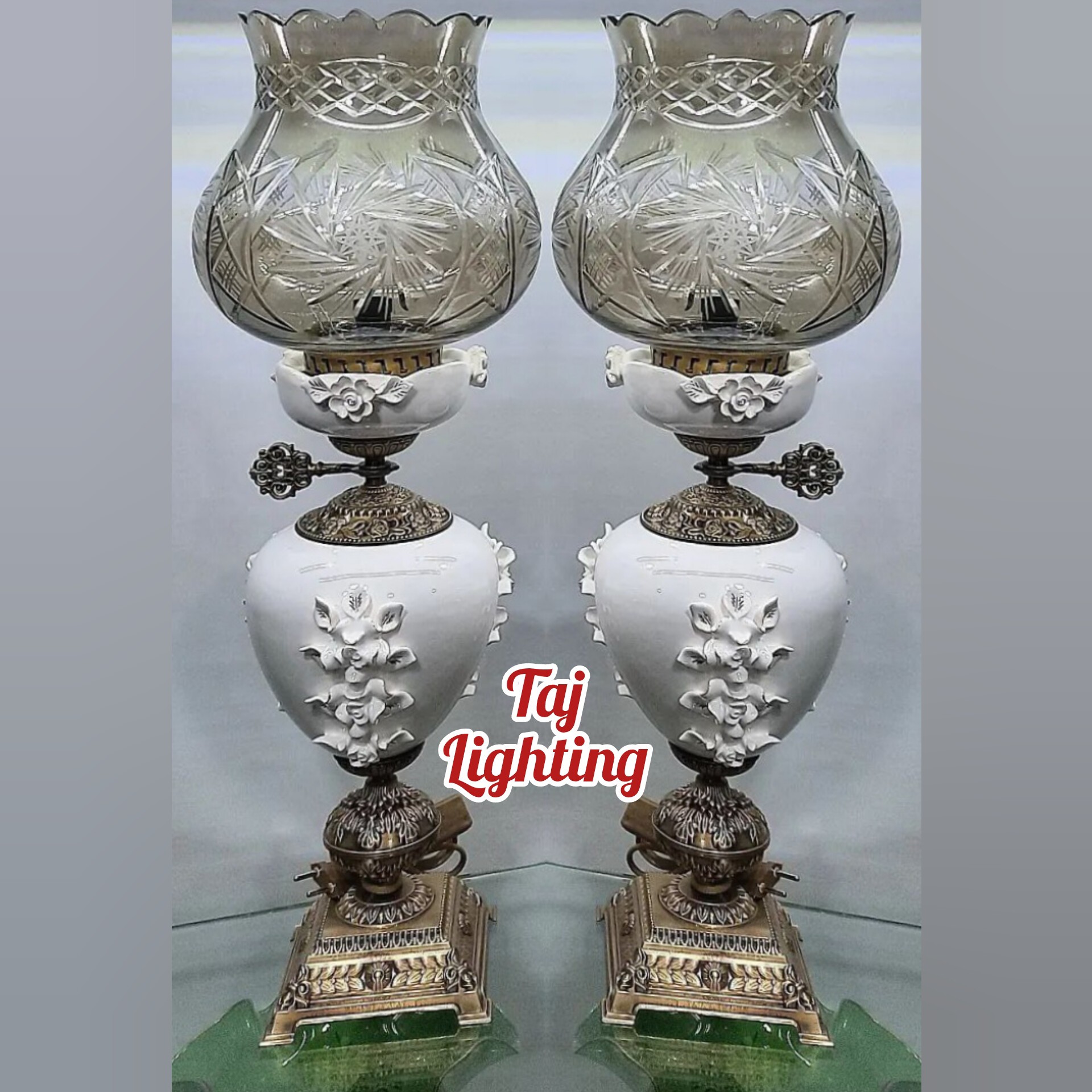 💥قیمت درج شده ، قیمت ست سه تیکه کامل می باشد ارتفاع چراغ ها : حدود 55 ارتفاع کاپ : حدود 30 لاله تراش خورشیدی رنگ لاله : شامپاینی جنس وسط تنه : چینی جنس پایه برنز با آبکاری آنتیک