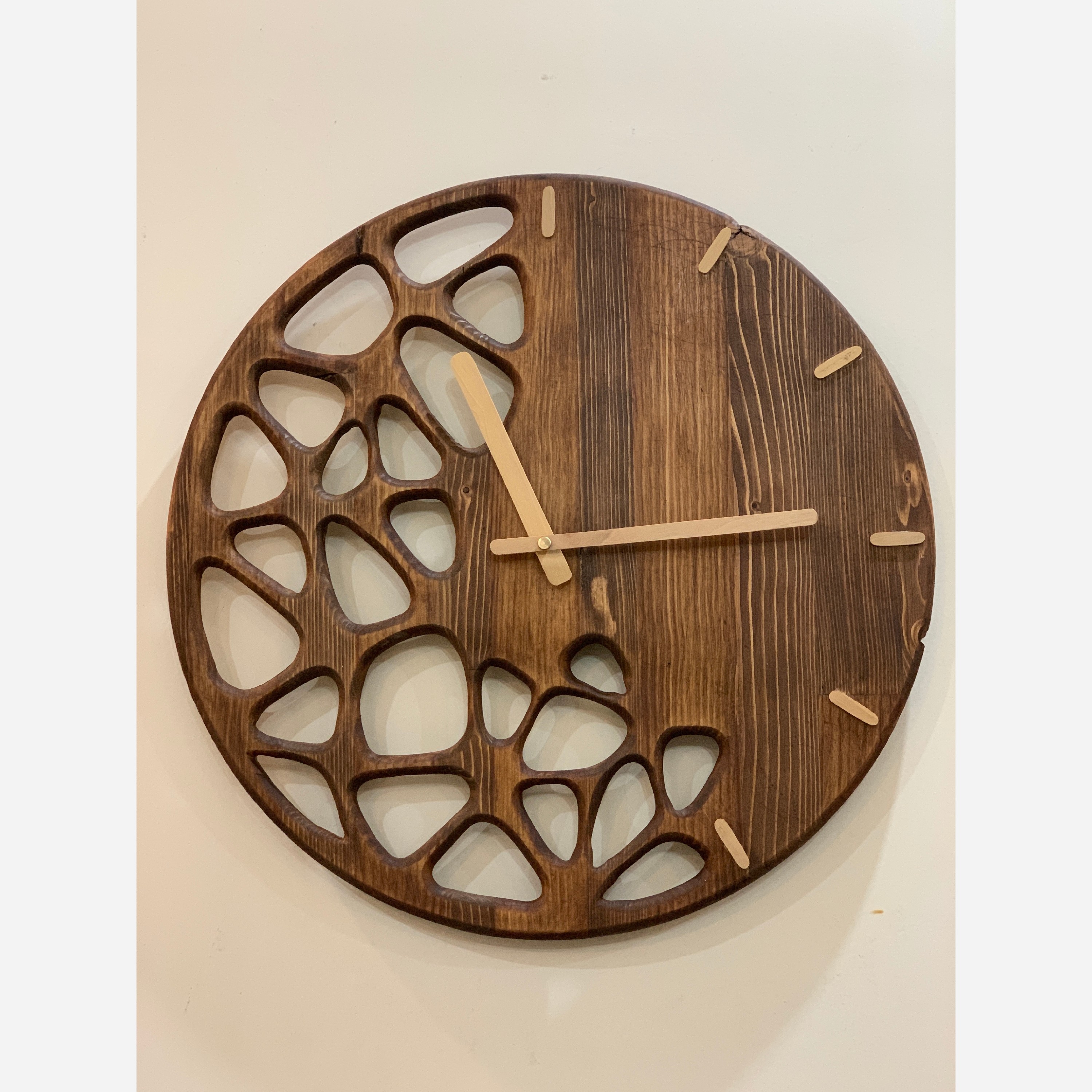 این یجورایی اولین مدل ساعت دیواریه که ساختم از چوب زیبا و خوش نقش روسی یا کاج روسی پوشش نهایی با شاپان و ورنی انجام شده که باعث میشه گرد و خاک به خورد چوب نره و راحت با دستمال ساده تمیز بشه موتور ساعت ارام گرد هست جنس عقربه هارو با چوب عناب زرد زدم که استحکام خوبی داشته باشه و نشکنه البته عقربه فلزی هم میتونید بهش بزنید