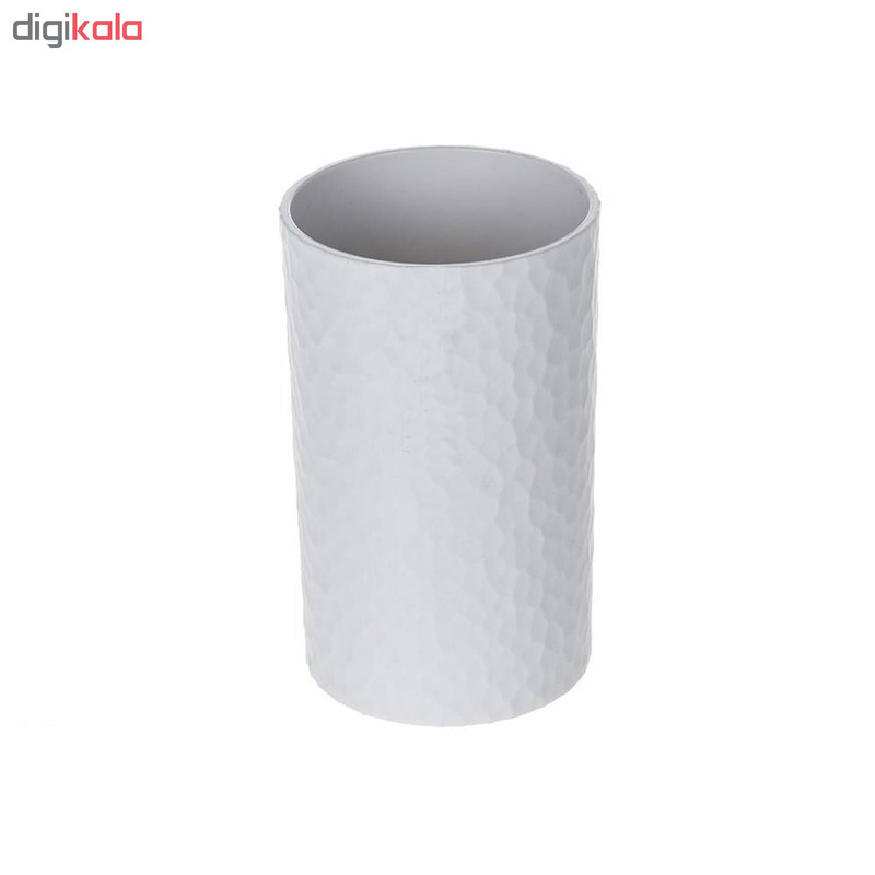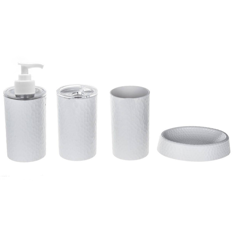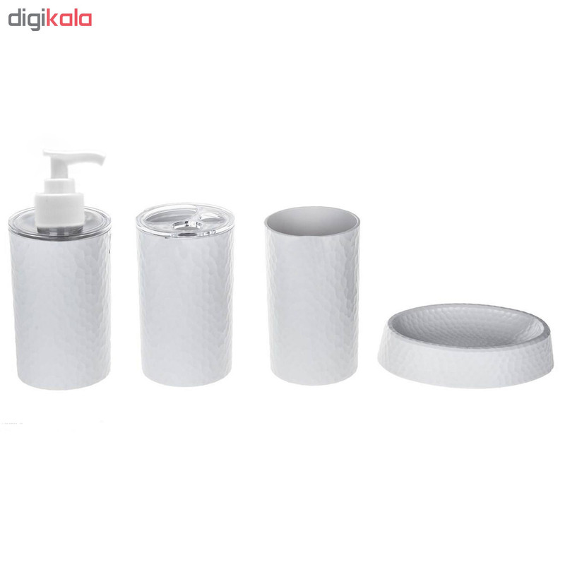 ست سرویس بهداشتی ۴ عددی شامل: یک جامسواکی با قطر ۷، ارتفاع ۱۲ سانتیمتر و وزن ۸۵ گرم یک جامایع با قطر ۸، ارتفاع ۱۸ سانتیمتر و وزن ۱۲۵ گرم یک جاصابونی با طول ۱۳.۲، عرض ۹.۸، ارتفاع ۳ سانتیتر و وزن ۶۰ گرم یک لیوان با قطر ۷، ارتفاع ۱۱.۵ سانتیمتر و وزن ۷۵ گرم ساخته شده از پلاستیک