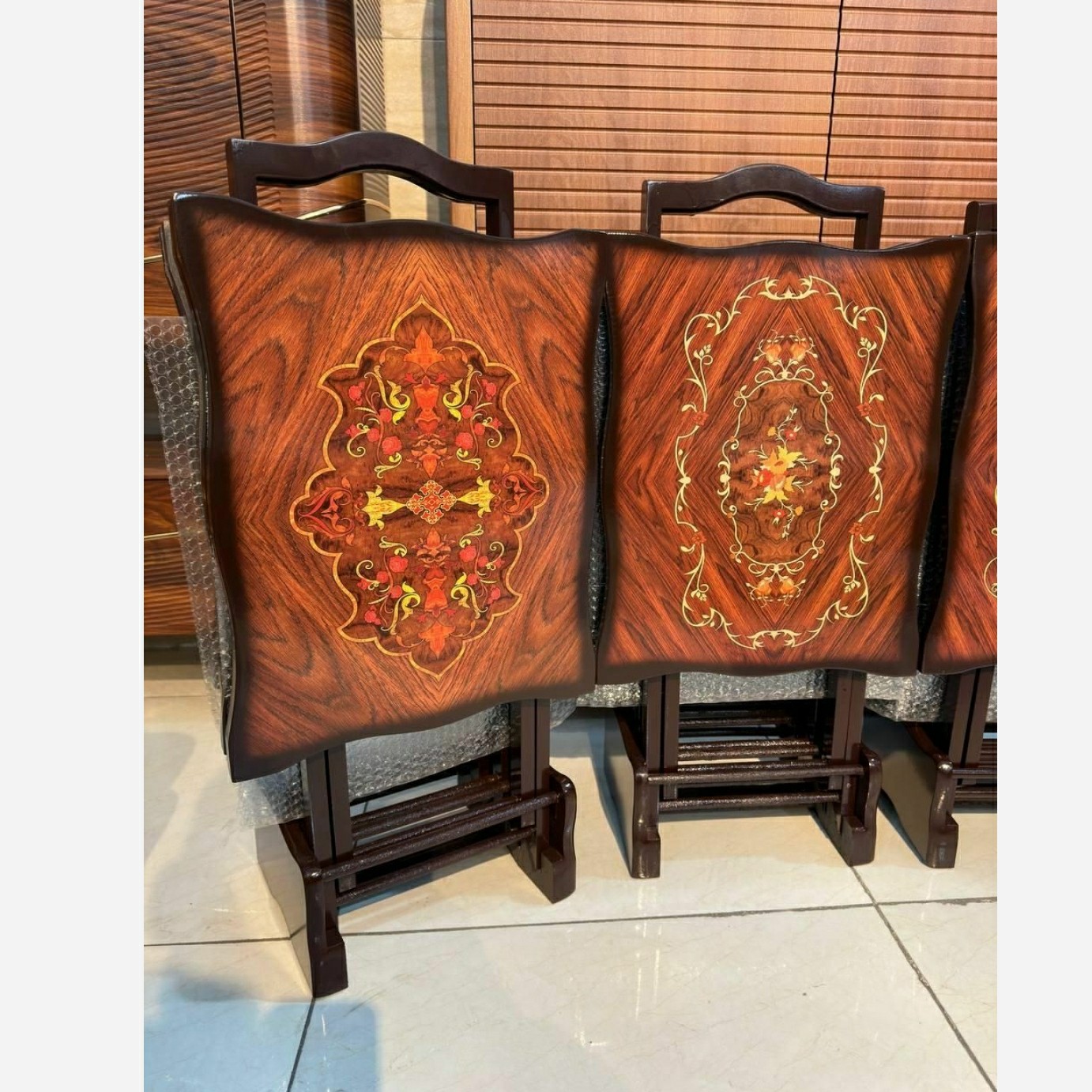 میز عسلی چهار عددی تاشو کمجا با پایه نگه دارنده پولیشی مقاوم در برابر اب با ضربه گیر برای جاگذاری راحت در پایه نگهدارنده علت اختلاف قیمت این مدل کارها در ضخامت پایه های کار و استر روی کار هستش که باعث افزایش و کاهش قیمت محصول میشه