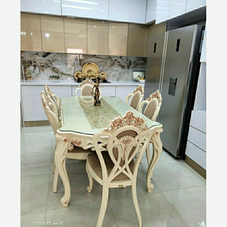 میز و صندلی غذاخوری پلیمری شش نفره صدفی مبلمونسرا مدل 215115