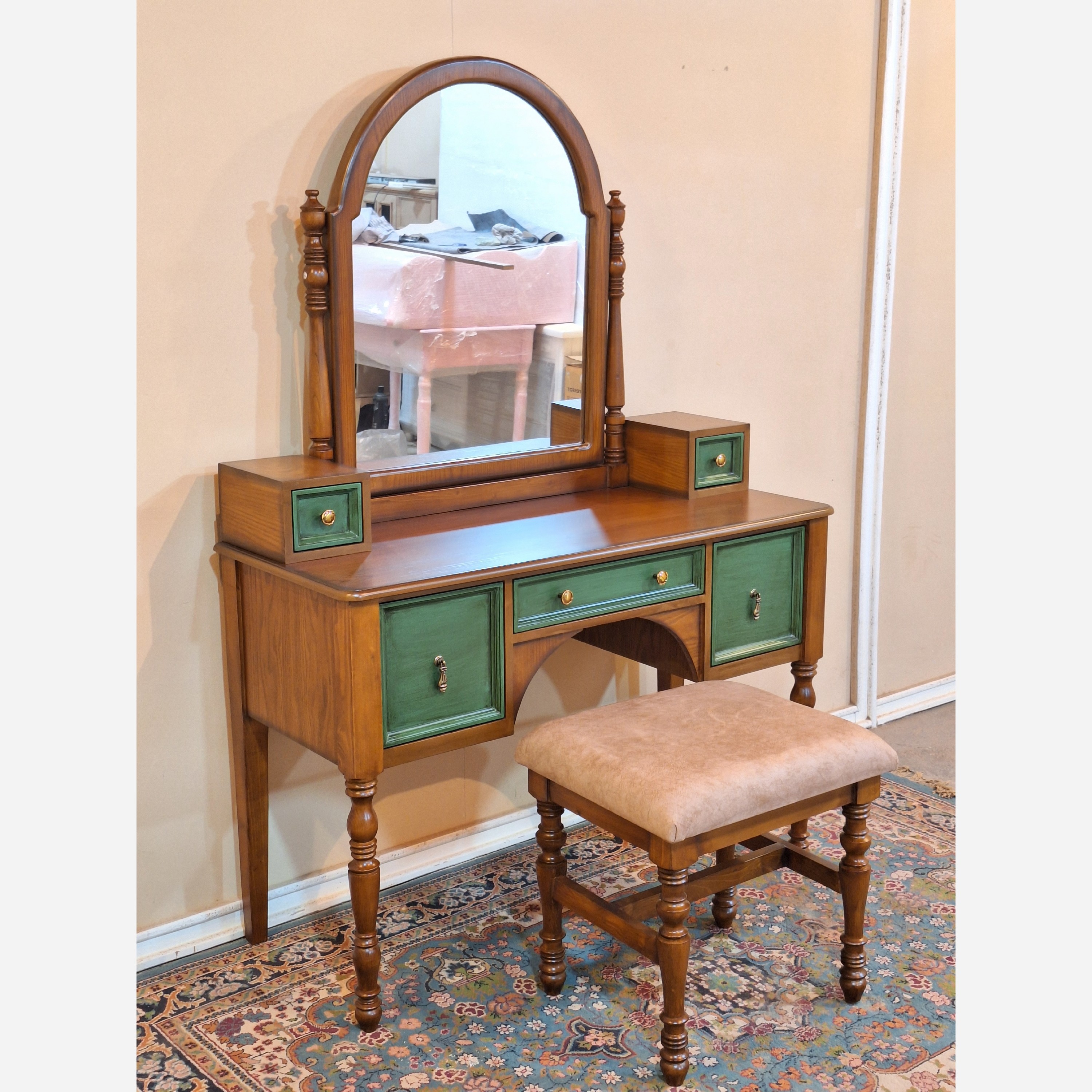 میزآرایش آینه و پاف کلاسیک سبز قهوه ای مبلمونسرا مدل 212066