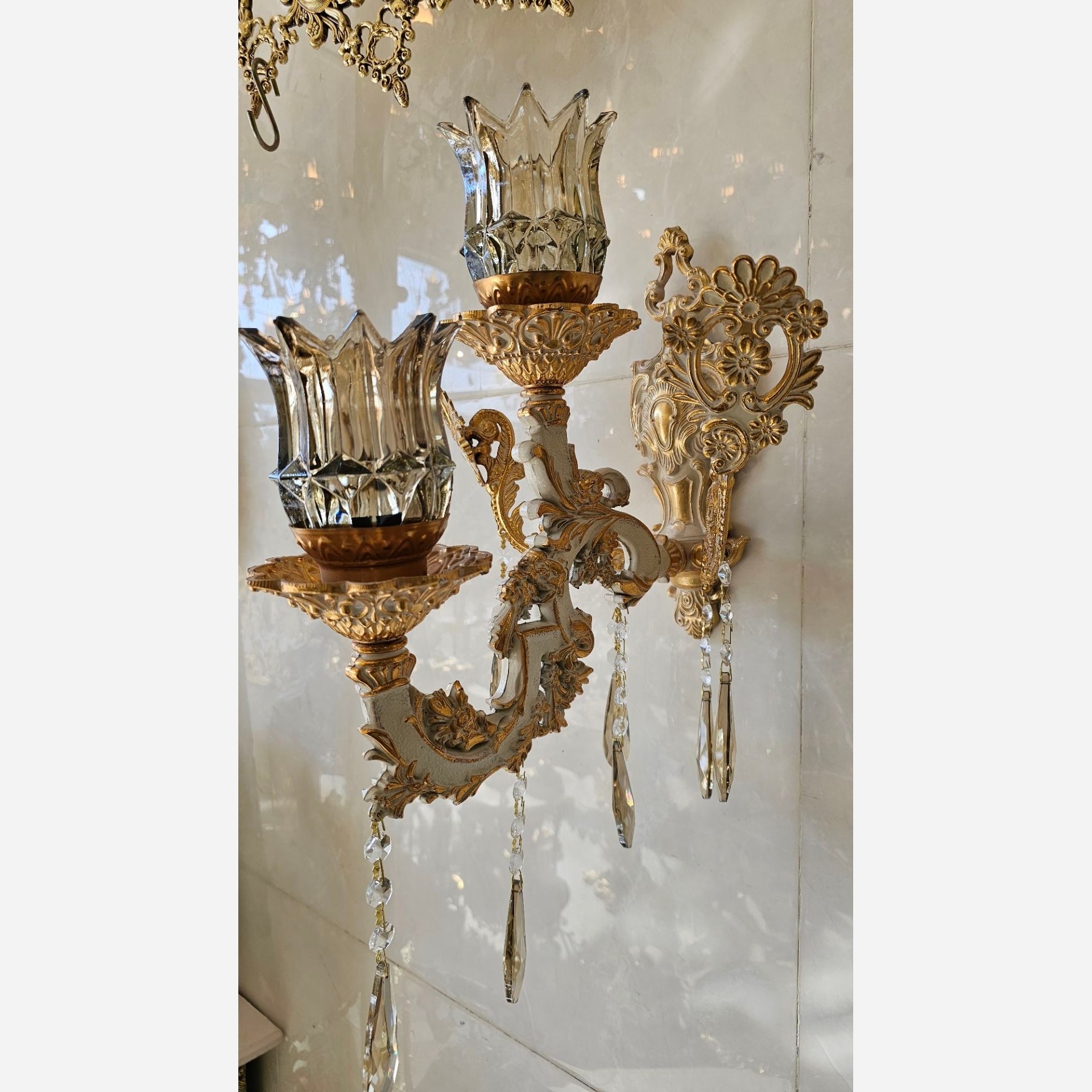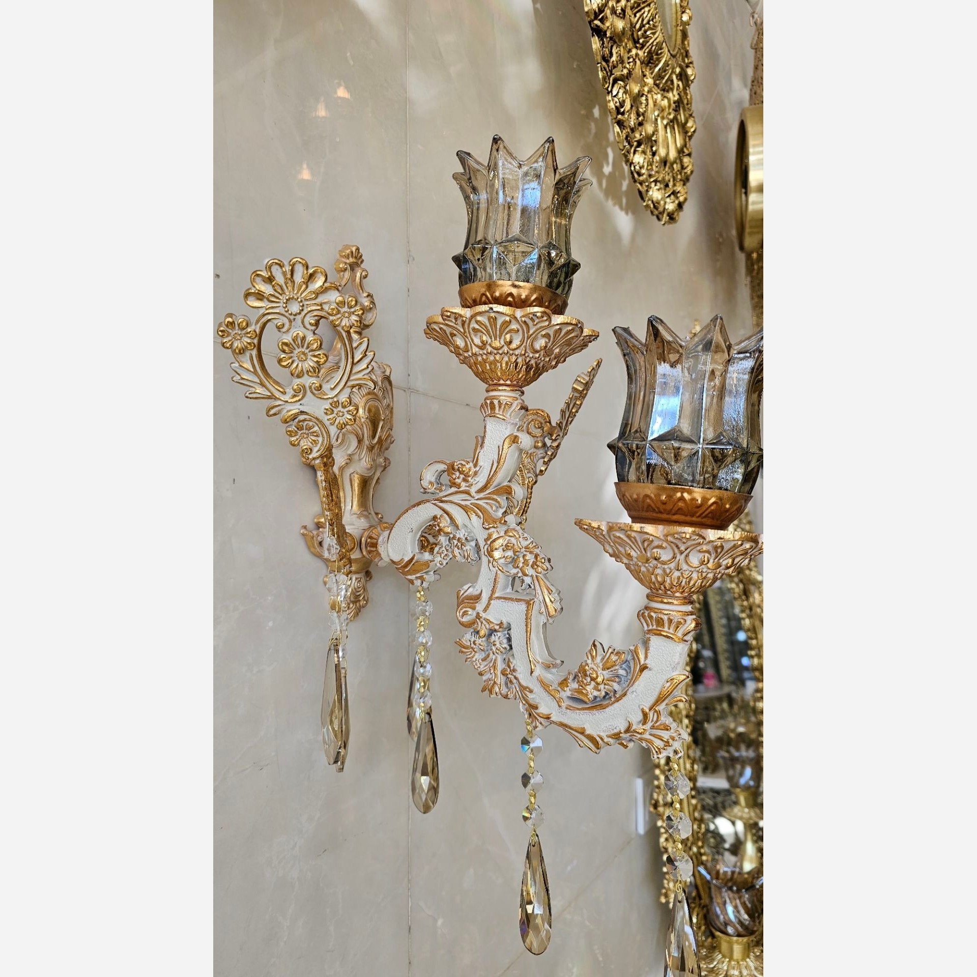 دیوارکوب شاخه بزرگ دولامپ آبکاری سفید طلایی فورتیک