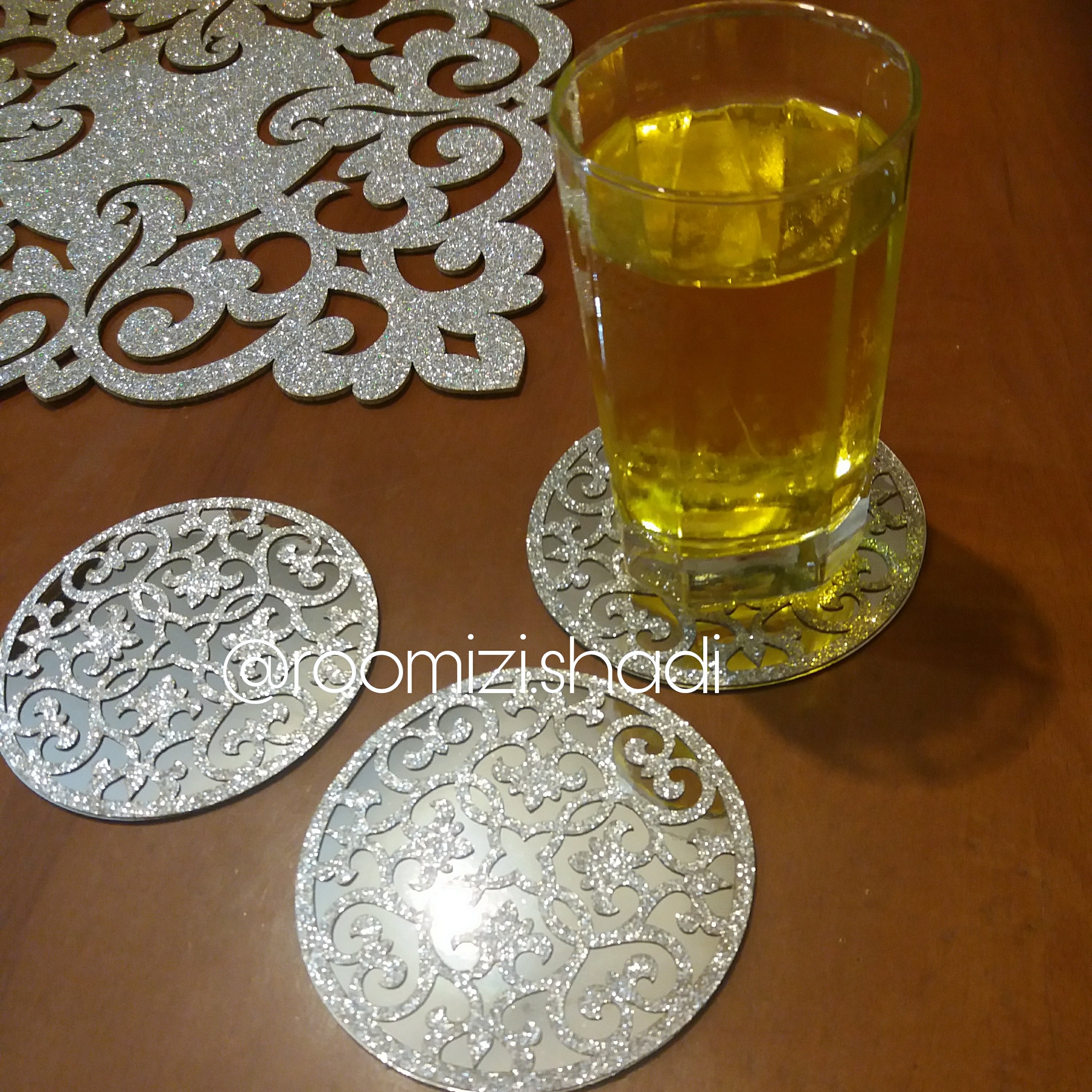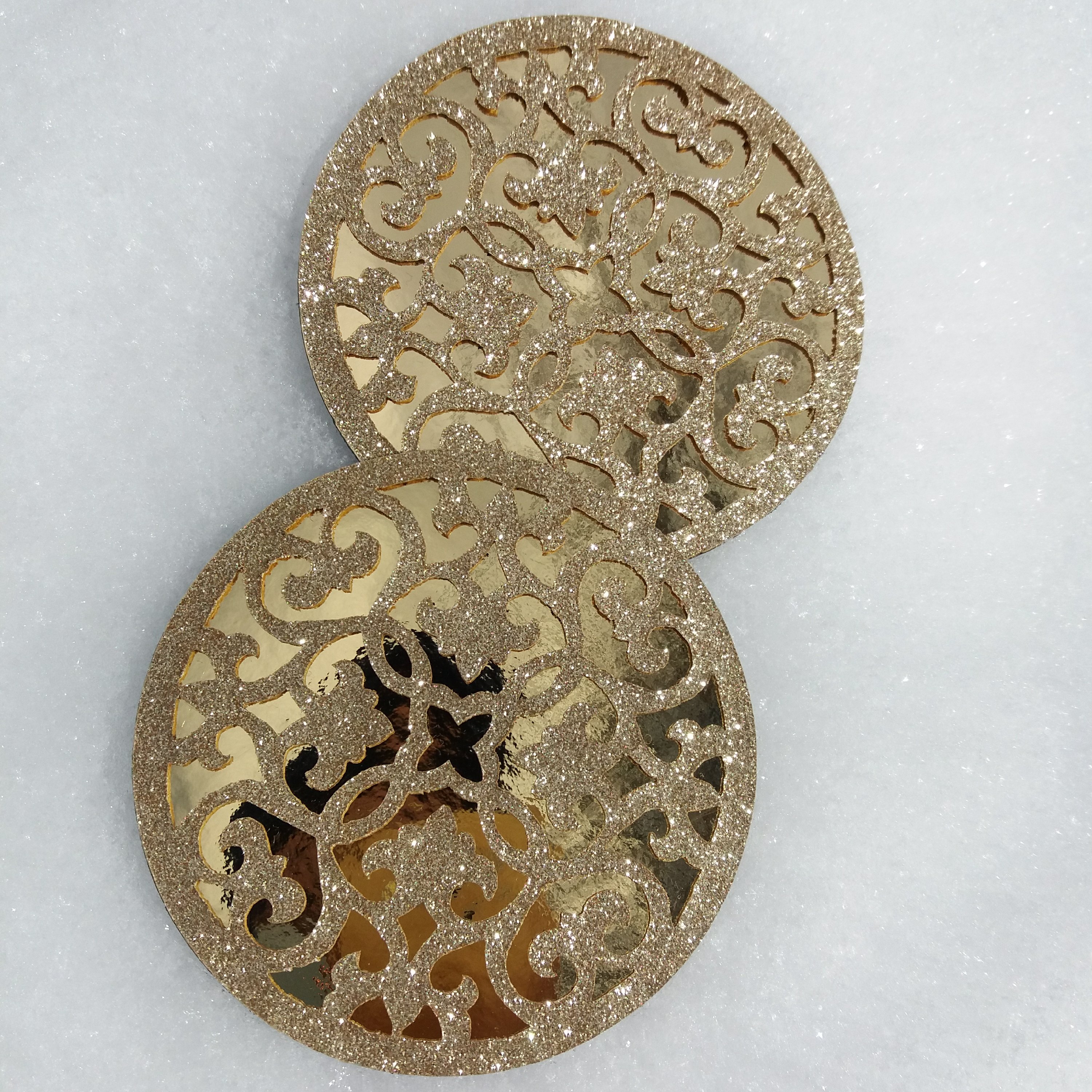 زیرلیوانی های طلایی و نقره ای چرم مصنوعی جنس چرم اکلیلی و چرم براق سایز دوازده سانت قابل شستشو در دو رنگ طلایی و نقره ای فروش بصورت دست 6 عددی و یا جفتی
