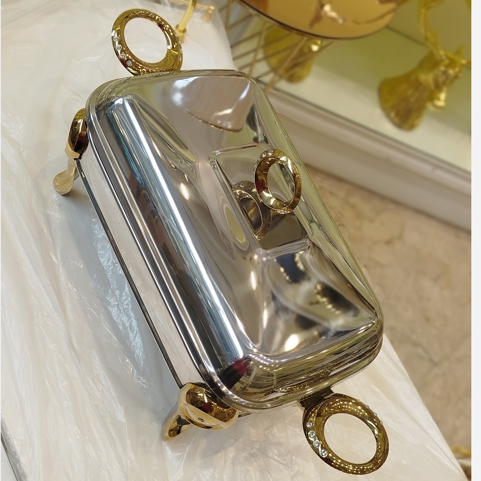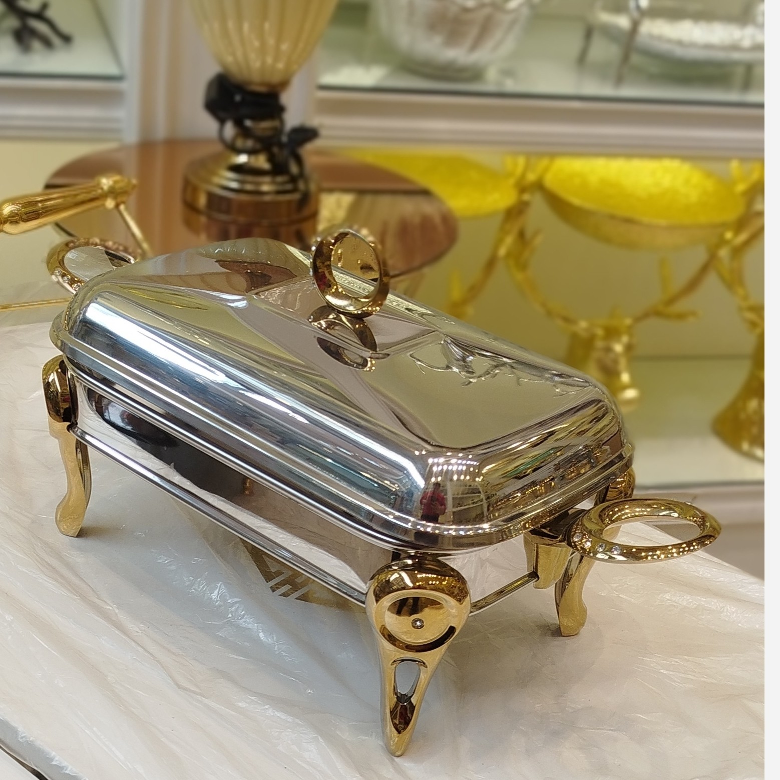 سوفله خوری مرغ و برنج طلایی سانیکس سایز کوچک داشتن میز و یا سفره زیبا مستلزم استفاده از ظروفی شیک و مناسب پذیرایی و میزبانی است. یکی از ظروفی که جلوه خاص و مجلسی به میز شما میدهد، سوفله خوری میباشد. سوفله خوری ها به دلیل وارمر یا همان شمع گرم نگه دارنده امکان سرو غذای گرم را میدهند و مناسب غذاهایی مانند خورش، مرغ و سوپ هستند البته برای سرو سالاد هم مورد استفاده قرار می گیرند هر غذایی که باید به صورت گرم سرو شود و تا انتهای غذا گرم بماند از ظروف سوفله خوری استفاده کنید . برای سرو انواع خورشت ، مرغ و سوپ نیز می توانید از این ظروف استفاده نمائید.این ظرف به طور کلی دارای یک پایه فلزی هستند که محفظه ای برای شمع وارمر در زیر آن طراحی شده است و ظرف غذا روی آن قرار می گیرد و شعله شمع آن را گرم نگه می دارد به همین علت است که به این نوع از ظروف ، گرم نگهدارنده غذا می گویند . سوفله سانیکس ساخته شده از استیل خالص 18/10 پایه و دستگیره ها پلیمری با آبکاری می باشد. دارای پیرکس نشکن با قابلیت استفاده در فر و ما کرو فر. سایز 1/6 لیتر مخصوص سرو مرغ،ماهی،برنج و انواع خورشت