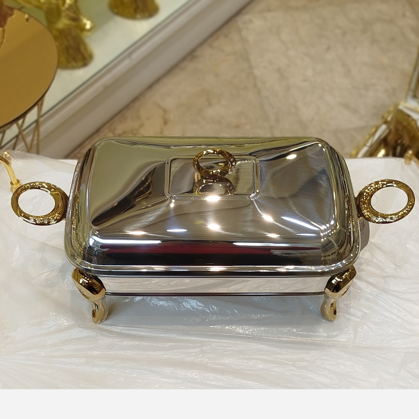 سوفله مرغ و برنج پایه طلایی سانیکس سایز متوسط داشتن میز و یا سفره زیبا مستلزم استفاده از ظروفی شیک و مناسب پذیرایی و میزبانی است. یکی از ظروفی که جلوه خاص و مجلسی به میز شما میدهد، سوفله خوری میباشد. سوفله خوری ها به دلیل وارمر یا همان شمع گرم نگه دارنده امکان سرو غذای گرم را میدهند و مناسب غذاهایی مانند خورش، مرغ و سوپ هستند البته برای سرو سالاد هم مورد استفاده قرار می گیرند هر غذایی که باید به صورت گرم سرو شود و تا انتهای غذا گرم بماند از ظروف سوفله خوری استفاده کنید . برای سرو انواع خورشت ، مرغ و سوپ نیز می توانید از این ظروف استفاده نمائید.این ظرف به طور کلی دارای یک پایه فلزی هستند که محفظه ای برای شمع وارمر در زیر آن طراحی شده است و ظرف غذا روی آن قرار می گیرد و شعله شمع آن را گرم نگه می دارد به همین علت است که به این نوع از ظروف ، گرم نگهدارنده غذا می گویند . سوفله سانیکس ساخته شده از استیل خالص 18/10 پایه و دستگیره ها پلیمری با آبکاری می باشد. دارای پیرکس نشکن با قابلیت استفاده در فر و ما کرو فر. سایز 2/6 لیتر مخصوص سرو برنج،مرغ و ماهی و انواع خورشت