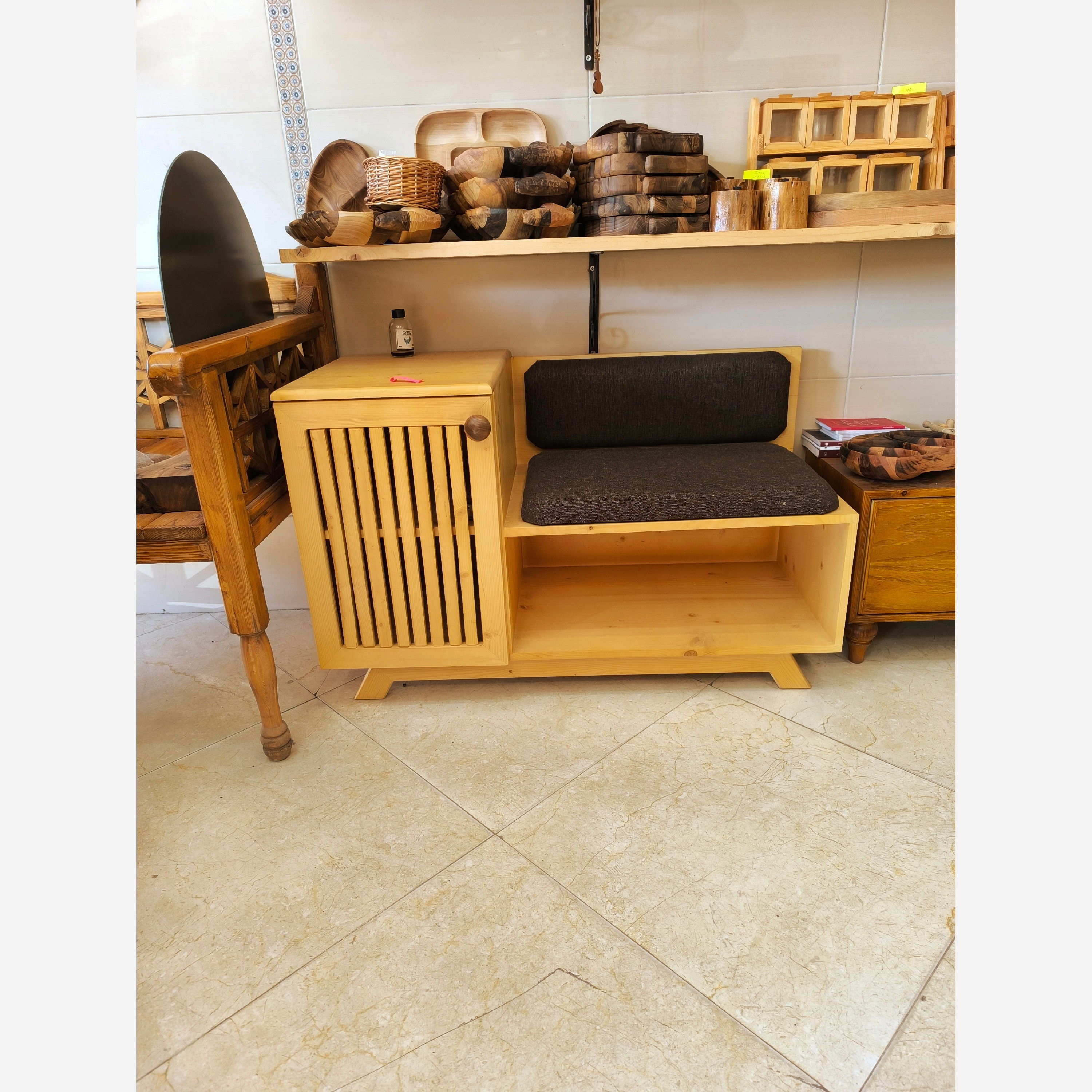 جاکفشی نشیمن دار، از چوب روسی و رنگ پلی استر مات با پارچه ی قهوه ای تیره آماده ارسال است و در رنگ های دیگر قابل سفارش