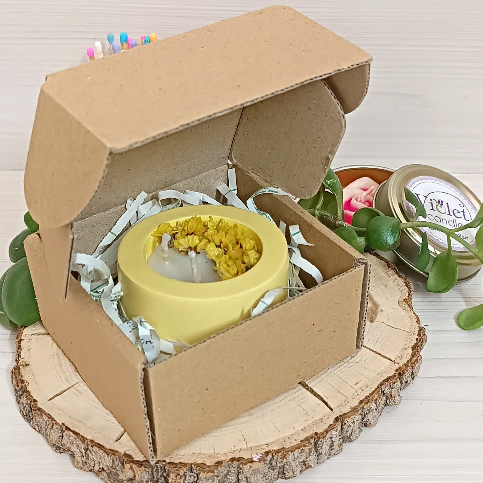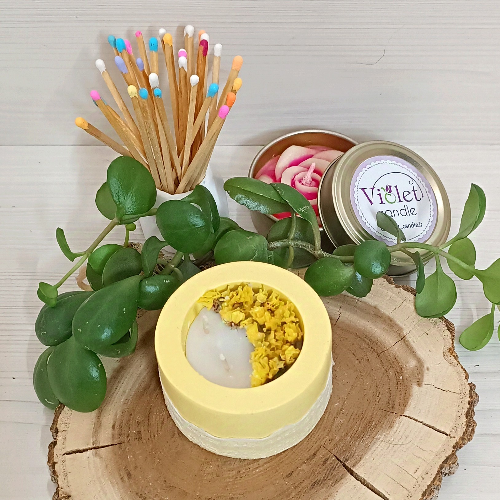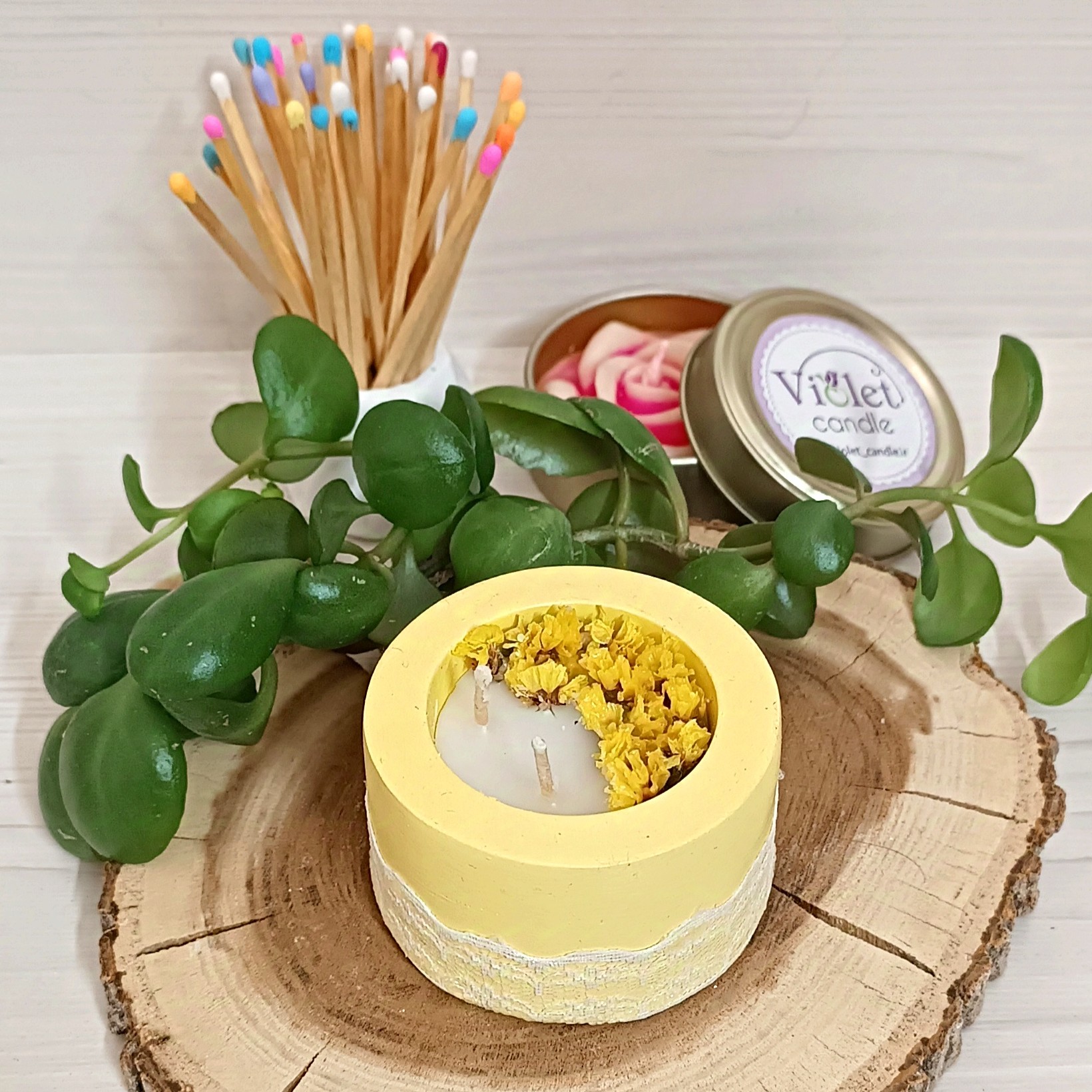 شمع دست ساز با تزئین گلهای خشک رنگ زرد یا لیمویی 💛 با فتیله چوبی زیبا و با کیفیت قابل سفارش در رنگ و تعداد دلخواه شما
