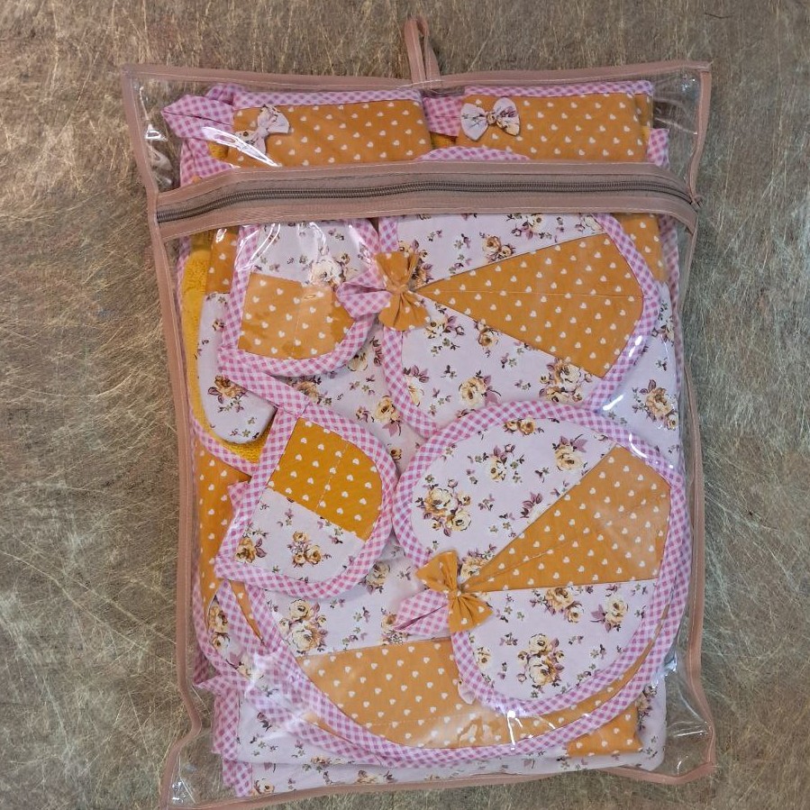 جنس پارچه ترک وارداتی ، بسیار با کیفیت میباشد از پشم شیشه مرغوب استفاده شده است رنگ ثابت سرویس شامل قطعات زیر میباشد 1 عدد نمگیر 1 عدد پیشبند 3 عدد دمکنی طرح چشمی 1 عدد حوله 2 عدد دستگیره قلب 2 عدد دستگیره دایره 2 عدد دستگیره فنجانی 1 عدد رو قوری 2 عدد دستکش فر