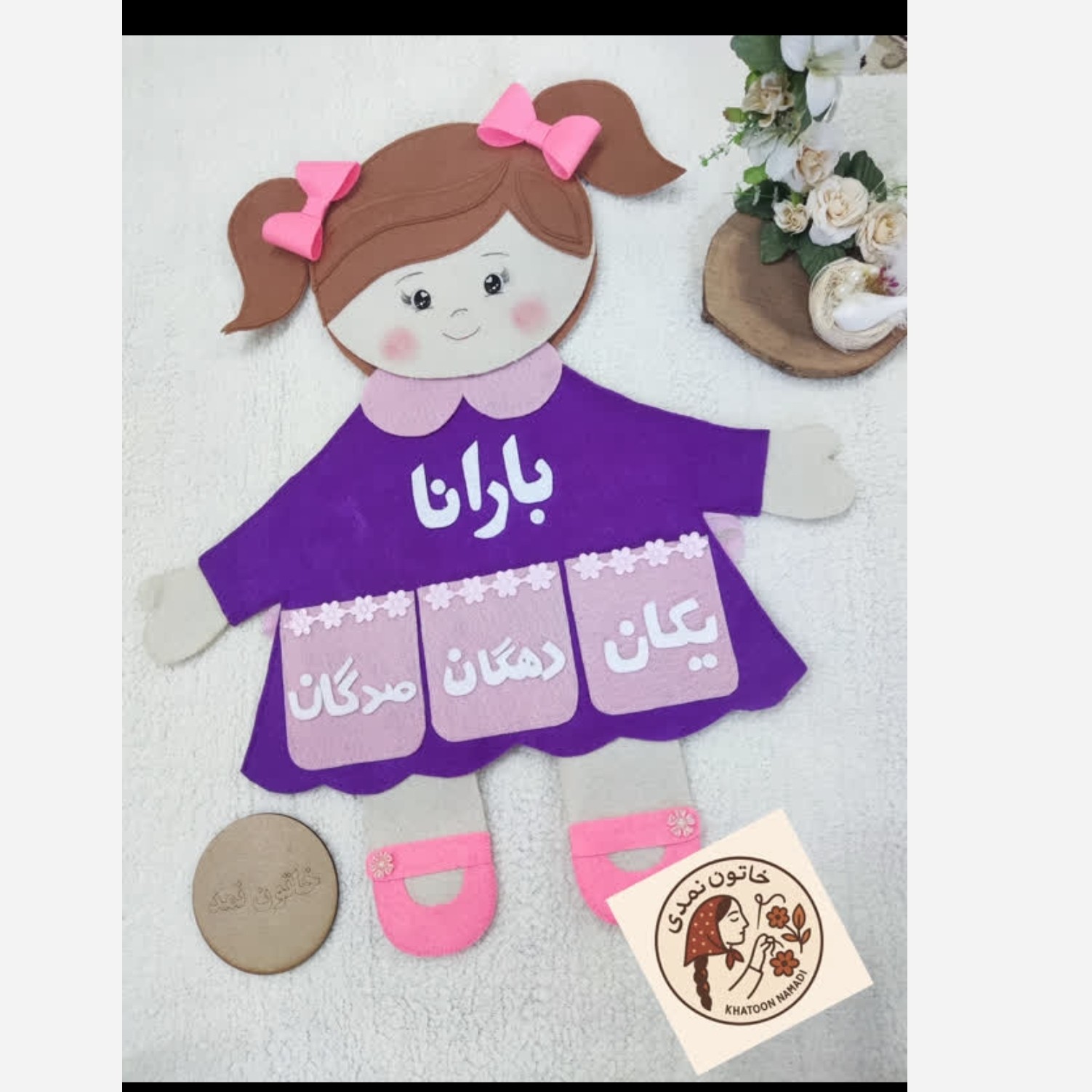 جهت آموزش درس ریاضی مدل دخترک دارای بند برای بستنن تمام کار نمد و دوخت شده است رنگ های دیگر قابل سفارش میباشد رنگ و طرح و ابعاد دلخواه شما دوخته می شود کافی هست تغییرات مد نظر را در قسمت گفتگو با غرفه دار هماهنگ کنید