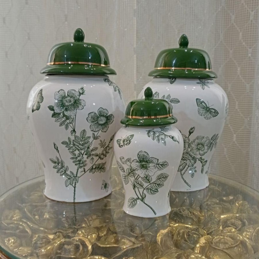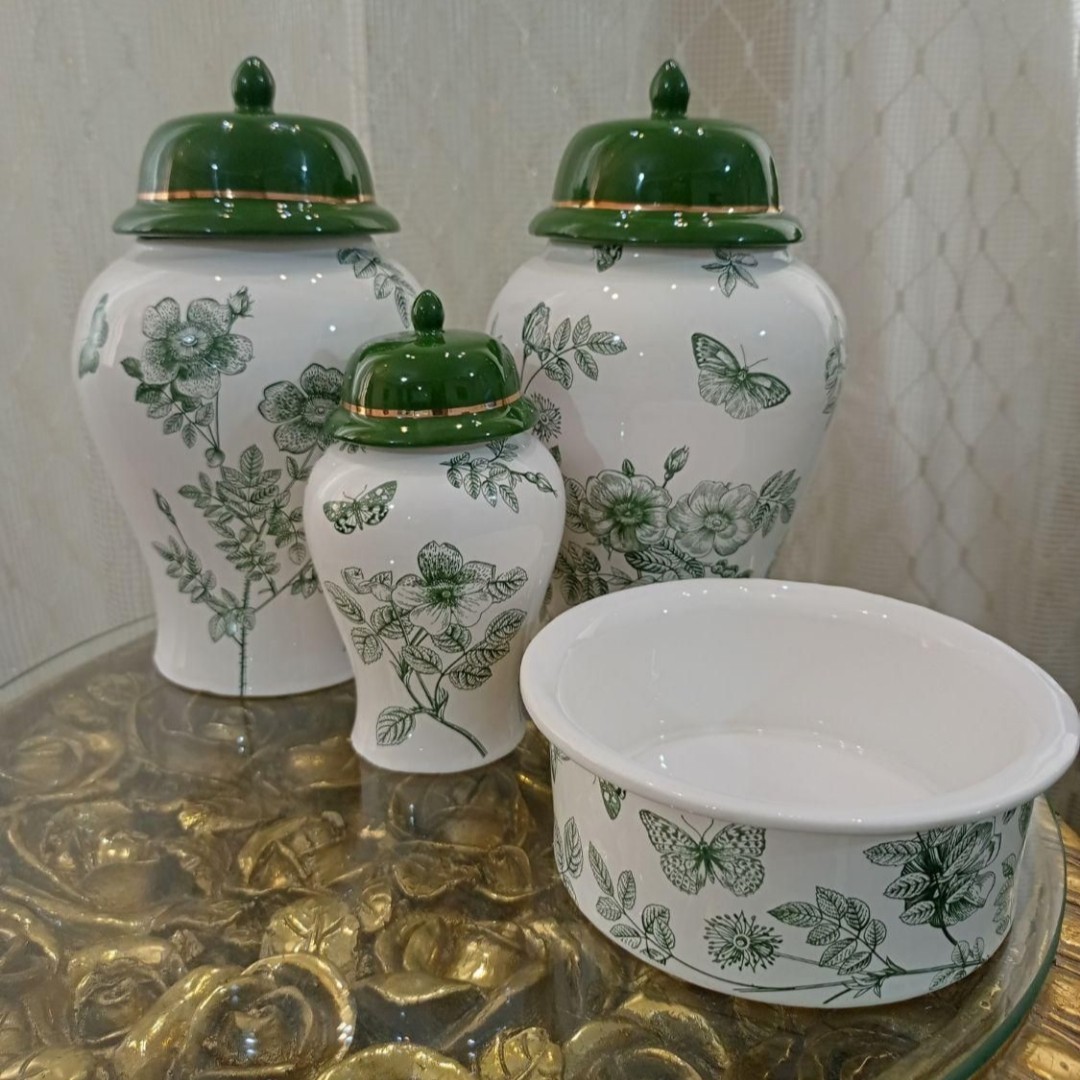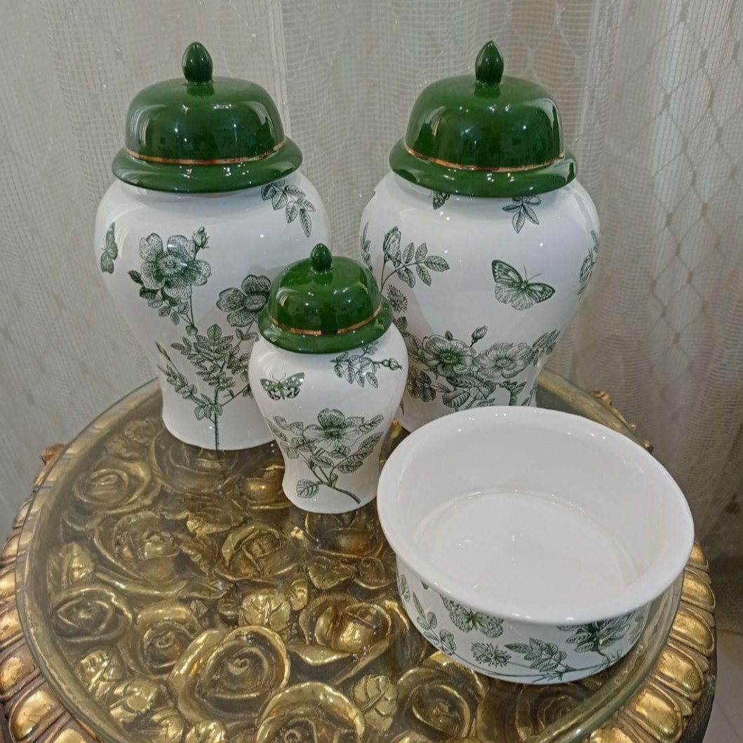 جینجر جار طرح پروانه جنس سرامیک دستساز درجه یک قابل شستشو طرح ثابت و کورهای 2تا جینجر ارتفاع 25_1جینجر ارتفاع16 شکلات خوری قطر15،قیمت250 هر ظرف پذیرایی با این طرح قابل سفارش ست