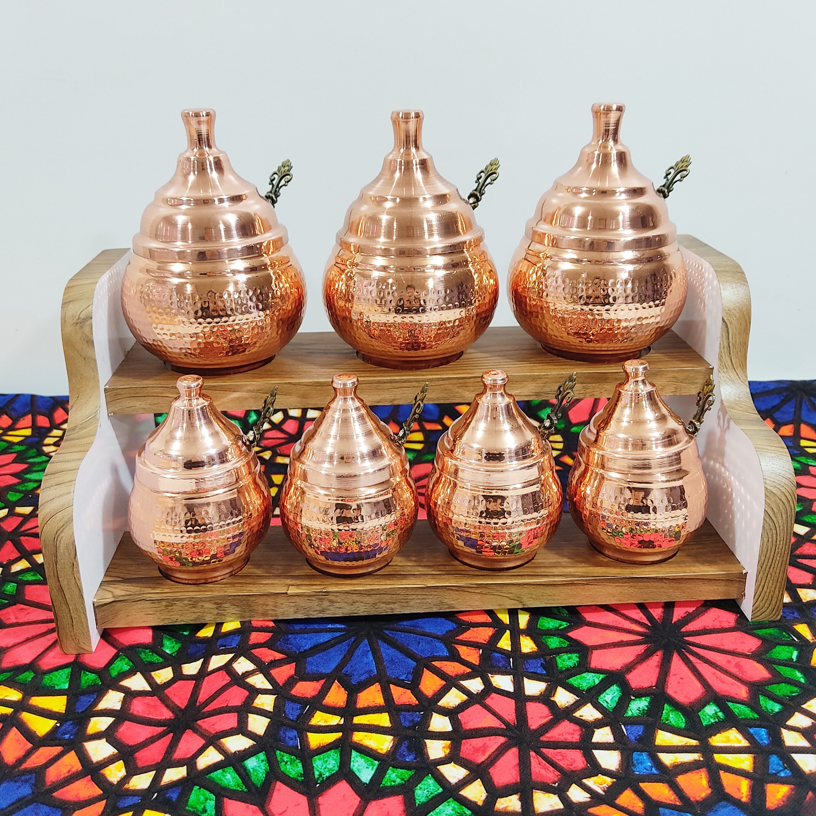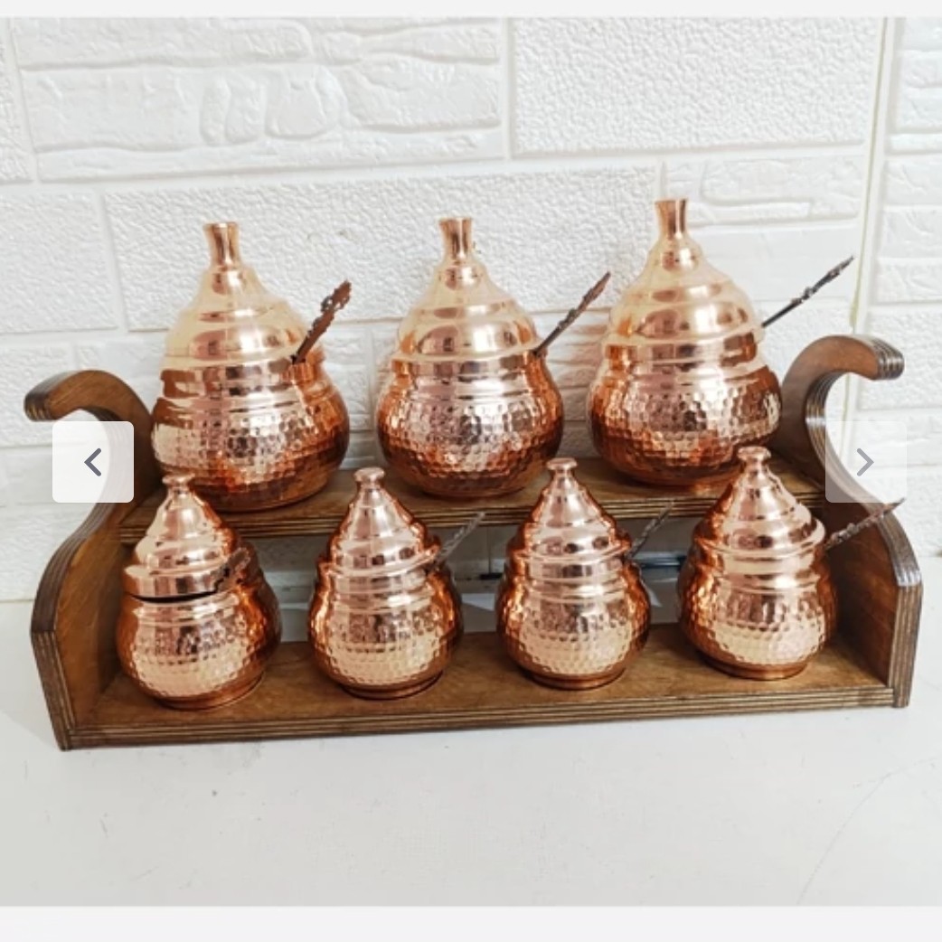 پا سماوری و جا ادویه ای مسی هفت تایی دو طبقه جا ا ویه ای مسی داخل و چکشی جا ادویه ای دوطبقه ای که در طبقه بالا سه عدد جا ا ویه ای خمره ای بزرگ جاسازی شده که ابعاد انها قطر دهانه 6 سانت ارتفاع 12 سانت است و د ر طبقه پایین ان 4 عدد جا ادویه ای کوچک قر ار دارد استند جا ادویه ای از جنس ام دی اف می باشد و بسیار زیباست داخل جا ادویه ها با قلع سفید ا ی شده است برای هر جا ا ویه ای یک قاشق فلزی مناسب جمعا هفت تا تهیه شده و همراه جنس ارایه می شود نانو پوشش خیلی نازک از مواد خاص و مقاوم می باشد که روی ظروف مسی زنجان قرار می گیرد و در کوره های مخصوص به وسیله حرارت تثبیت می شود این پوشش نانو ظرف را در مقابل هوا و رطوبت محافظت کرده و از اکسید و کدر شدن ان جلو گیری می نماید .