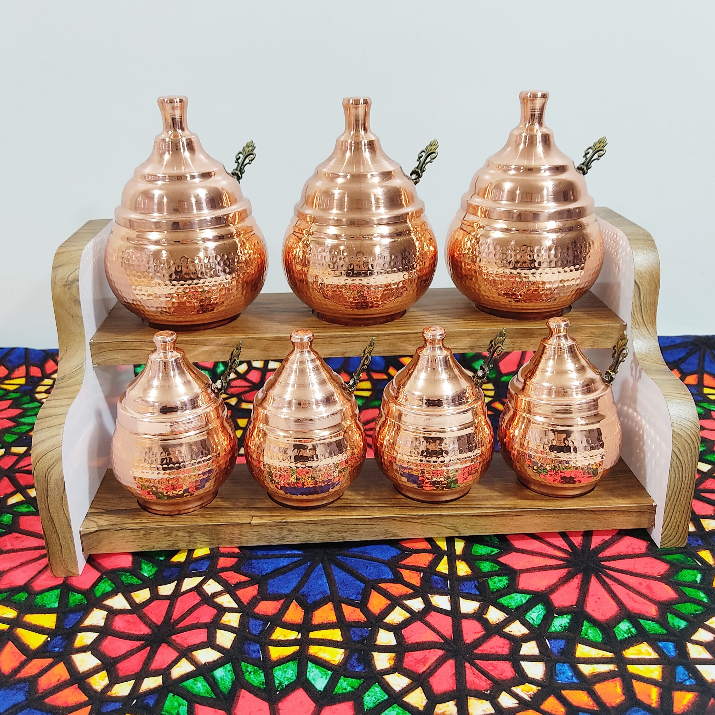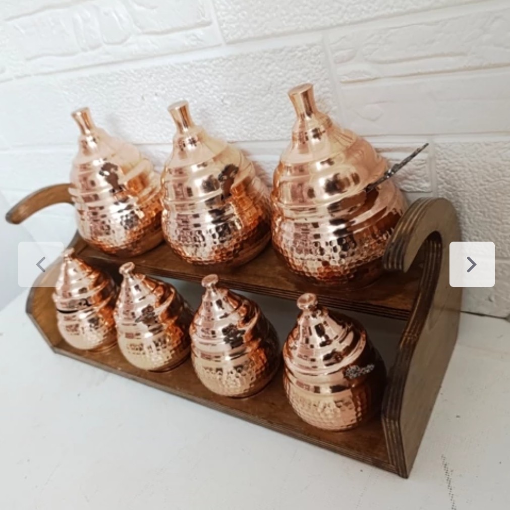پا سماوری و جا ادویه ای مسی هفت تایی دو طبقه جا ا ویه ای مسی داخل و چکشی جا ادویه ای دوطبقه ای که در طبقه بالا سه عدد جا ا ویه ای خمره ای بزرگ جاسازی شده که ابعاد انها قطر دهانه 6 سانت ارتفاع 12 سانت است و د ر طبقه پایین ان 4 عدد جا ادویه ای کوچک قر ار دارد استند جا ادویه ای از جنس ام دی اف می باشد و بسیار زیباست داخل جا ادویه ها با قلع سفید ا ی شده است برای هر جا ا ویه ای یک قاشق فلزی مناسب جمعا هفت تا تهیه شده و همراه جنس ارایه می شود نانو پوشش خیلی نازک از مواد خاص و مقاوم می باشد که روی ظروف مسی زنجان قرار می گیرد و در کوره های مخصوص به وسیله حرارت تثبیت می شود این پوشش نانو ظرف را در مقابل هوا و رطوبت محافظت کرده و از اکسید و کدر شدن ان جلو گیری می نماید .