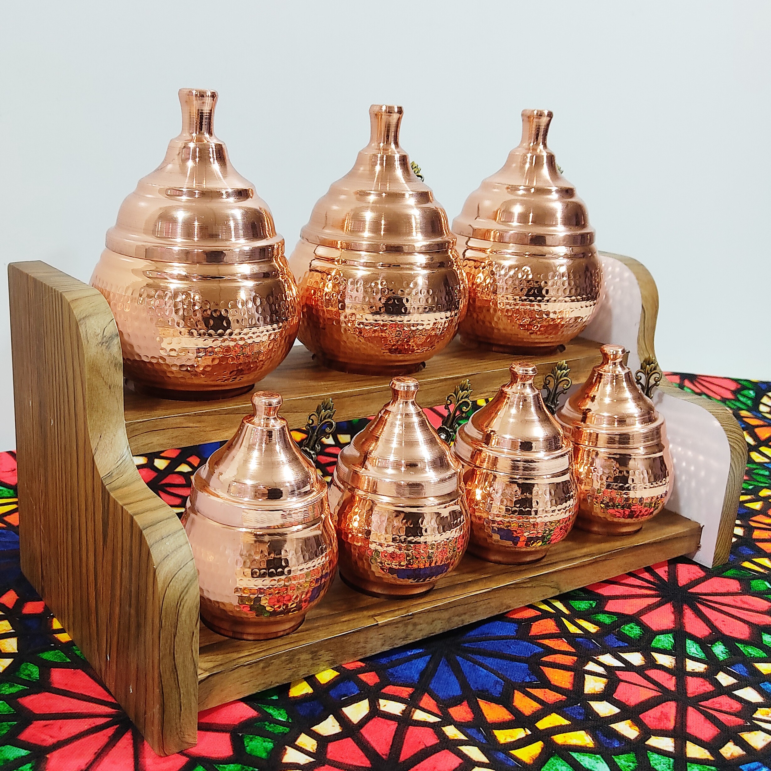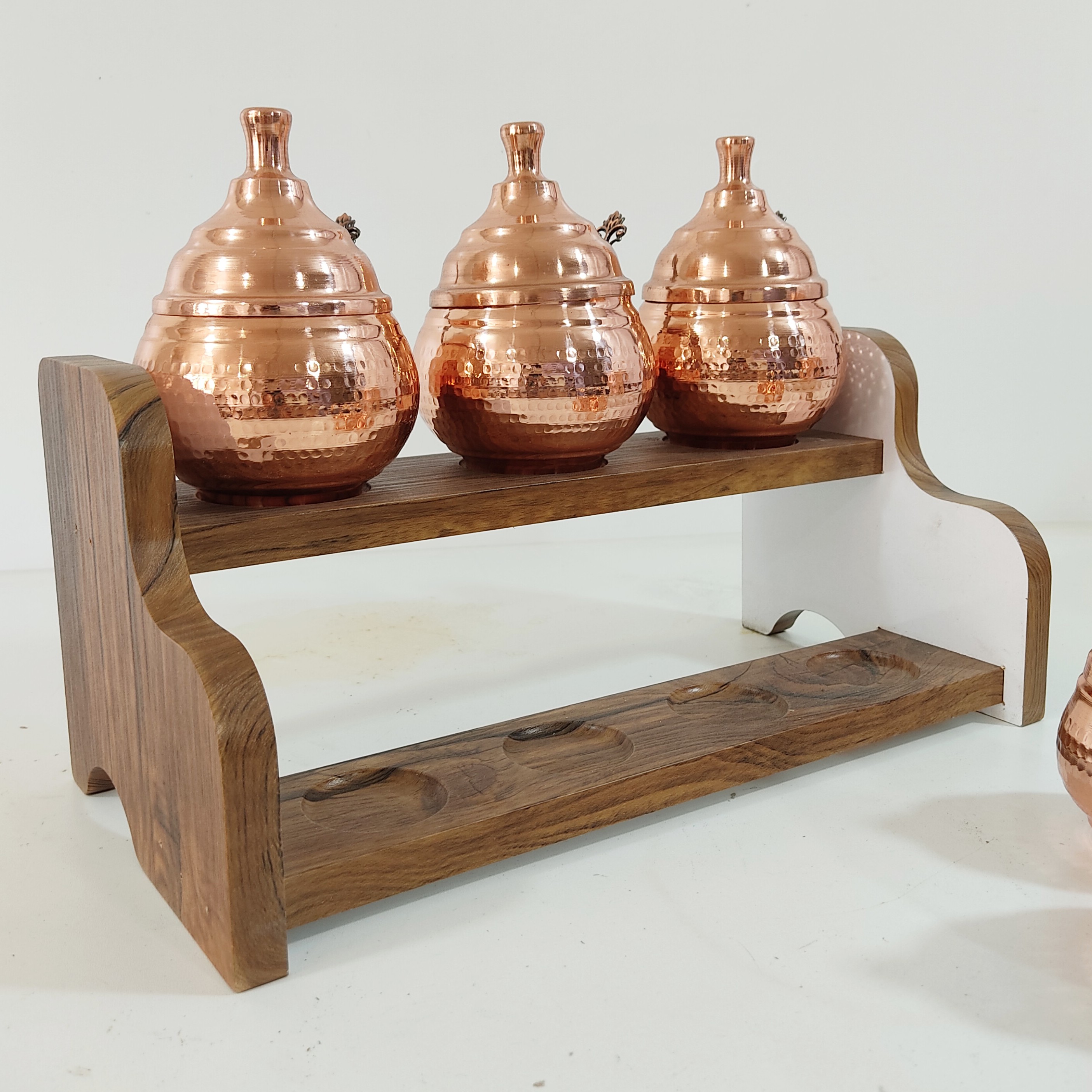 جا ادویه هفت تایی مسی رنگ ثابت قاشق دار استند چوبی نانو شده مبلمونسرا مدل 288584