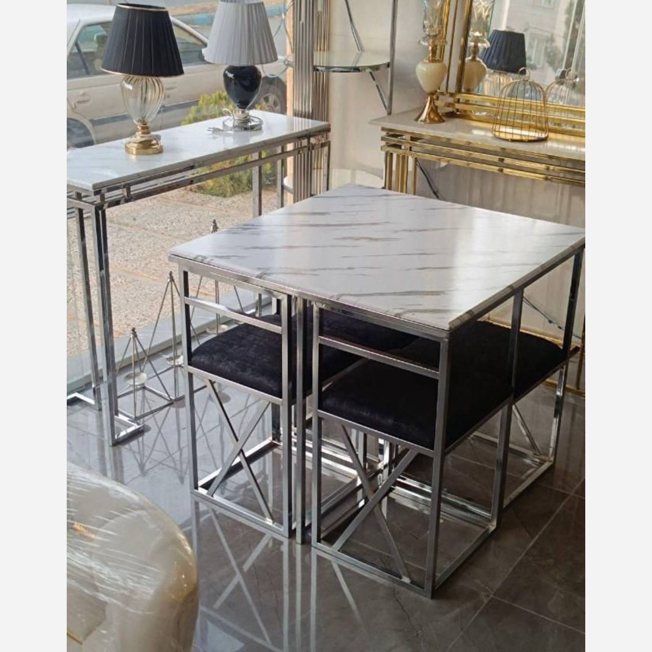 میز ناهار خوری 4 نفره کمجا طلایی رویه مشکی طلایی رویه سفید رویه و نشیمن رنگ مشکی و سفید و کرم و طوسی داریم