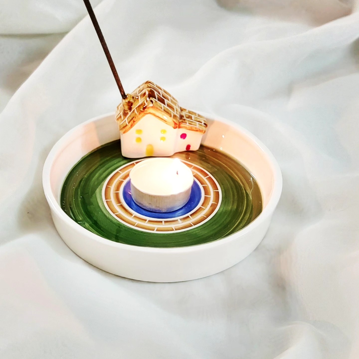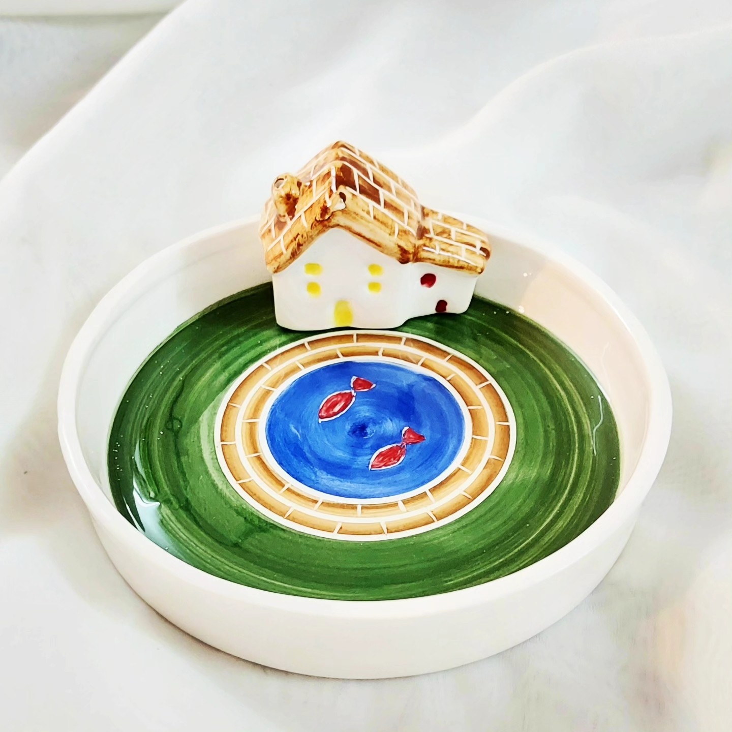 جاعودی سرامیکی حوض ماهی و خونه قابل شستشو می باشد. قطر بشقاب 14 سانت است. تکنیک کار:نقاشی زیر لعابی است.