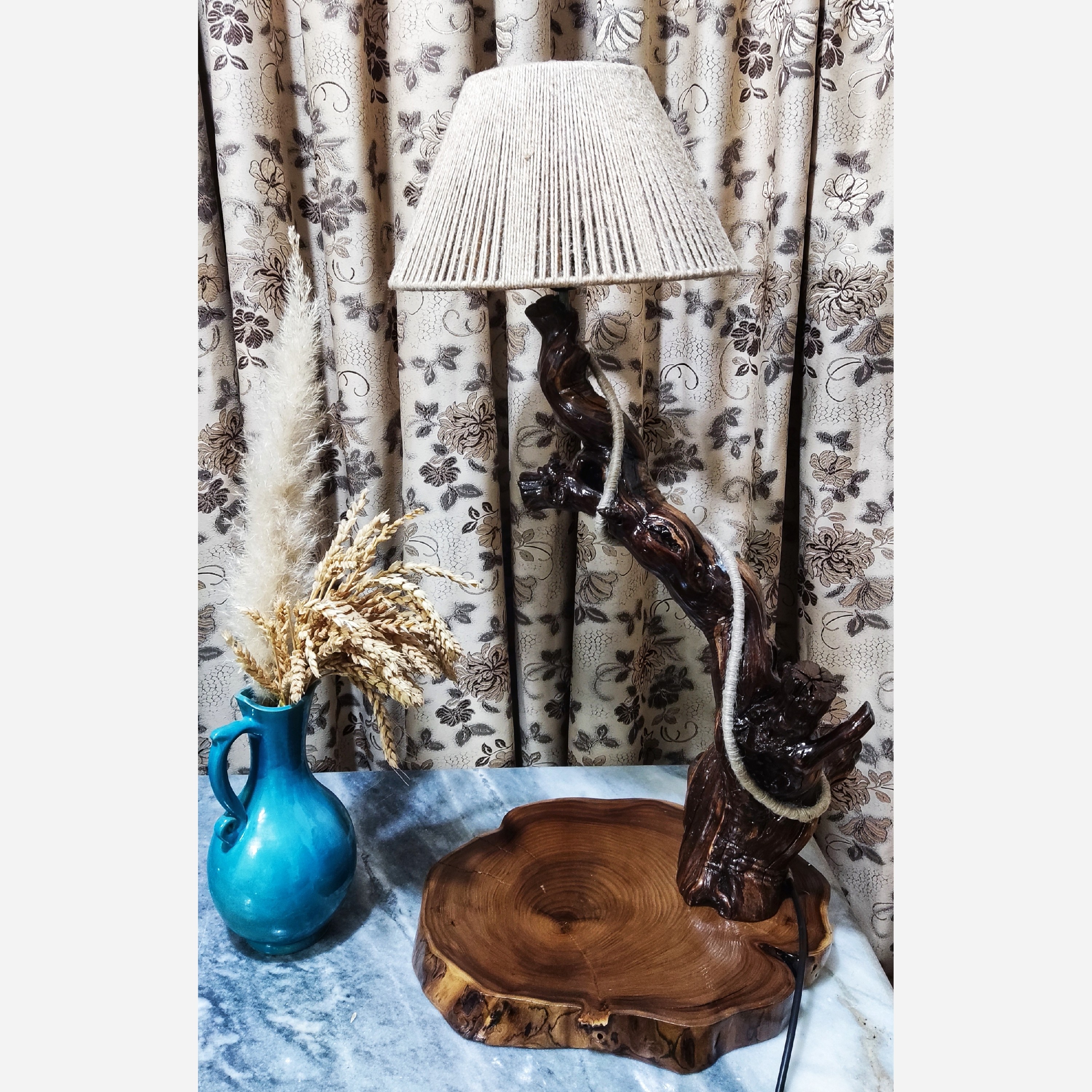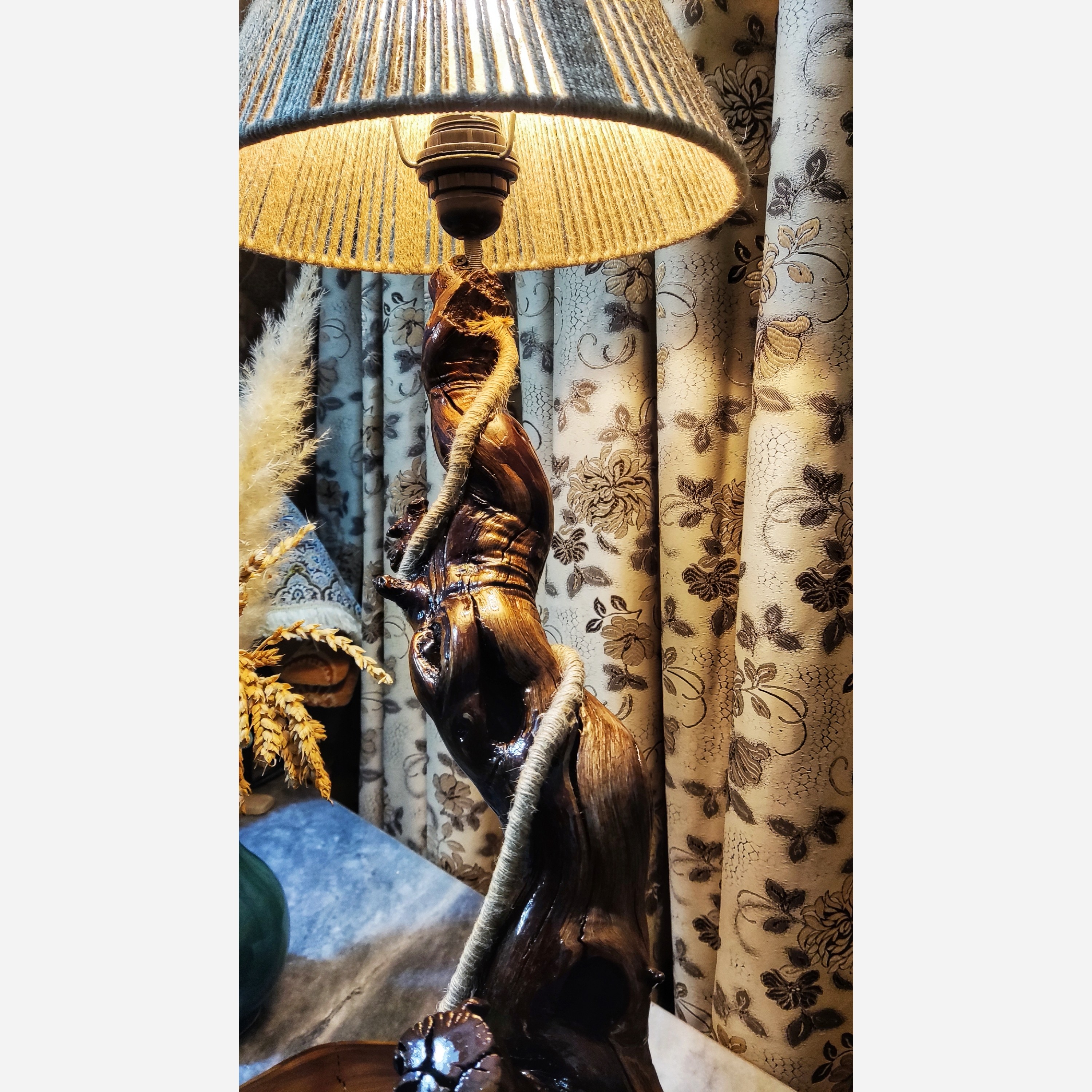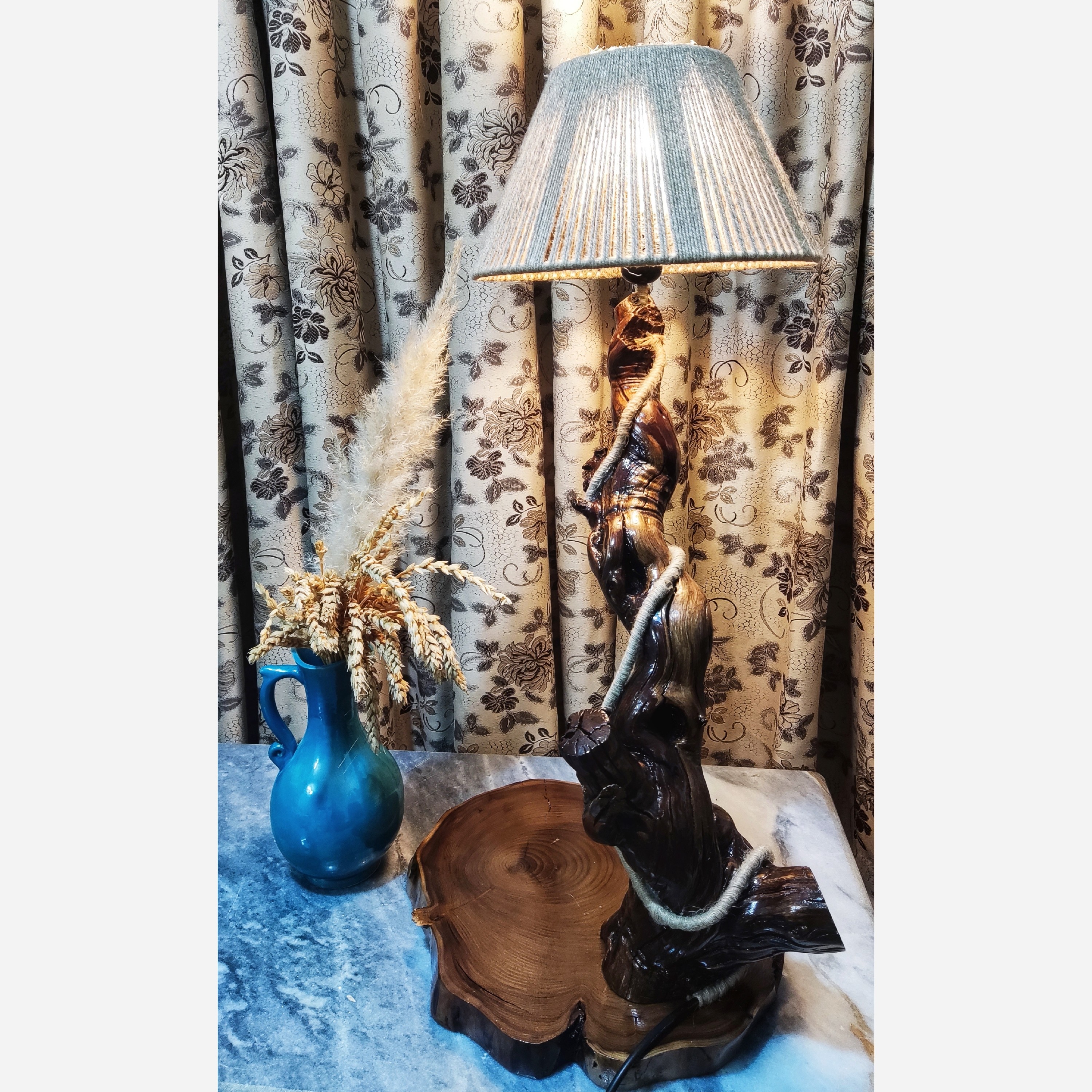 آباژور چوبی روستیک 🟢 جنس بدنه ی این آباژور با بافت و طراحی منحصر به فرد چوب انگور که حالت طبیعی آن حفظ شده است. 🟢پایه ی این آباژور ساخته شده از چوب سنجد 🟢شید آباژور با بدنه ای مستحکم و بافته شده از نخ کنفی 🟢کار سیلر کیلر شده و سطحی براق و درخشنده دارد 🟢 دارای سرپیچ استاندارد گریف دار که مناسب برای نصب انواع شید میباشد 🟢 طول کلی کابل 3 متر و دارای کلید قطع و وصل با دوشاخه ی استاندارد میباشد