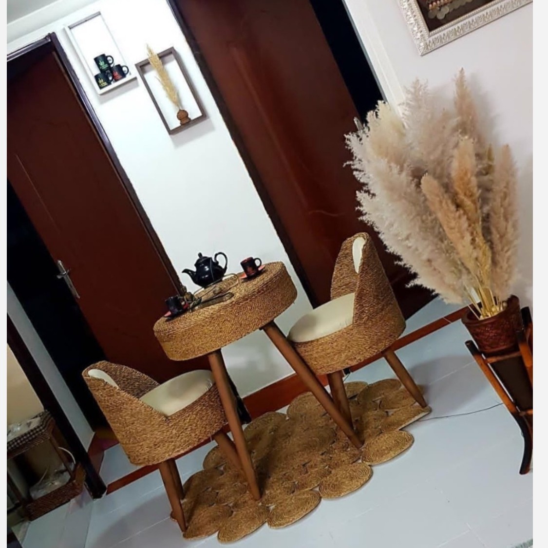 نهار خوری دو نفره حصیری چوبی . میز قطر 70 سانت . صندلی ها قطر 50 سانت .. امکان سفارش تعداد بالاتر و میز سایز دلخواه وجود دارد . رنگ پارچه قابل انتخاب است بدون تغییر در هزینه . رنگ حصیر خام، نسکافه روشن و قهوه ای تیره قابل انجام است . حصیر قهوه ای تیره 50 تومن گرونتره .