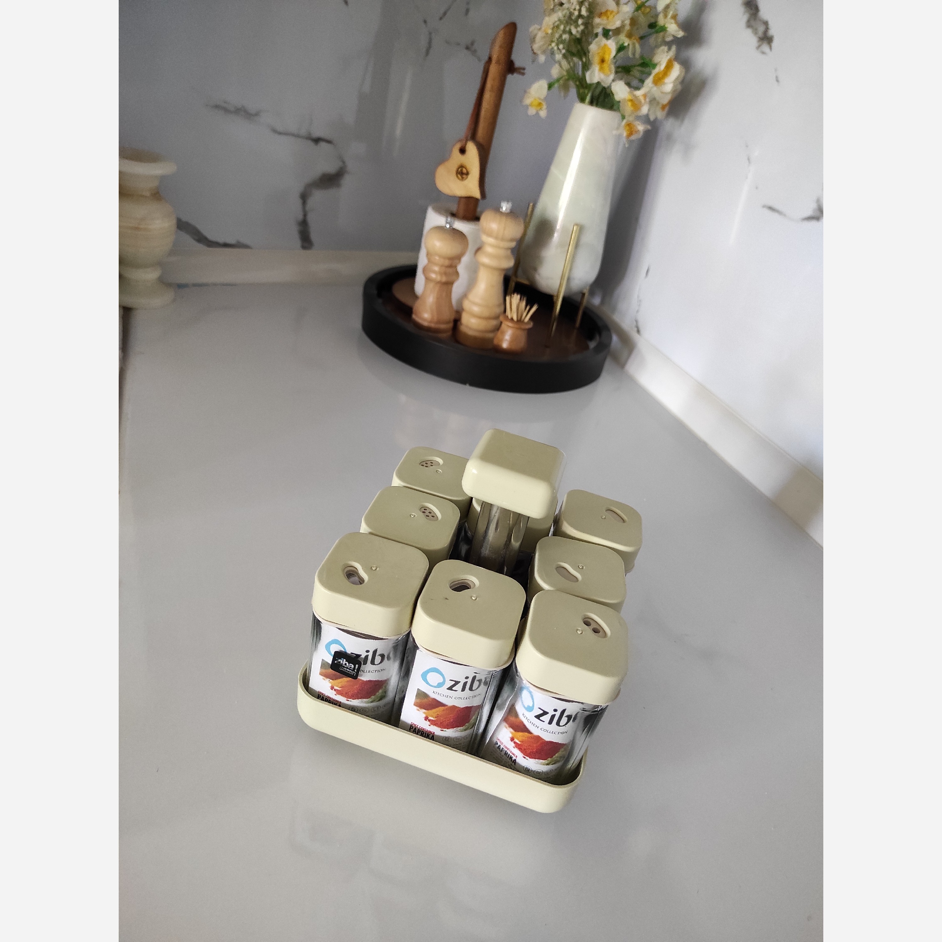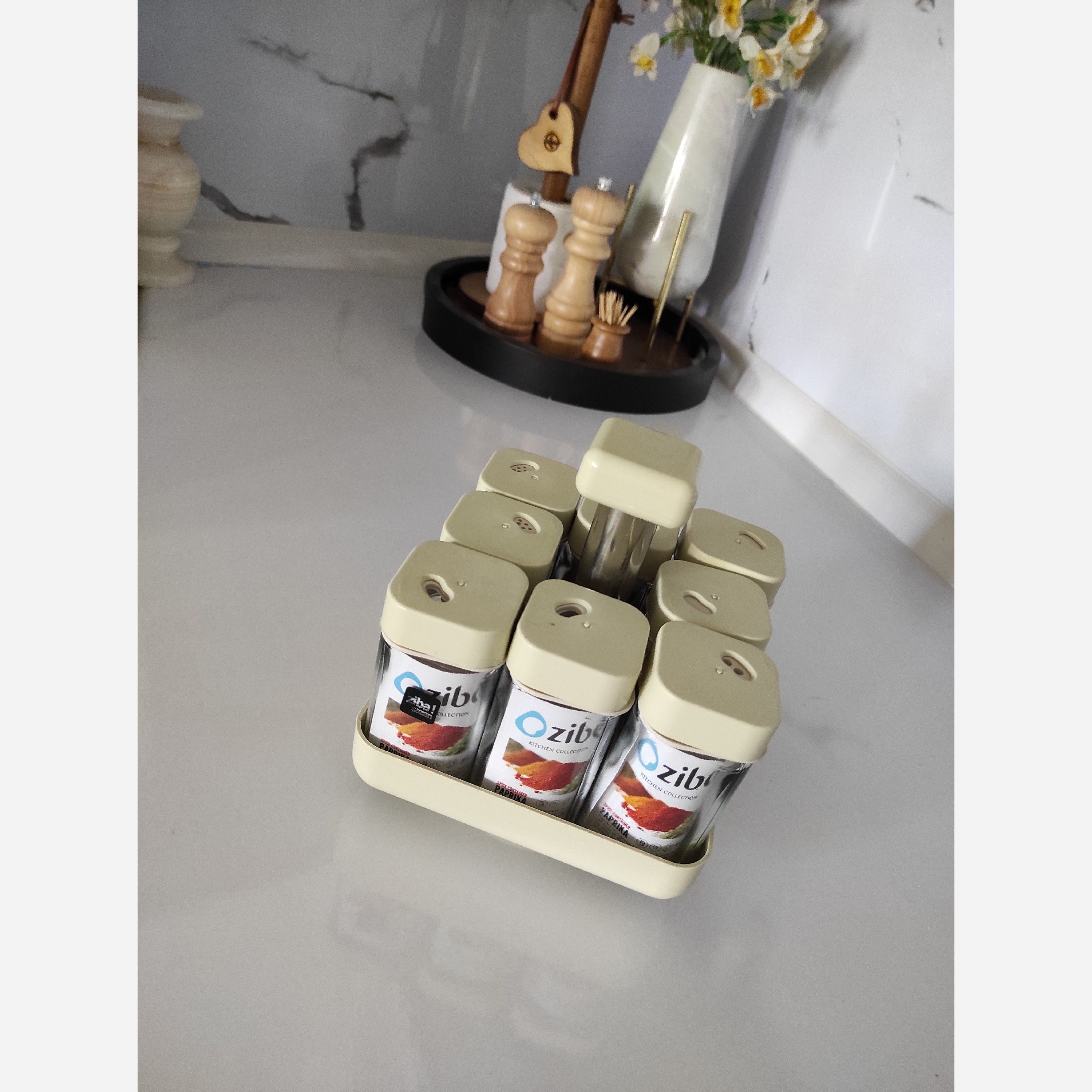 دارای 8 عدد شیشه ادویه پایه گردان قابلیت گزاشتن روی میز به صورت یکپارچه و استفاده جداگانه