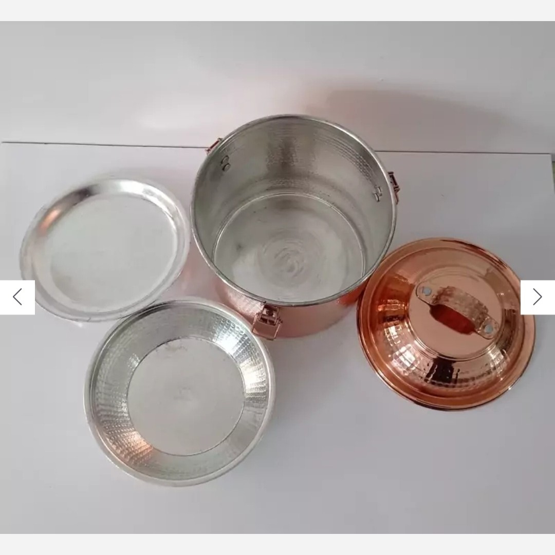 این ظرف مسی مخصوص غذا برای بیرون بری میباشد. ظرف از جنس مس و دارای یک ظرف برا خورشت یا سالاد و یک بشقاب کوچک و درب میباشد که توسط سه قفل فلزی مسی رنگ کاملا محکم میشه تا غذا به بیرون از منزل برسد.داخل ظرف قلع شده است و بیرون ظرف نانو شده است. کیفیت کار بالاست و دارای طراحی بسیار مبتکرانه است.