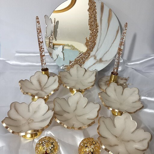 ست هفت سین شامل6پیاله آینه و دو شمعدان جنس رزین قطر پیاله ها15سانت