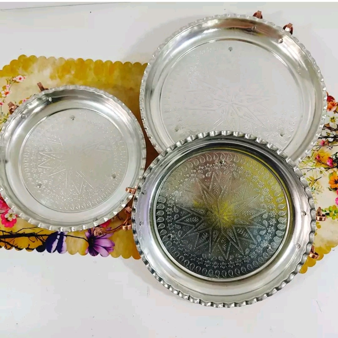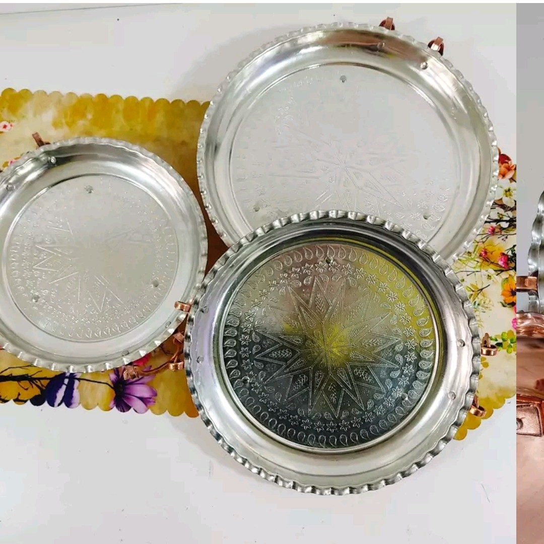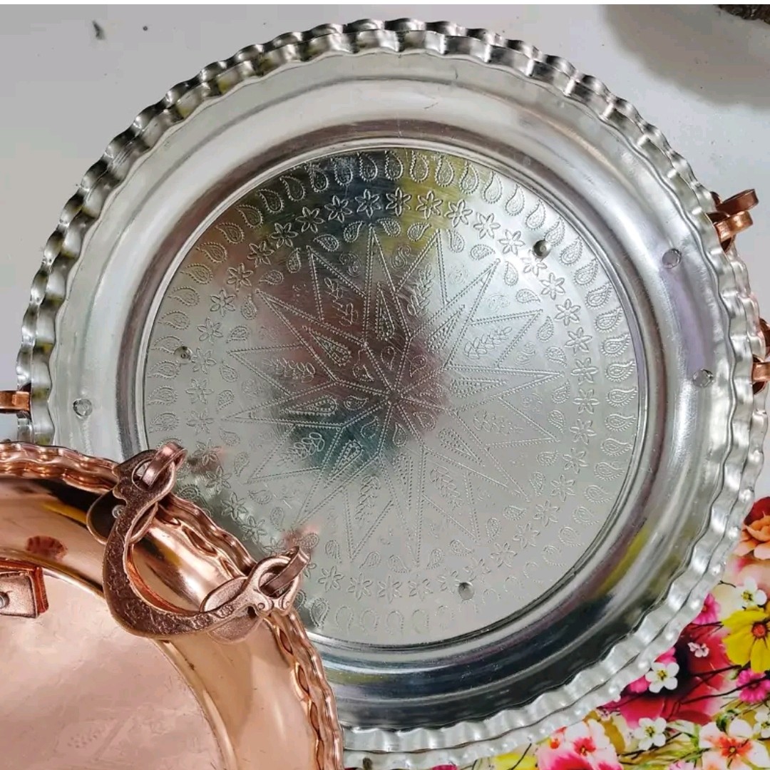 سینی یا مجمع مسی داخل طرح بسیار زیبا تمام مسی داخل قلع کاری شده و بیرون مسی است که بیرون محصول نانو شده که رنگ ثابت بماند و همیشه شفاف و براق باشد محصول دو دسته و سه پایه دارد در چند سایز موجود است