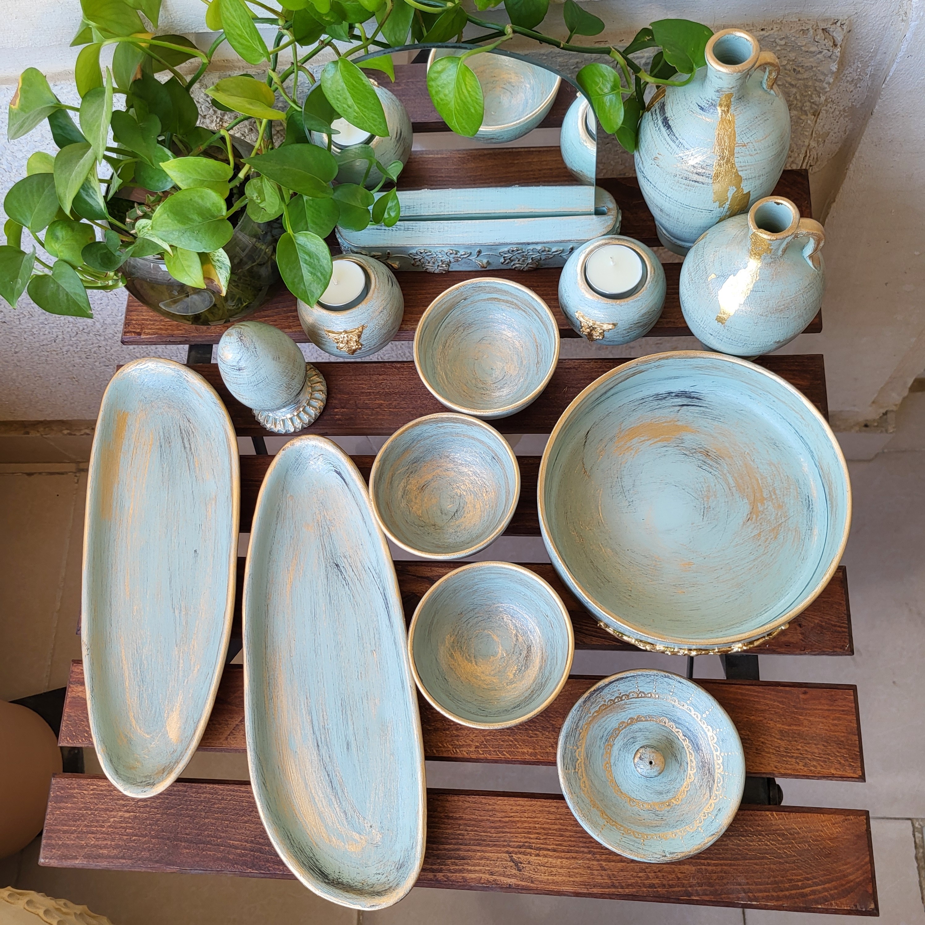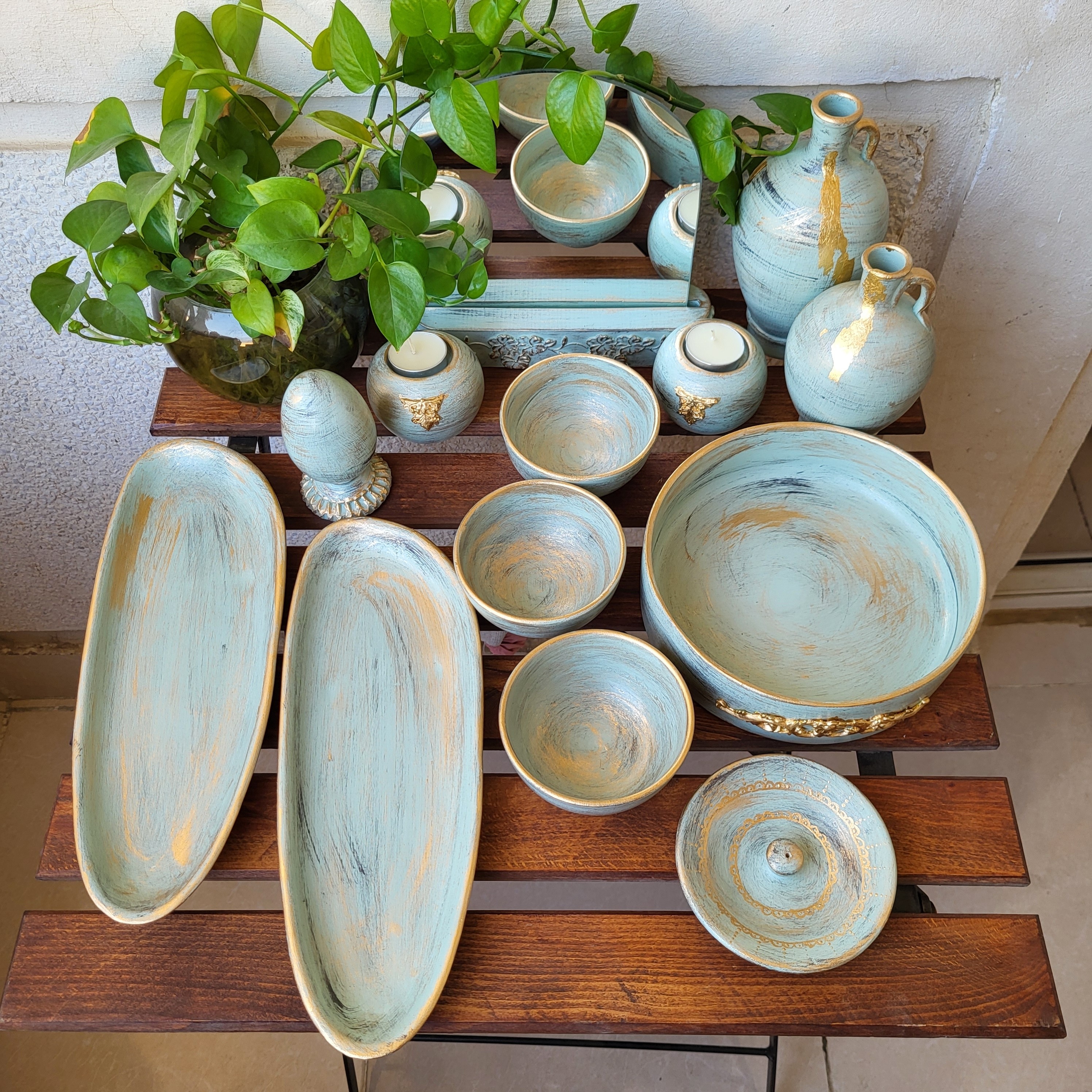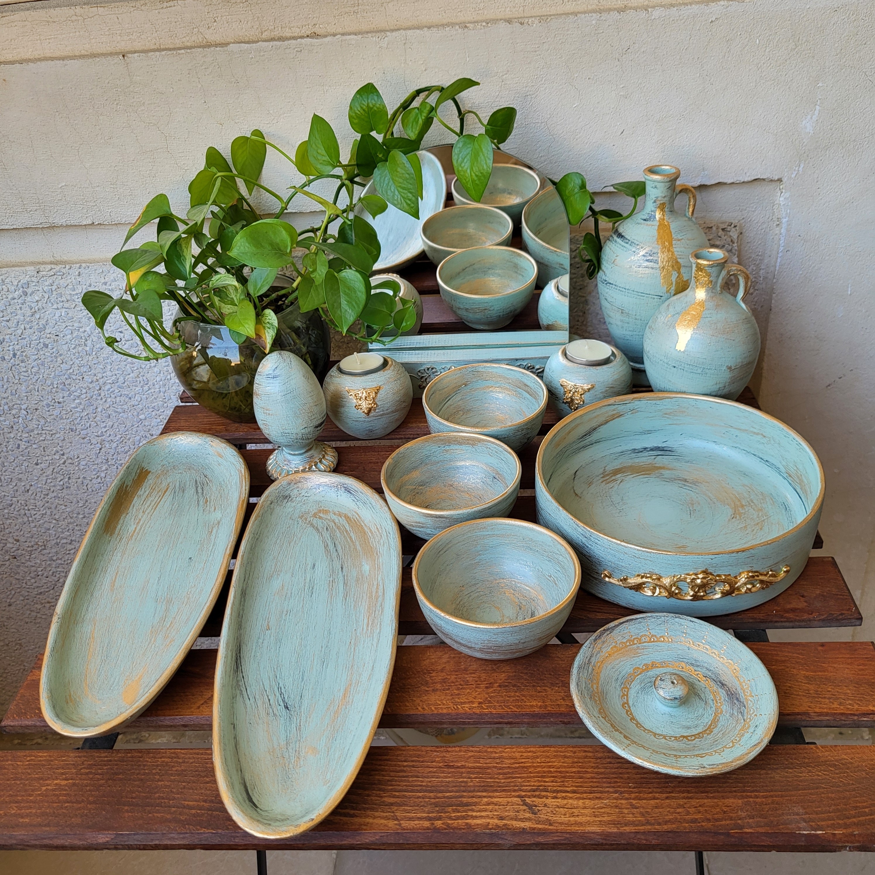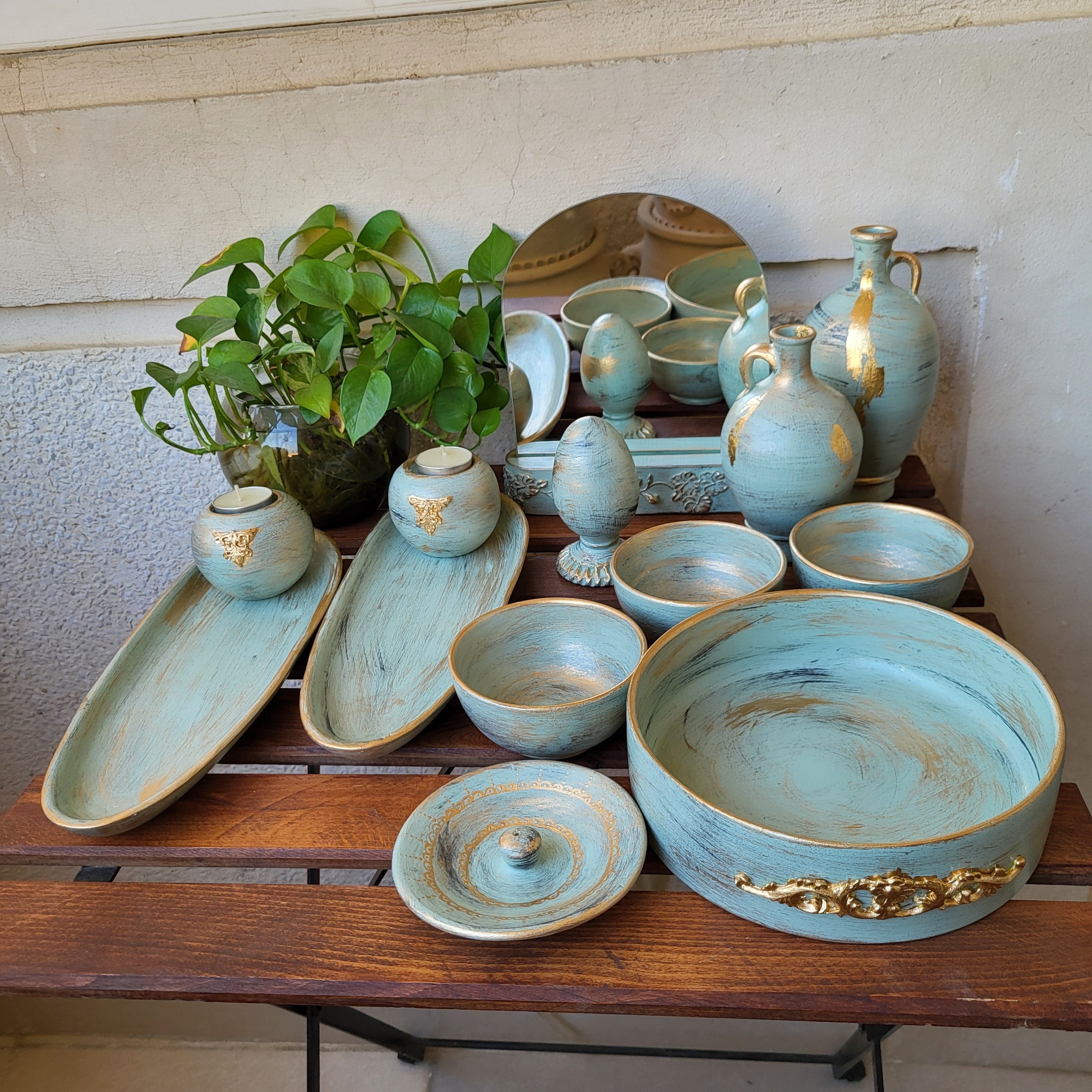 هفت سین پتینه سبزآبی و طلای دودی دارای دکوزه دوسینی مدرن یک کاسه بزرگ سه کاسه وآینه ودو شمعدان و تخم مرغ و جاعودی مبلمونسرا مدل 259017