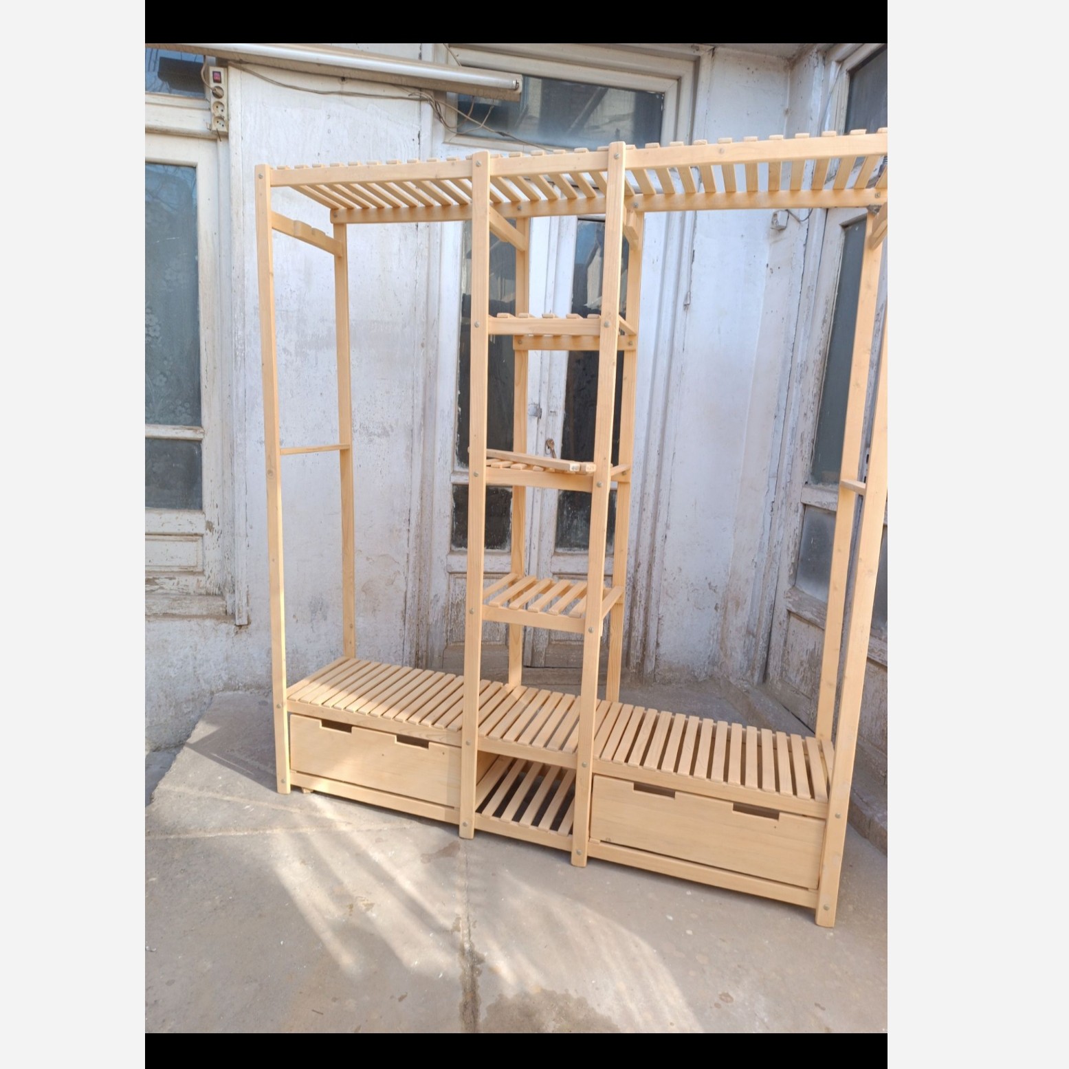 رگال لباس چوبی دواویز و قفسه وسط دارای دو کشو کاربردی طراحی و ساخت انحصاری زیبا و خاص بدون نمونه مشابه دربازار ارتفاع یا عمق کشو16سانت طول هر قسمت 57 سانت کشو ها بدون ریل و غلطک و حرکت روان چوب روی چوب کپی برداری ممنوع