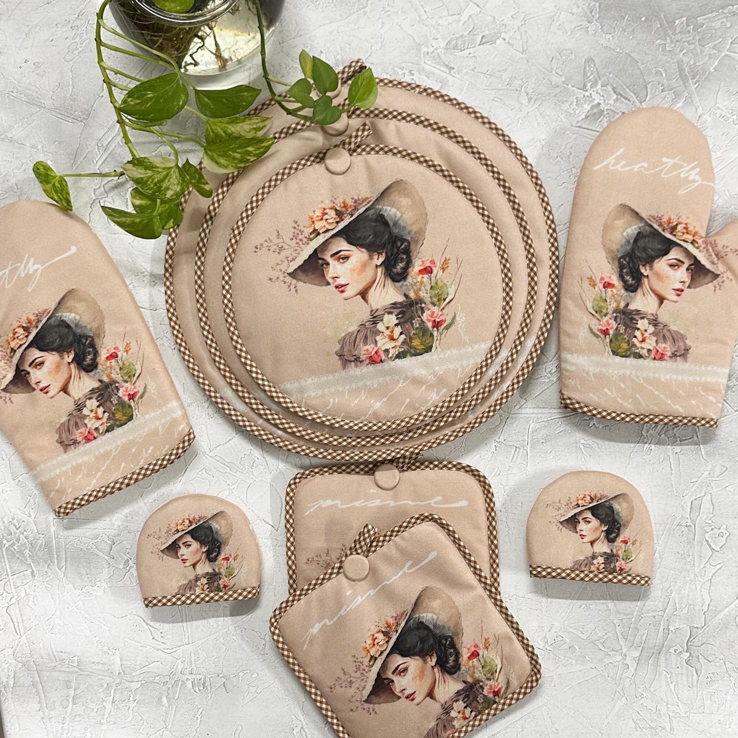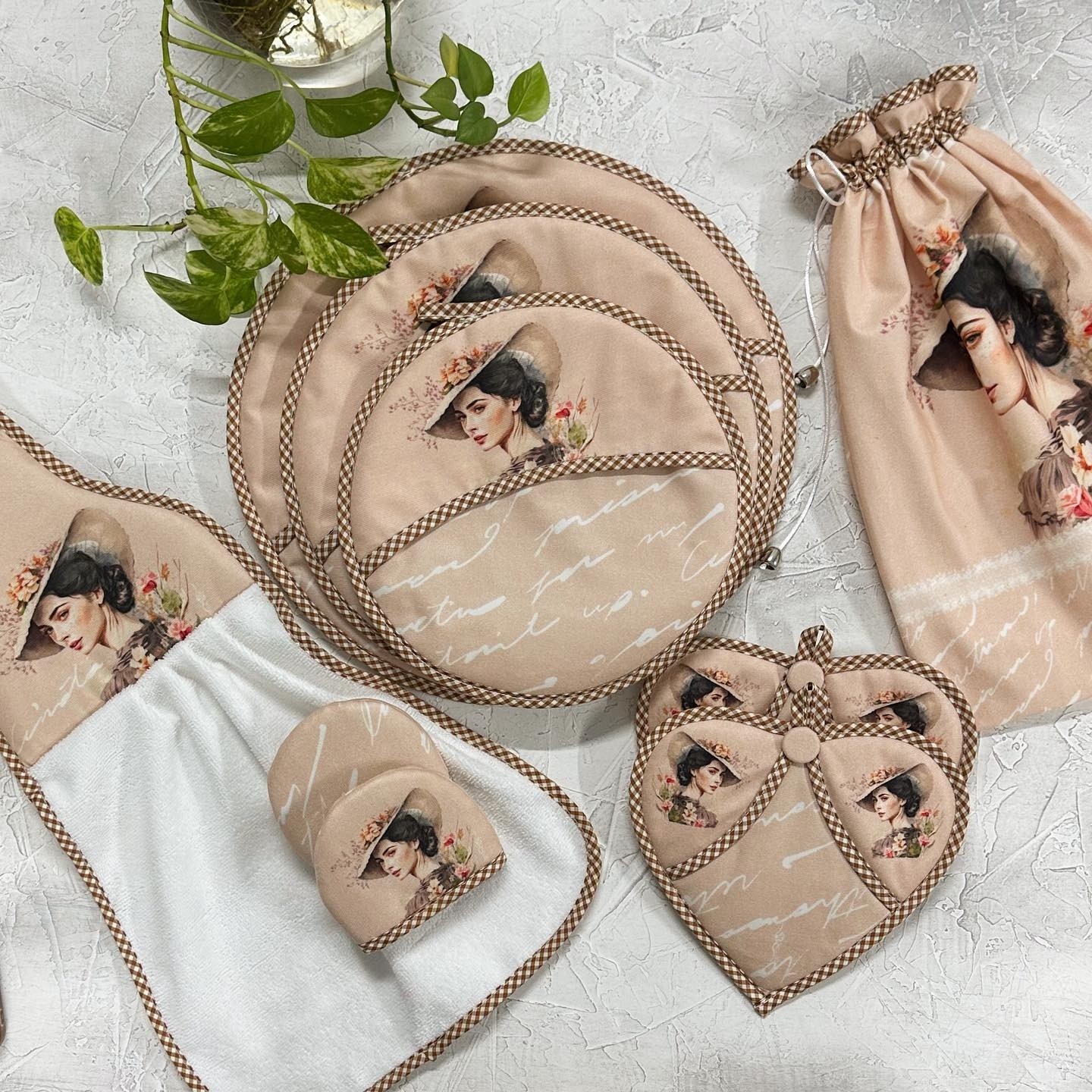 سلام خدمت مشتریان عزیز ست آشپزخانه 15 تکه مخمل فاطیماهوم که به دست بهترین طراحان ایران طراحی شده و به دست بهترین کدبانوهای ایرانی دوخته شده رو مهمون خونه های خودتون کنید. سرویس آشپزخانه پارچه ای فاطیماهوم از 15 تکه کاربردی شامل:یک عدد نمگیر، یک عددپیشبند، یک جفت دستکش فر، یک جفت دستگیره قلبی، یک جفت دستگیره مربع، یک جفت دستگیره چدنی، ست دمکنی سه تایی،یک عددکیسه سبزی و یک عدد حوله آشپزخانه می باشد. ست 17 تکه شامل یک عدد دستمال تنظیف و یک عدد سفره پاک کن هم میشود. تکه های اضافه هم میتونید ست با سرویستون سفارش بدین، مثل کاورقابلمه، ساک نان، باکس نان، زیرقابلمه ای و .... طراحی اختصاصی محصول مطابق تمام سلیقه ها و دیزاین های مختلف آشپزخونه تو مجموعه ما انجام میشه. این کار از مخمل نسوز که در کارخونه ما تولید و چاپ میشه تولید شده. هر سوالی داشتید از من بپرسید.