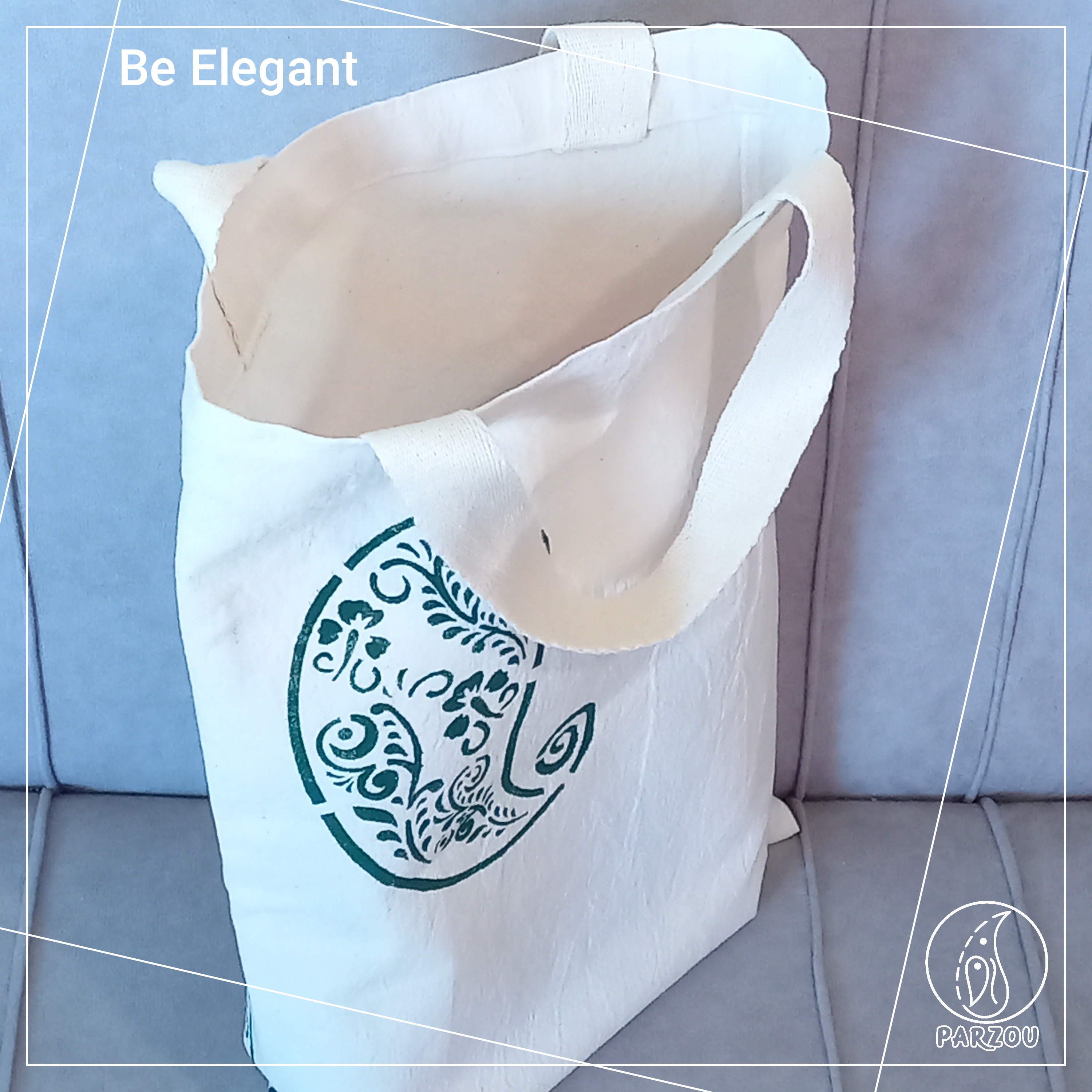 ساک پارچه ای ساده دستدوز با پارچه متقال پنبه ای. نقاشی با شابلون و رنگ مخصوص پارچه سبز یشمی. بند کنفی. دوستدار محیط زیست. خاص و مقاوم.