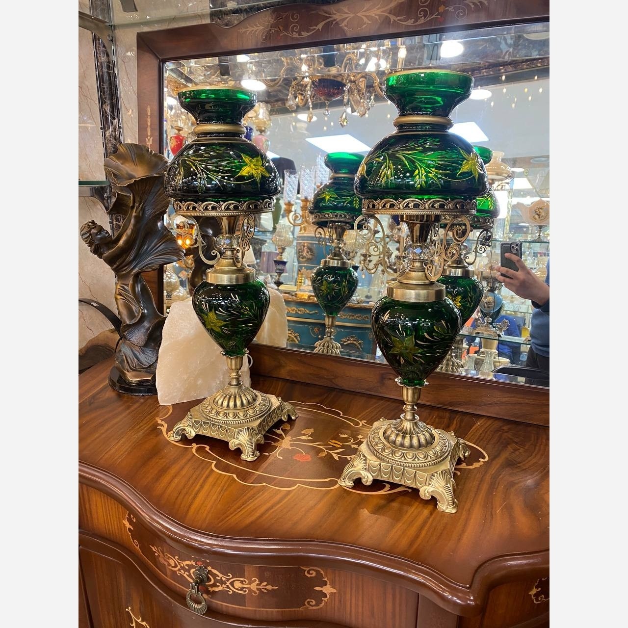 آباژور رومیزی لمپا لنتر چراغ نفتی رومیزی تراش دار پایه برنز قالپاقی سبز محرمات شمعدان مبلمونسرا مدل 231147