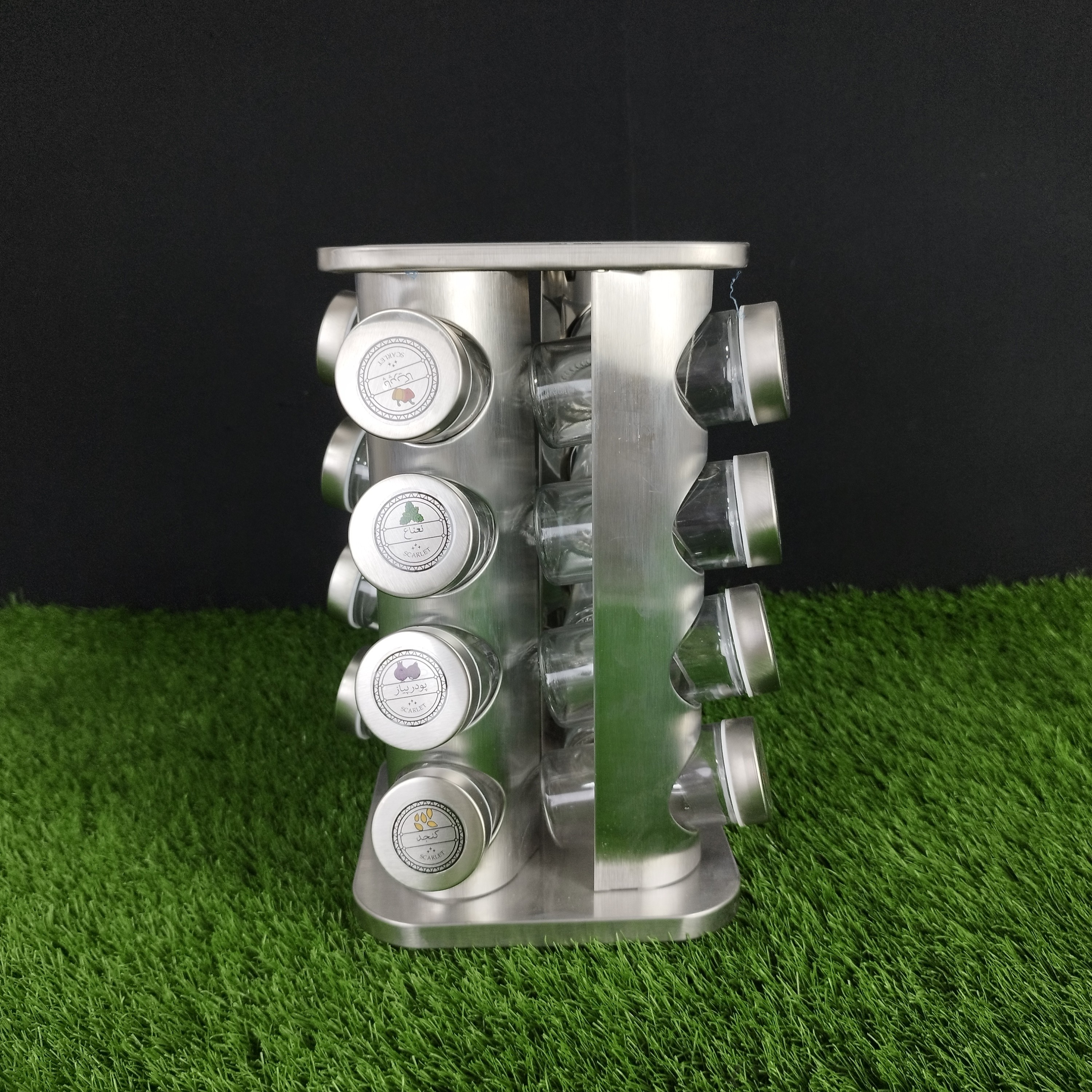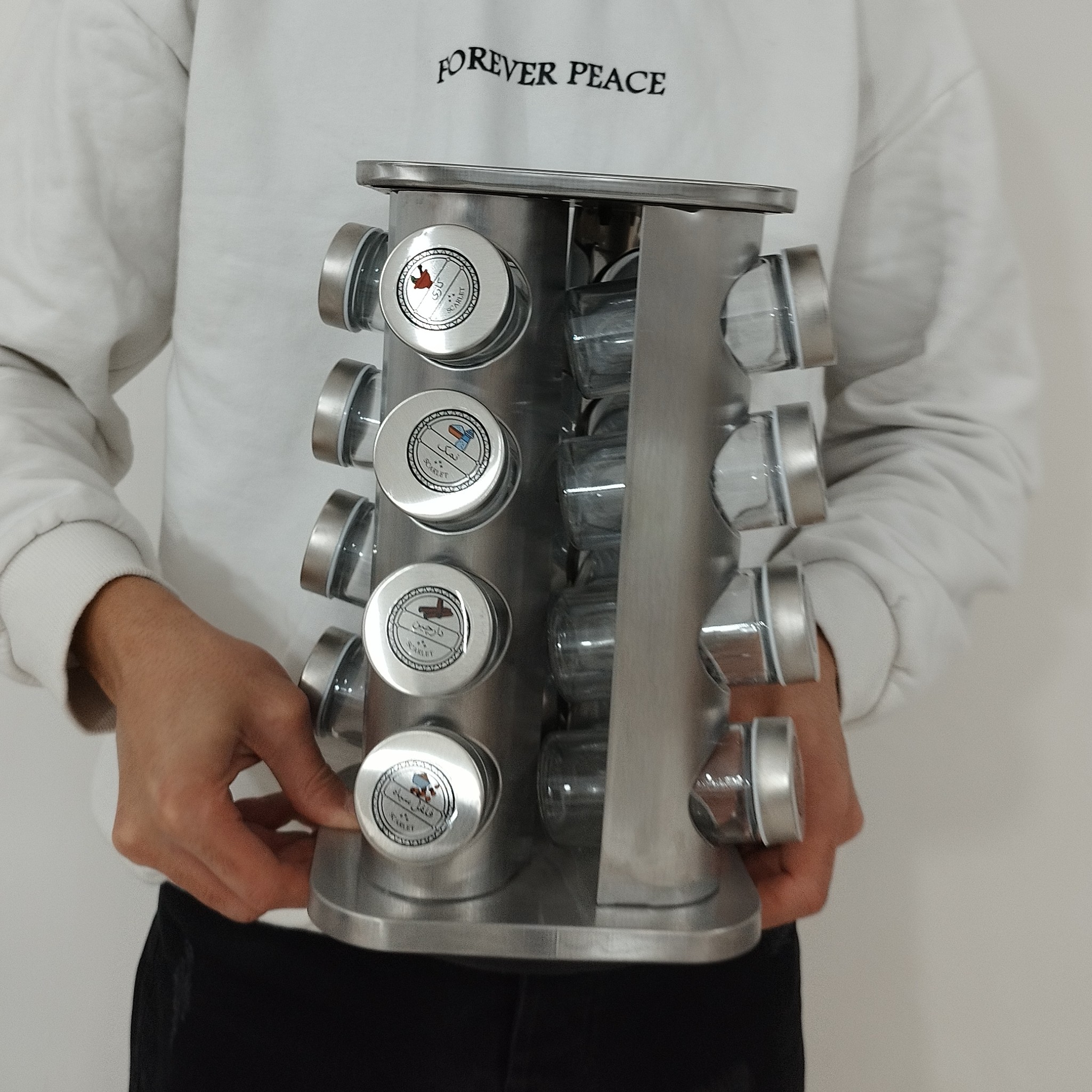 آشپزخانه ادویه گردان از جنس استنلس استیل 16 شیشه ای برای میز آشپزخانه تقویت کنید. این قفسه چرخان ادویه ساخته شده از فولاد ضد زنگ، 16 شیشه را در خود جای می دهد که پر از ادویه جات پر مصرف است. کوزه های موجود در سازمان دهنده ادویه ها از شیشه با درپوش های سفیددارای رویه های الک تر برای پخش آسان و بدون آشفتگی هنگام چاشنی غذا هستند. ادویه های موجود در قفسه ادویه شما ممکن است شامل ریحان، مرزنجوش، نمک سیر، گشنیز، رزماری، پونه کوهی و غیره باشد. ریختن بدون آشفتگی: هر شیشه در این سازمان دهنده چاشنی دارای یک کلاه الک پلاستیکی برای توزیع کنترل شده است. ساخت ایران