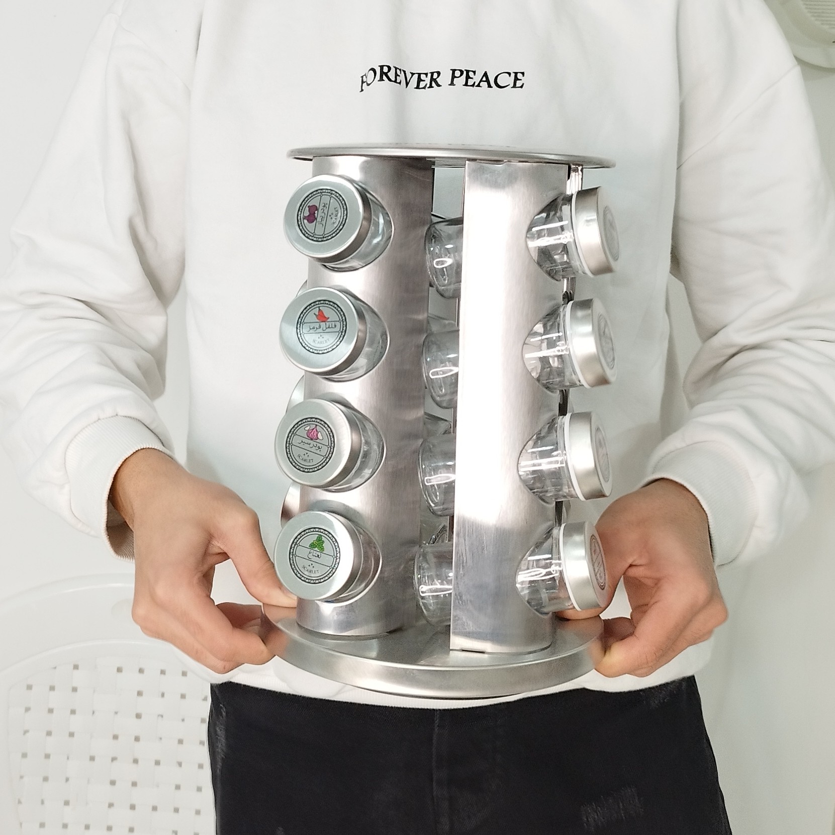 آشپزخانه ادویه گردان از جنس استنلس استیل 16 شیشه ای برای میز آشپزخانه تقویت کنید. این قفسه چرخان ادویه ساخته شده از فولاد ضد زنگ، 16 شیشه را در خود جای می دهد که پر از ادویه جات پر مصرف است. کوزه های موجود در سازمان دهنده ادویه ها از شیشه با درپوش های سفیددارای رویه های الک تر برای پخش آسان و بدون آشفتگی هنگام چاشنی غذا هستند. ادویه های موجود در قفسه ادویه شما ممکن است شامل ریحان، مرزنجوش، نمک سیر، گشنیز، رزماری، پونه کوهی و غیره باشد. ریختن بدون آشفتگی: هر شیشه در این سازمان دهنده چاشنی دارای یک کلاه الک پلاستیکی برای توزیع کنترل شده است. ساخت ایران